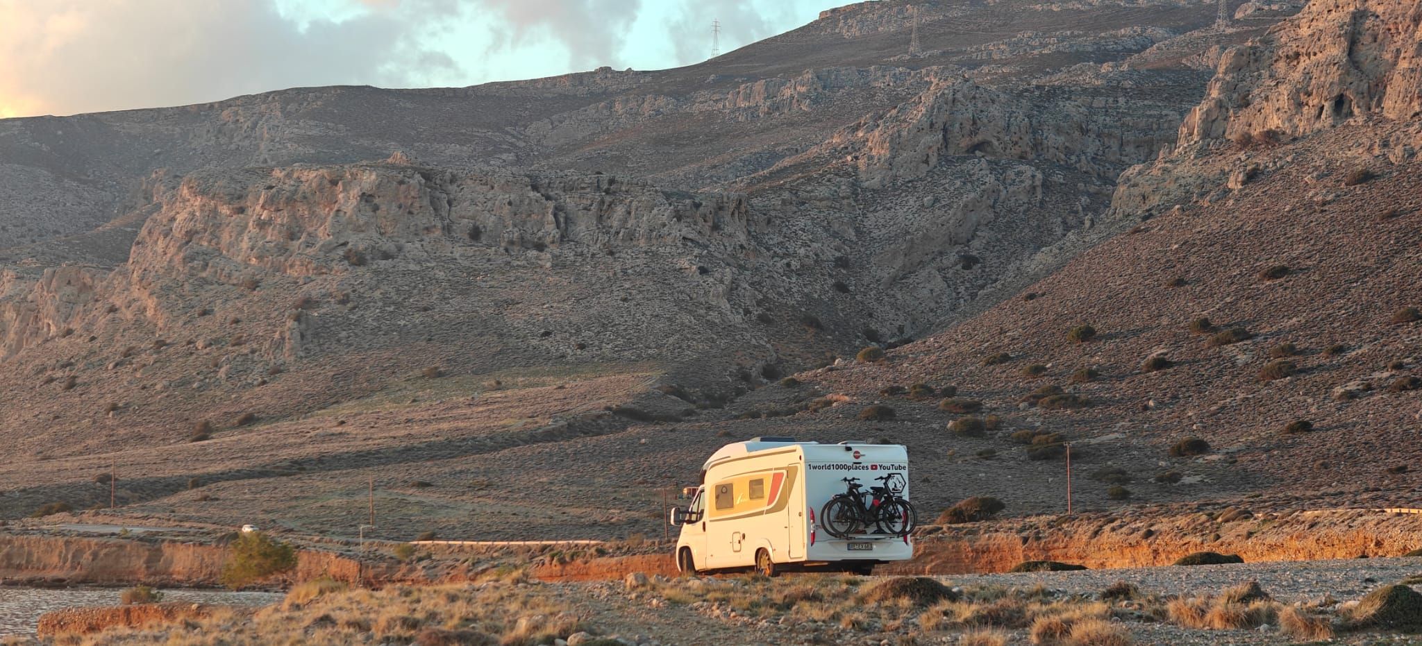 Also hieß es gegen Mittag alles sichern und los geht es. Die Fahrt am Berg entlang ist traumhaft schön und macht richtig viel Spaß. Den Stellplatz sehen wir schon von weitem und können auf einfachen und schnellen Weg die richtige Position beziehen. OK der Platz ist wirklich schief und schräg, aber wir finden einen Platz der richtig ok ist....der Kühlschrank wird wohl funktionieren was wir dann später merken werden. Wir stehen in Goudouras auf einer Klippe an einem tollen Sandstrand und einer Dusche....was will ein Camper mehr. Heute ist es wirklich windig und wir verziehen uns in den Wagen....der späte Nachmittag wird mit einem grandiosen Sonnenuntergang eingeläutet und wir wissen wieder...alles richtig gemacht