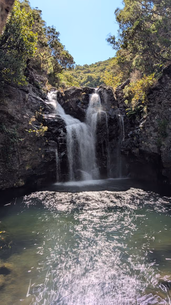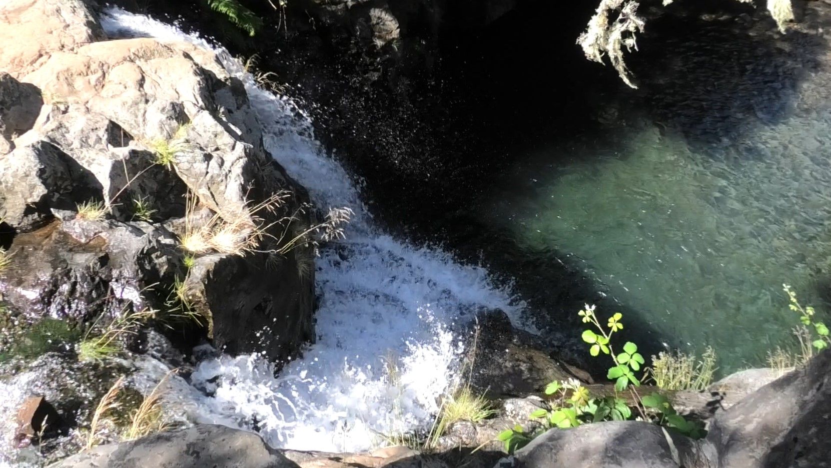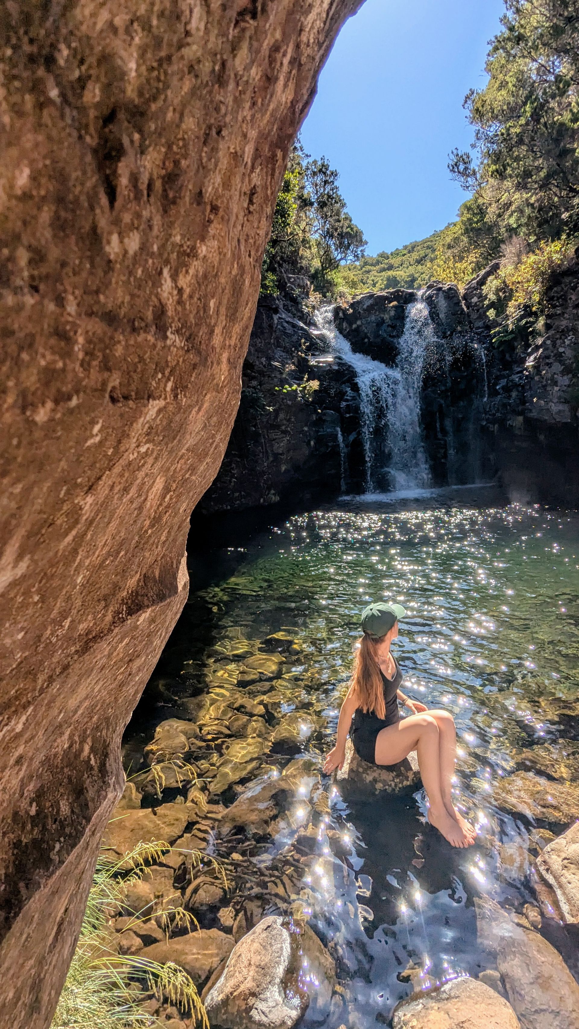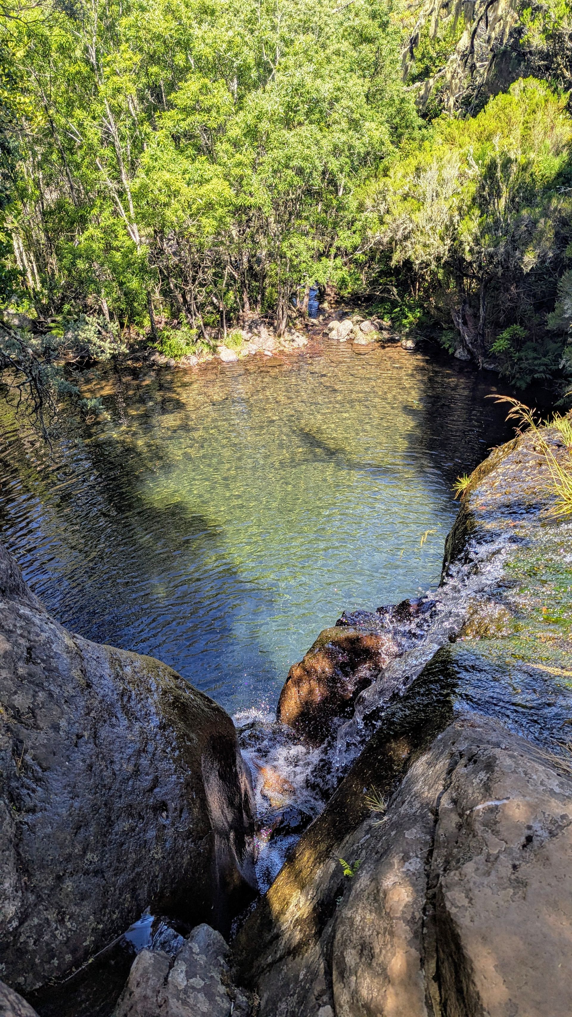 Danach erkunden wir den unteren Teil des Wasserfalls, wo der Bach über einige Felsen in einen weiteren, viel größeren Pool nach unten fließt. Allerdings scheint es keinen Zugang zum unteren Becken zu geben, sonst wären dort mit Sicherheit Touris am oder im Wasser.