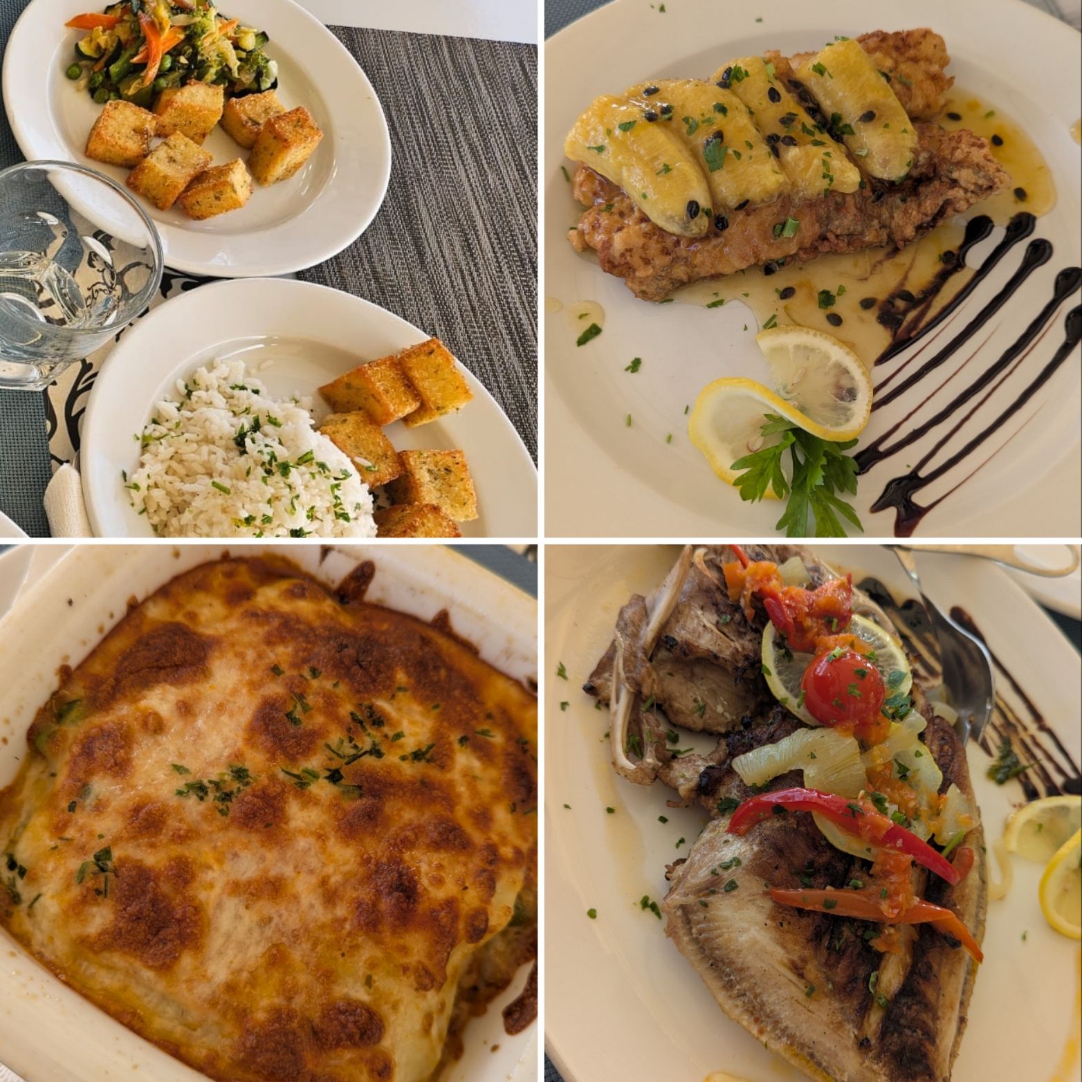 Wir finden einen freien Platz im Restaurant Marina Azul, wo wir uns Fisch & Veggielasagne schmecken lassen.