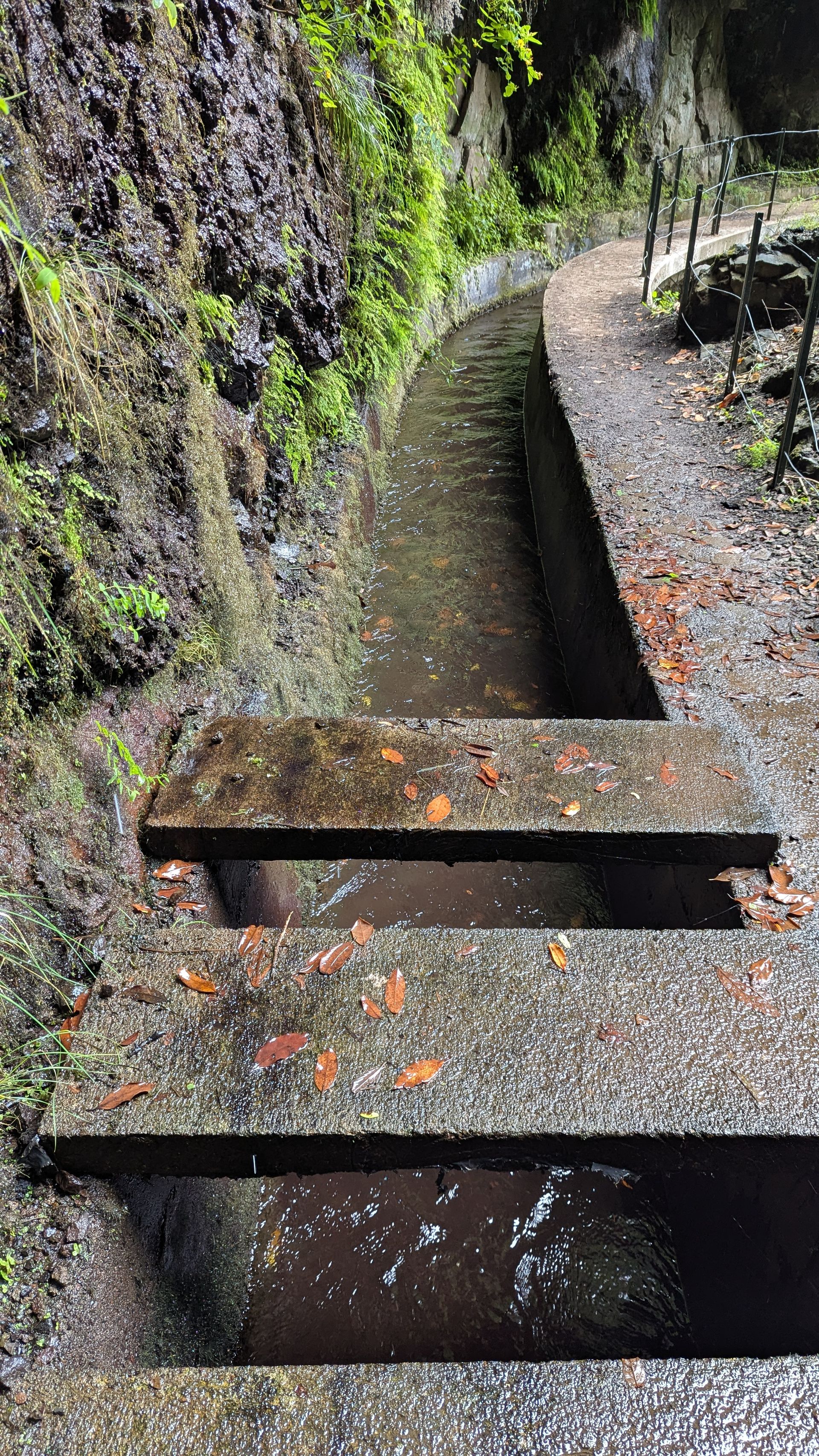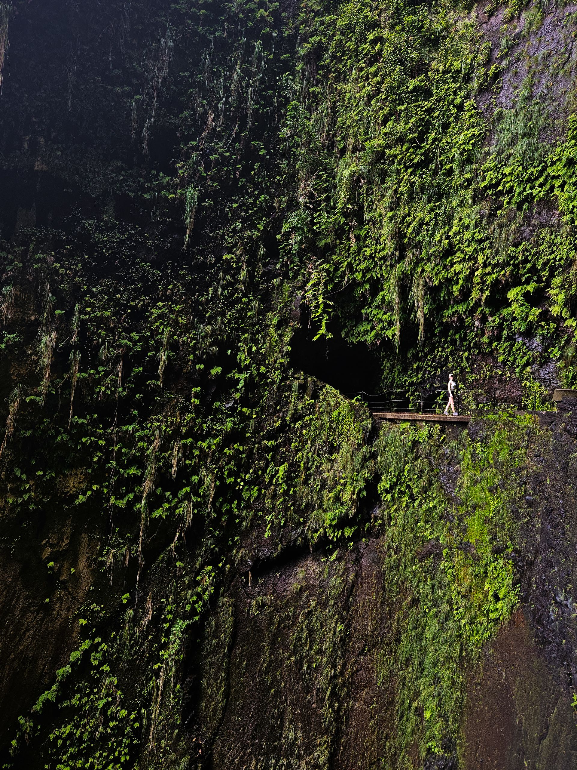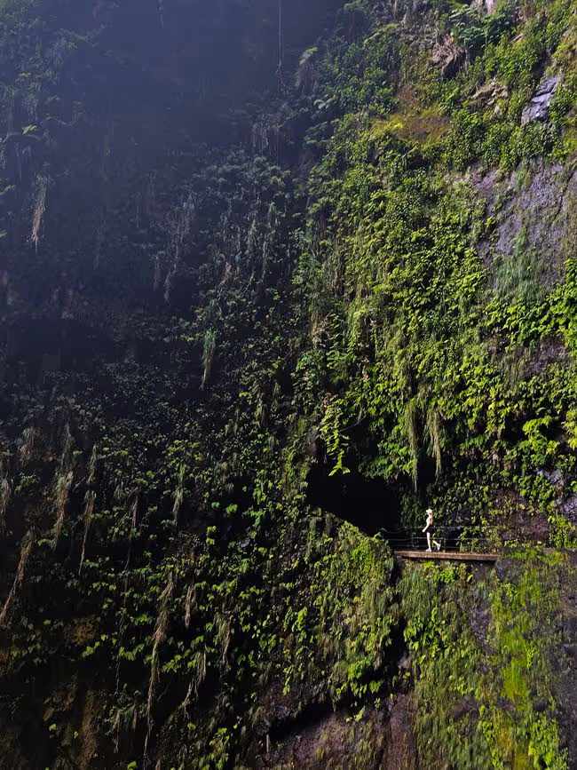 Als wir den Tunnel verlassen, stehen wir in einer riesigen halbrunden Felswand, die komplett mit Moos und grünen Pflanze zugewuchert ist. Überall tropft es herunter, Wasserläufe bahnen sich den Weg nach unten, aber der eigentliche Wasserfall, der in der Mitte der Wand über eine Levadaüberdachung "fallen" soll, ist weitgehend trocken. Hier läuft eher ein Rinnsal über die Überdachung. Als wir darunter stehen kann ich nur sagen, zum Glück führt der Wasserfall kein Wasser. Wir wren wohl vom Spritzwasser klatschnass geworden, denn schon das wenige Wasser reicht aus, um das Gefühl einer Dusche zu haben.