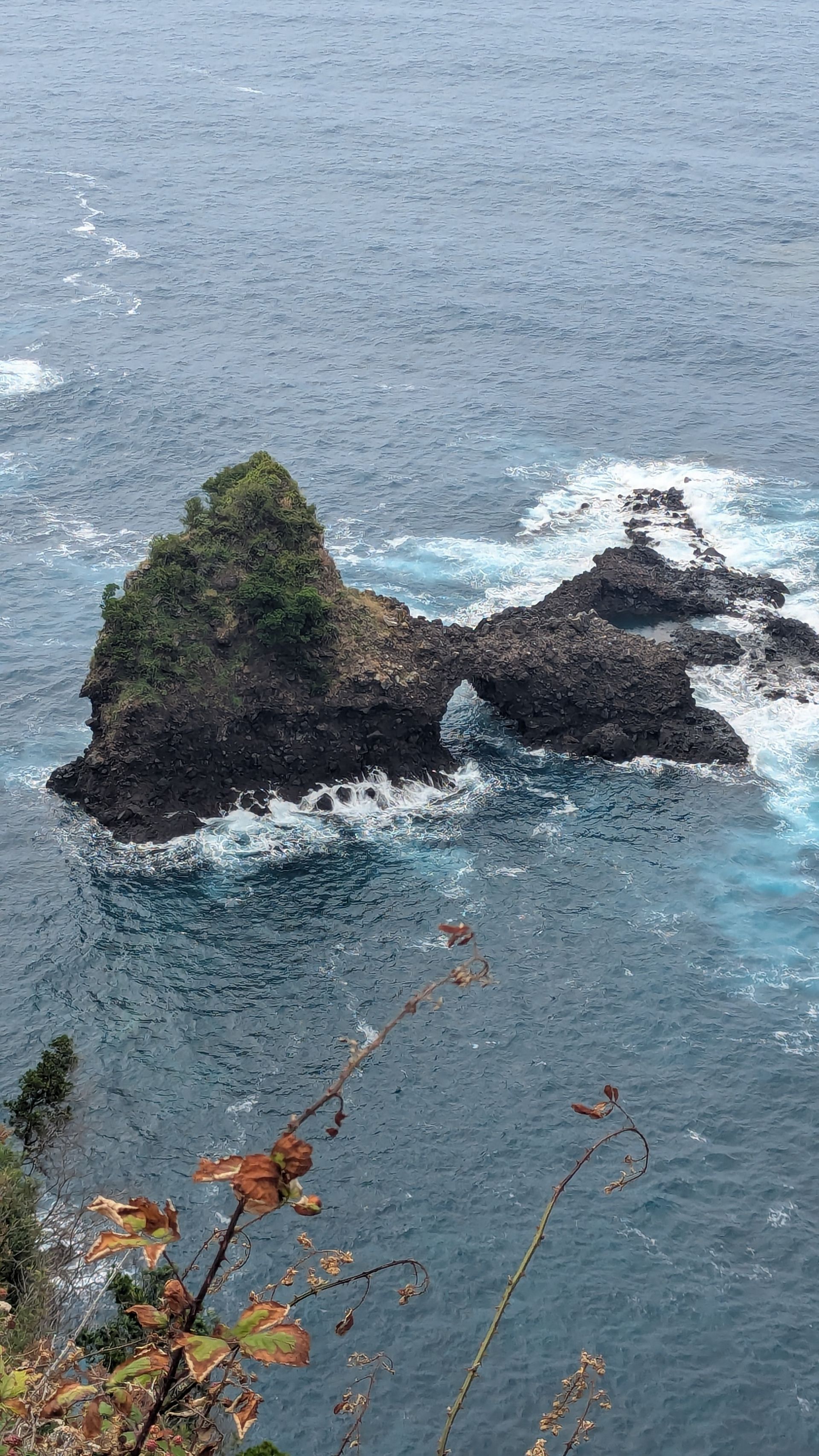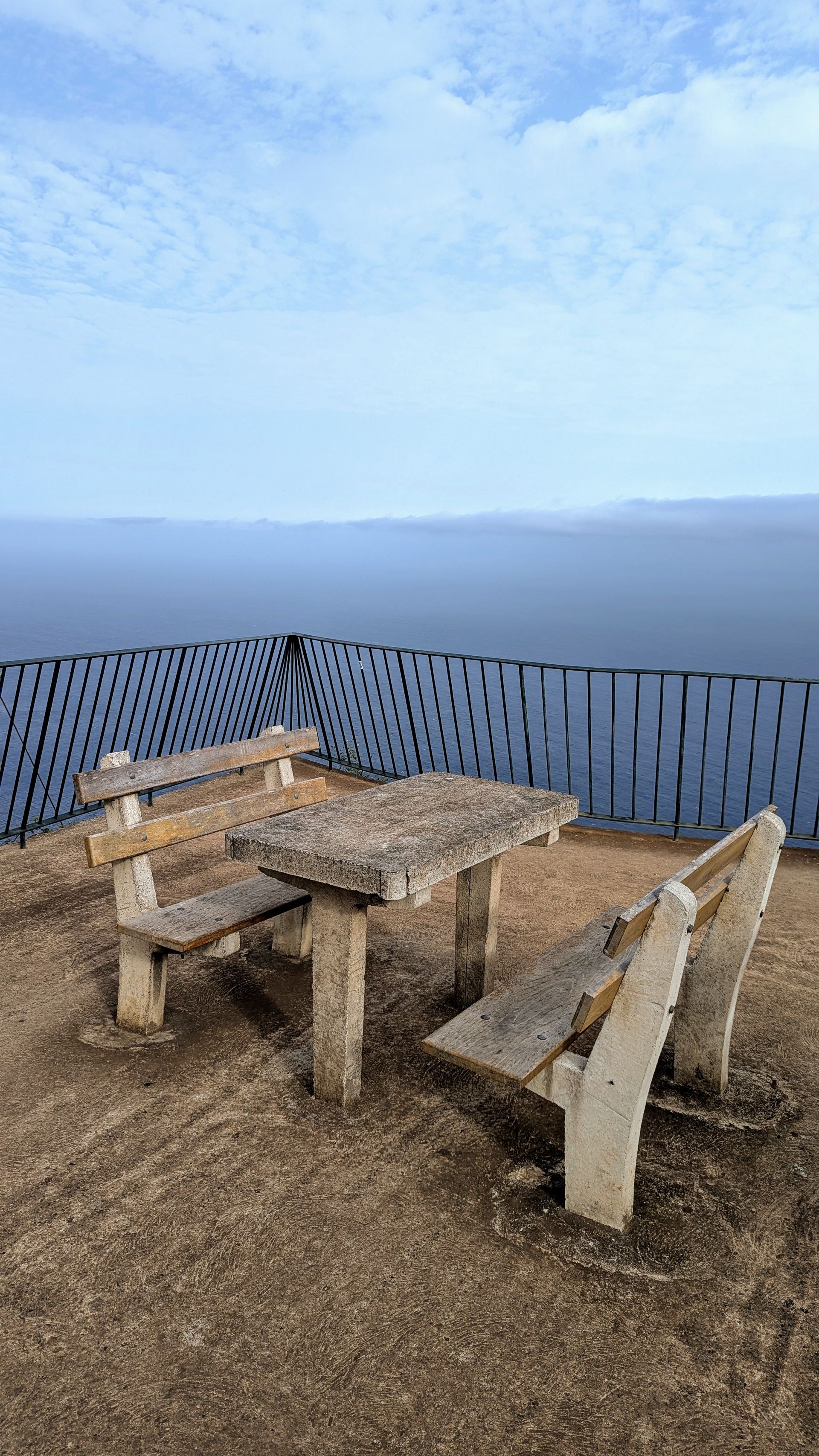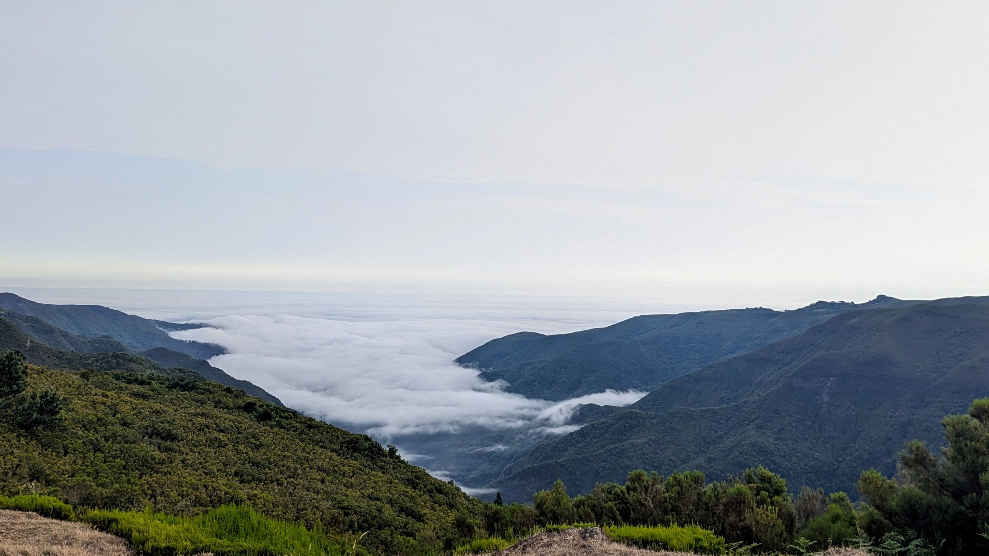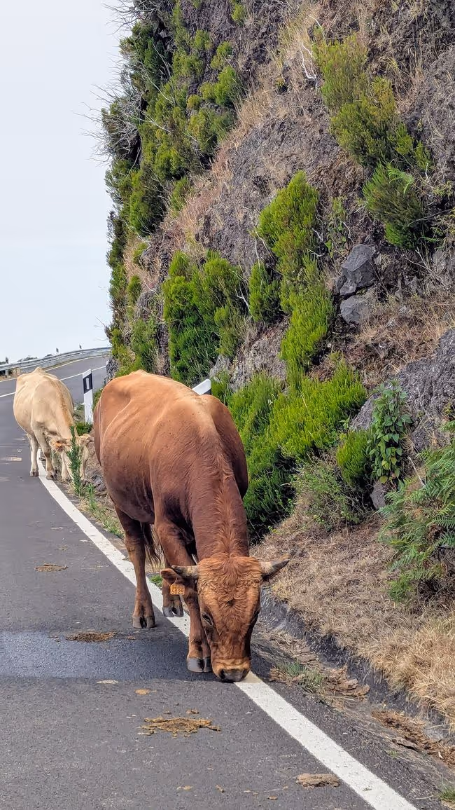 Auf der Hochebene ist es jedenfalls sonnig. Wir fahren an einigen Kühen vorbei, die auf und neben der Straße stehen und stoppen am Miradouro da Fonte do Bispo. Wir können sehen, wie die Wolken vom Meer aus ins Labdesinnere drücken. Wie gestern am Pico haben wir zwei Wolkenschichten: eine oben am Himmel, eine unter uns in den Tälern und schon jetzt ist klar, dass wir wohl heute wieder wenig Sonne sehen werden, wenn wir gleich nach unten ans Meer fahren werden.