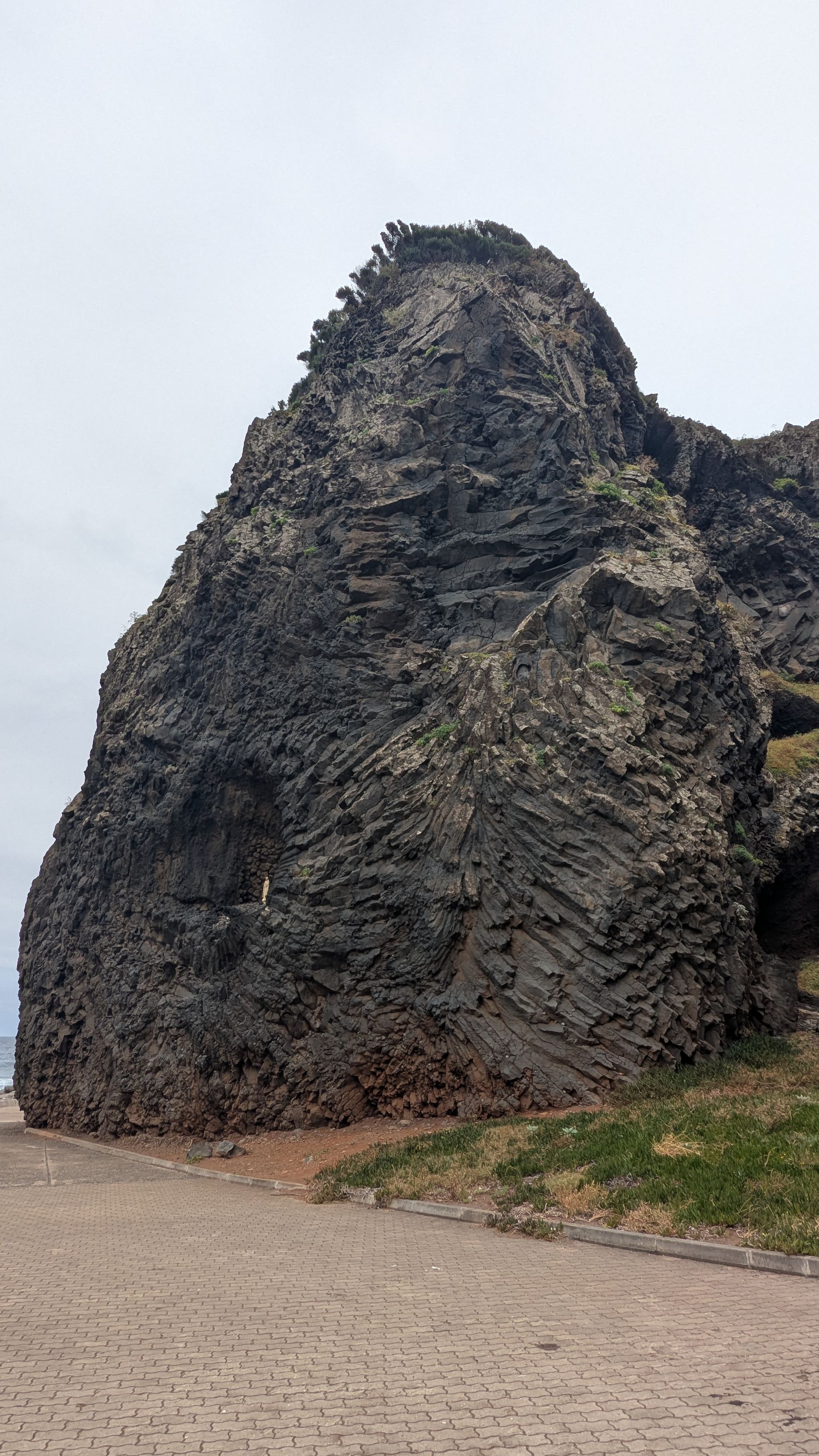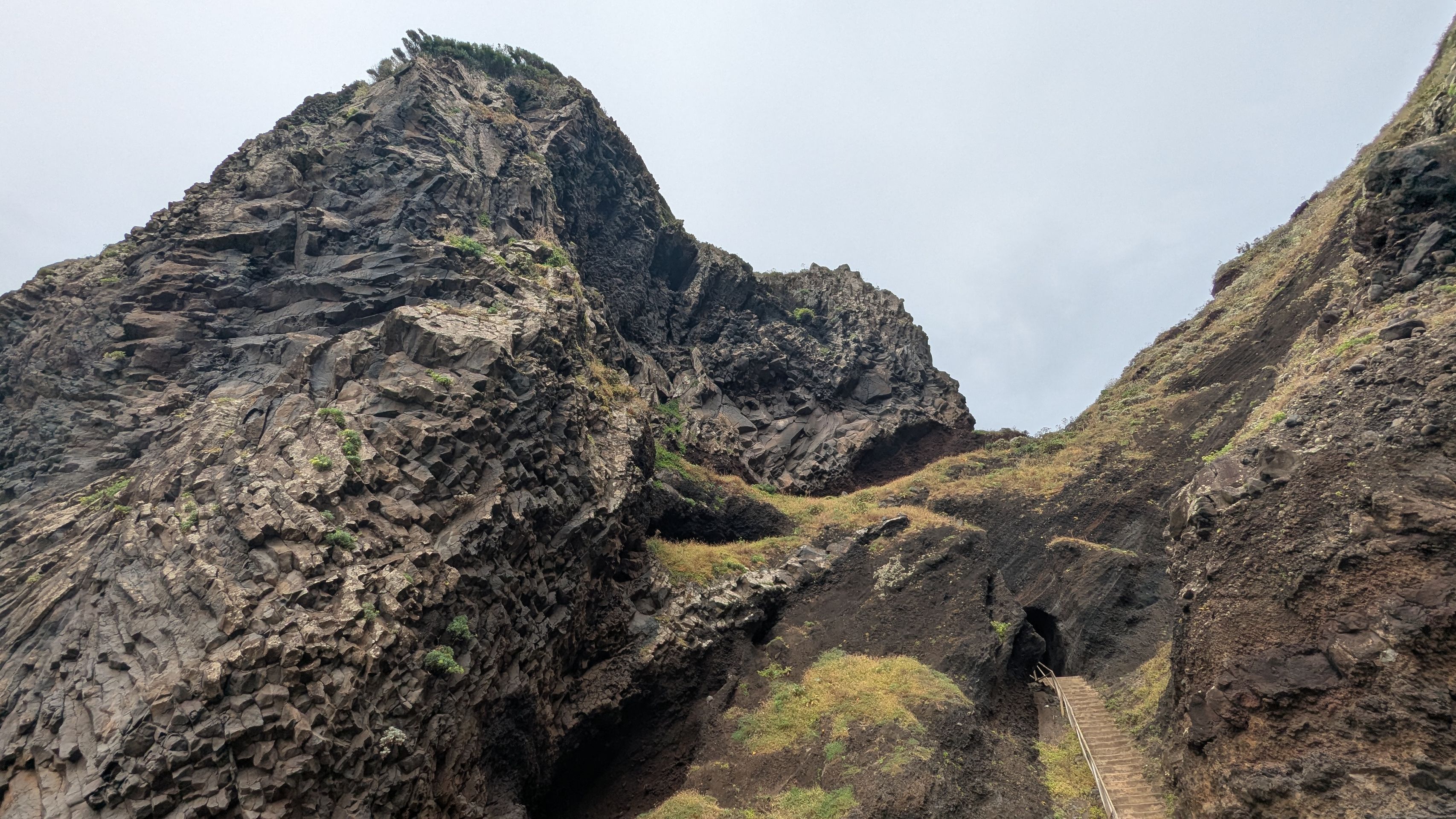 Auf den ersten Blick sieht man einen großen vulkanischen Felsen, außen mit Basaltsäulen, durch den ein Tunnel auf die Meeresseite führt, den man über Treppen erreicht.