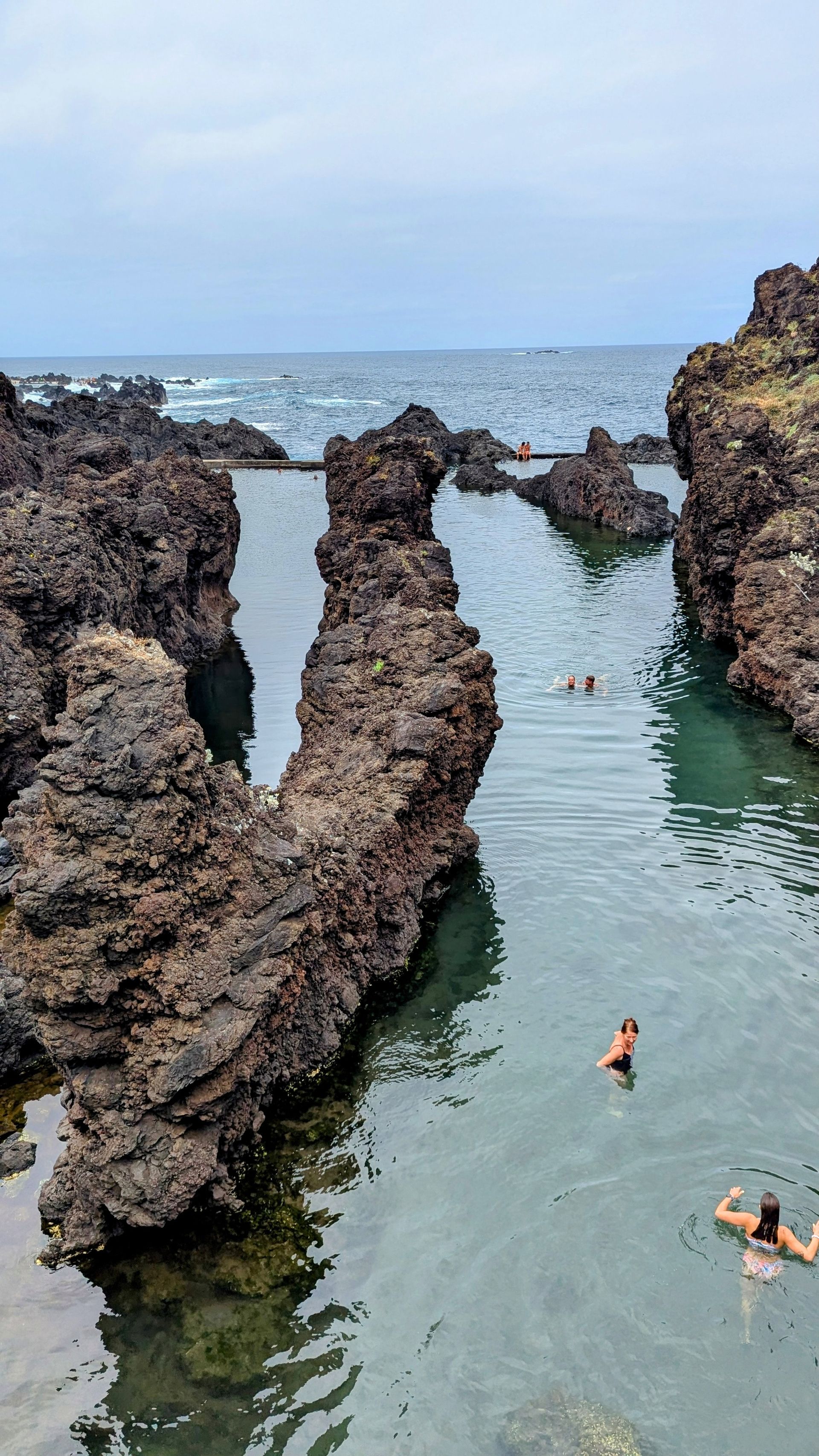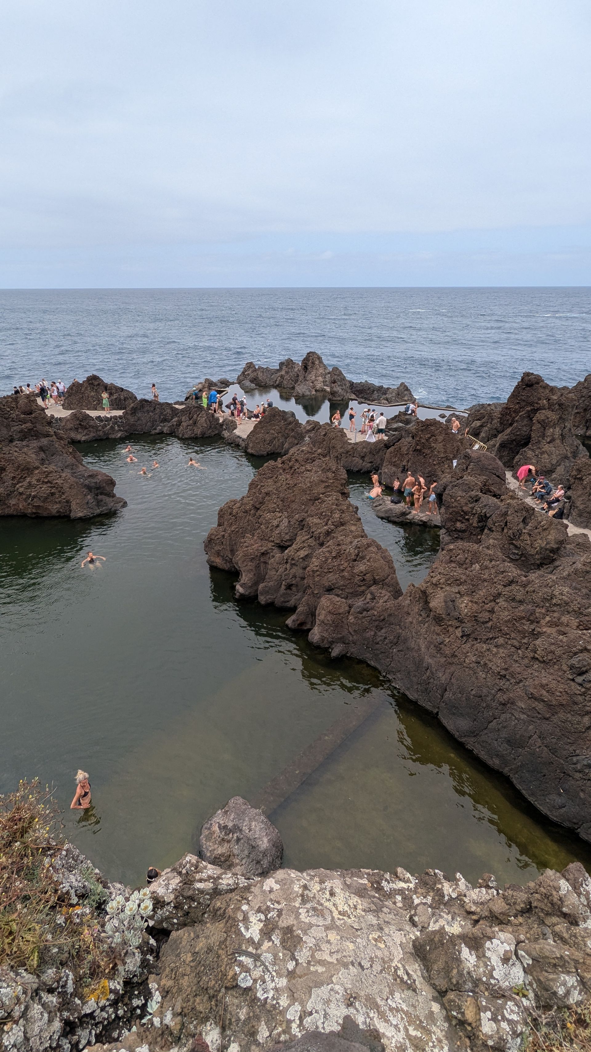 Nein, wirkt auf uns nicht sehr einladend, zumal wir den Vergleich zu wirklich tollen Pools auf den Azoren vor Augen haben (allen voran die auf Terceira, die waren wirklich wunderbar! => siehe mein Azorenblog https://vakantio.de/abenteuer-azoren/tag-3-von-sao-miguel-nach-terceira )