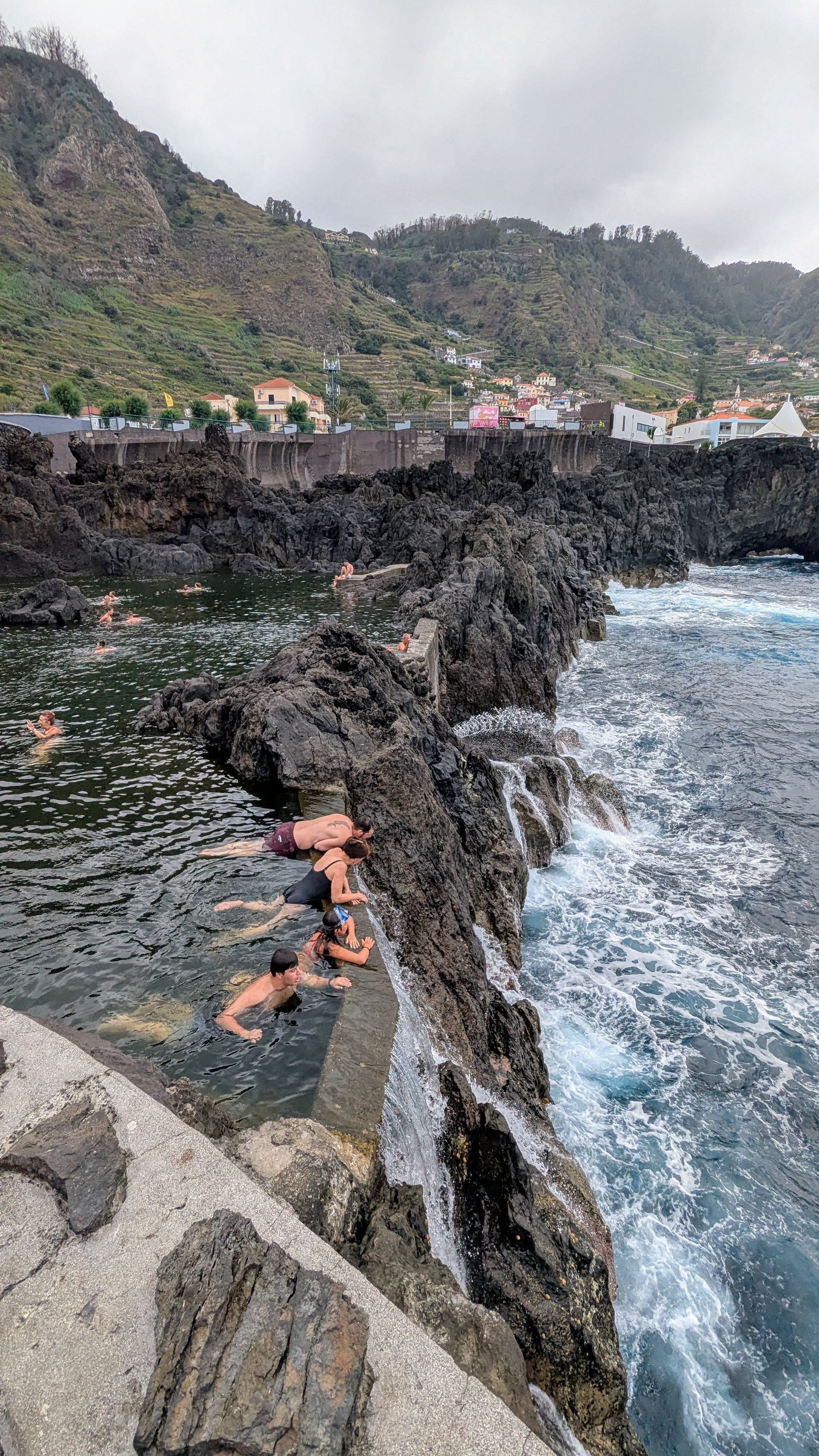 Die Becken der kostenlosen Pools Piscinas Naturais do Aquário sind deutlich naturbelassener und rauer als die der offiziellen Pools. Die Lavafelsen sind scharfkantiger, der Untergrund unregelmäßiger, da es eben kein gebauter Pool ist. Trotzdem würde ich eher die 3-5 € für die Piscinas Naturais do Porto Moniz (Die offiziellen Pools) in die Hand nehmen. Von der Klippe aus sehen wir die Touris in den offiziellen Pools planschen und auf der Außenmauer zum Meer sitzen. Hier scheint das Highlight zu sein, auf eine große Welle zu warten, die einen dann von der Mauer zurück ins Schwimmbecken spült. Sehr lustig anzuschauen.