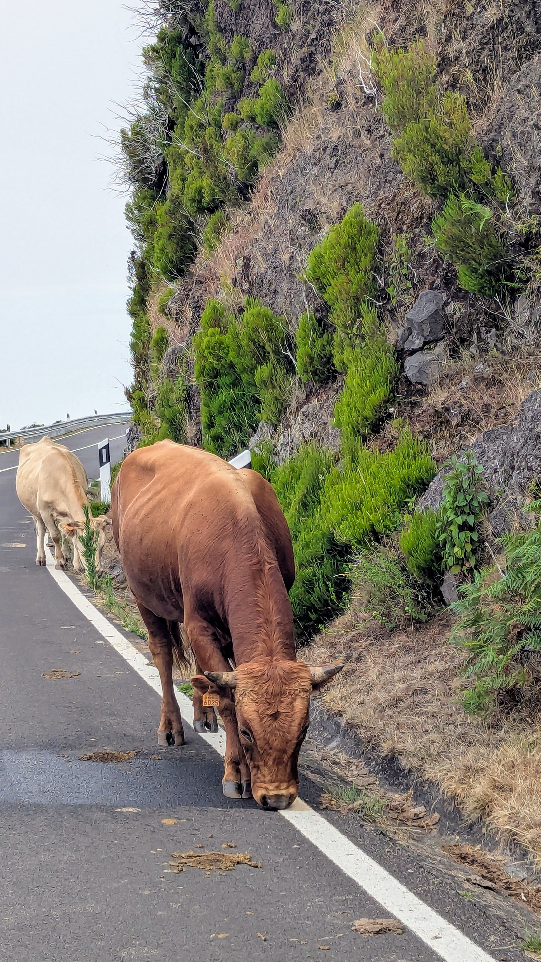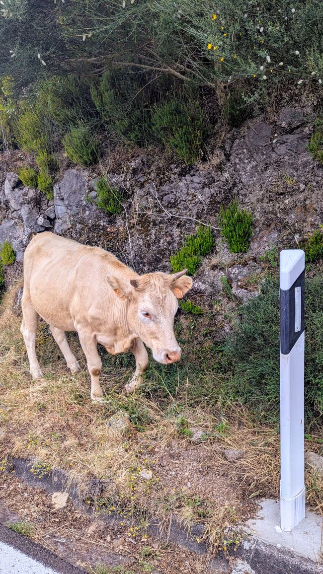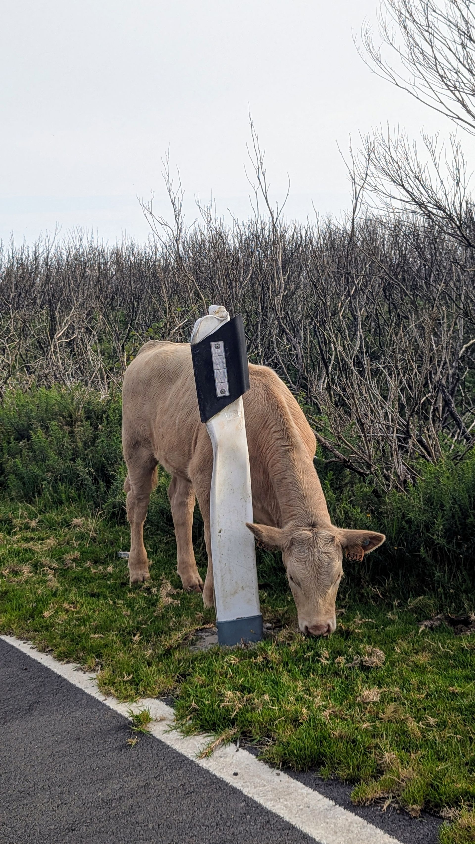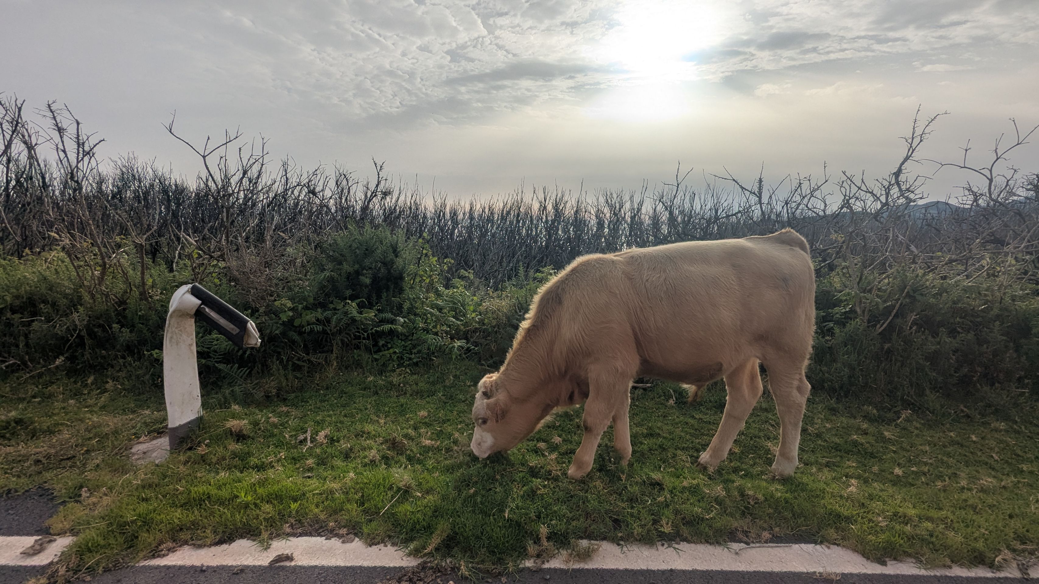 Kurios: hier hat es mal gebrannt (letztes Jahr?), die Leitpfosten nebend er Straße sind geschmolzen und wurden bisher nicht ersetzt, was zu einem sehr wiruigen Bild führt, wenn eine Kuh daneben steht 😁