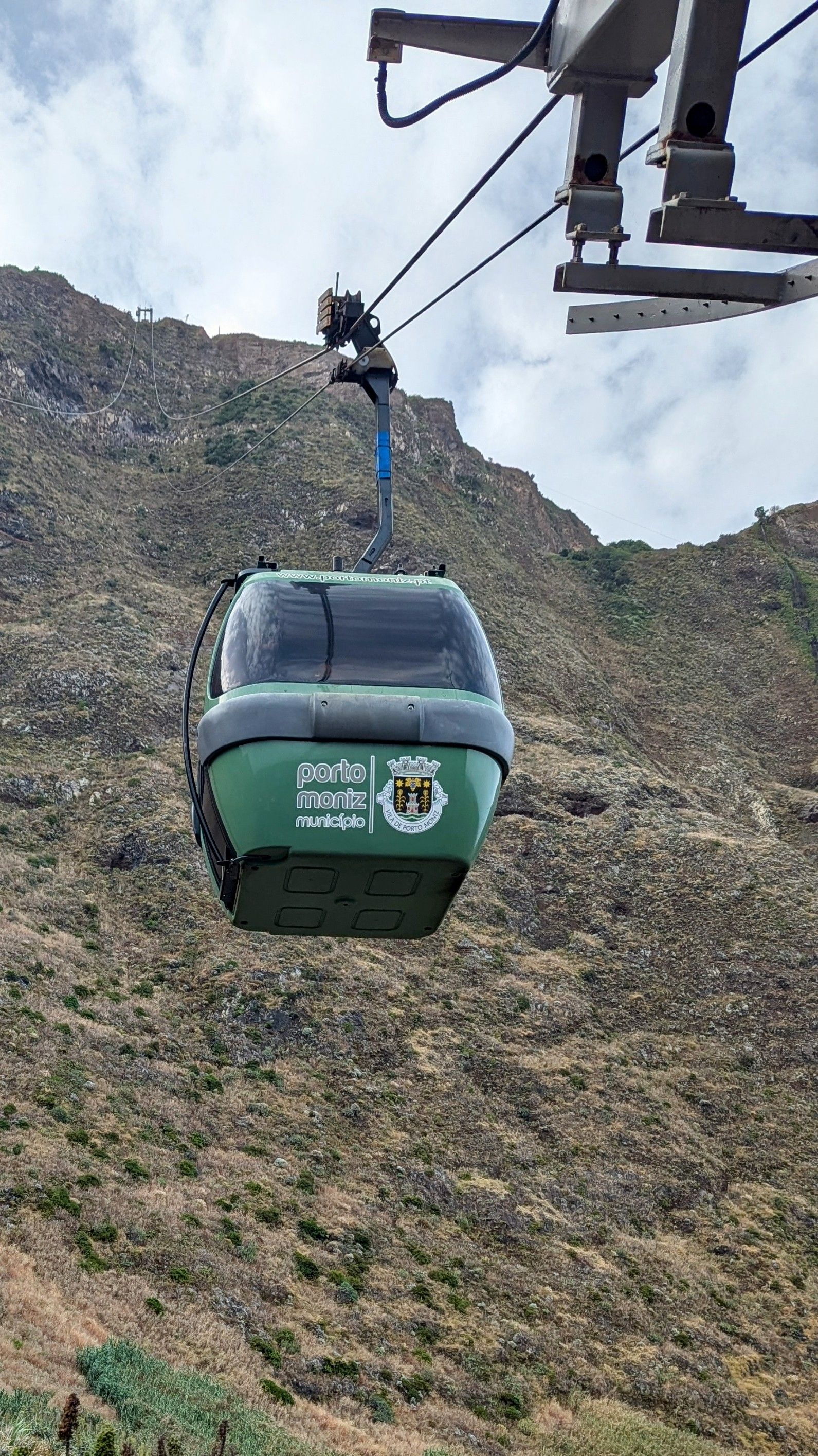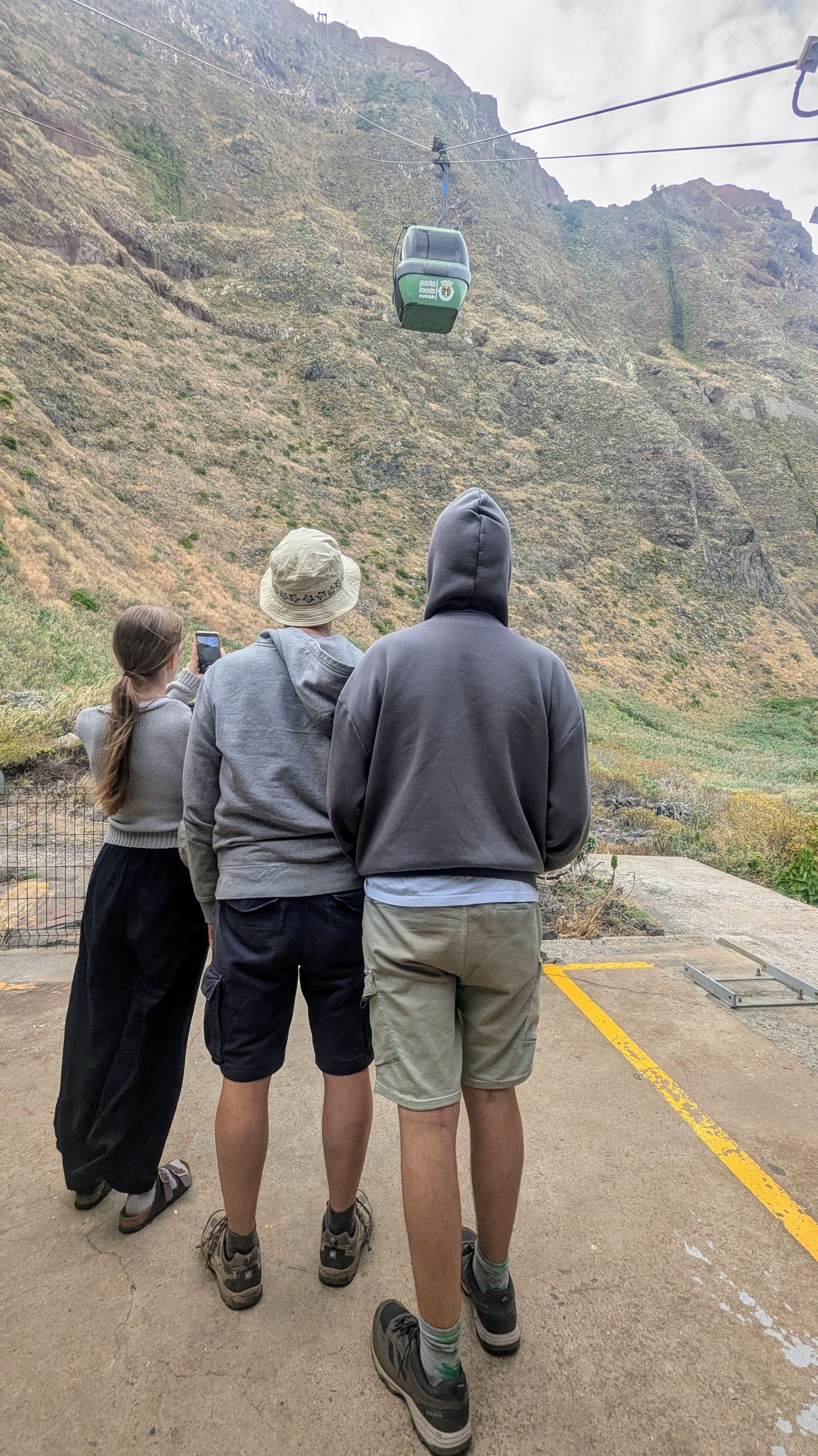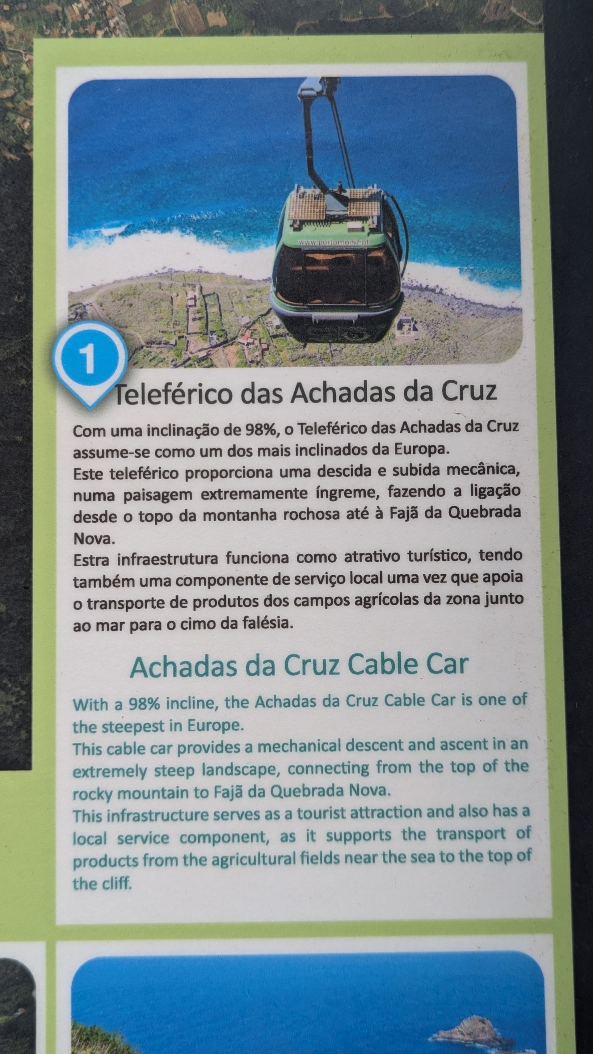 Unser nächster Stopp ist die Luftseilbahn Achadas da Cruz (Teleférico da Achadas da Cruz), die mit 98 Prozent Gefälle die steilste Luftseilbahn auf Madeira ist. Sie verbindet die auf der Klippe liegende Gemeinde Achadas da Cruz mit den am Ufer liegenden Gärten Fajã da Quebrada Nova, die wegen des fruchtbaren Bodens für die Landwirtschaft genutzt werden und sonst per Auto etc nicht zugänglich sind. Diese Seilbahn dient also nicht nur dem Tourismus, sondern auch dem Transport der Landwirte und deren Ernte (einer der Hauptgründe für ihre Errichtung).