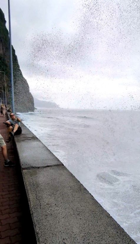 Die Retourkutsche folgt dann für Sohnemann und mich, als uns eine ebenso harmlos aussehende Welle mehrere Meter weiter eintlang der Mauer erwischt. Ok, jetzt haben wir fast alle einen nassen Hintern und Rücken, ab nach Calheta 😅