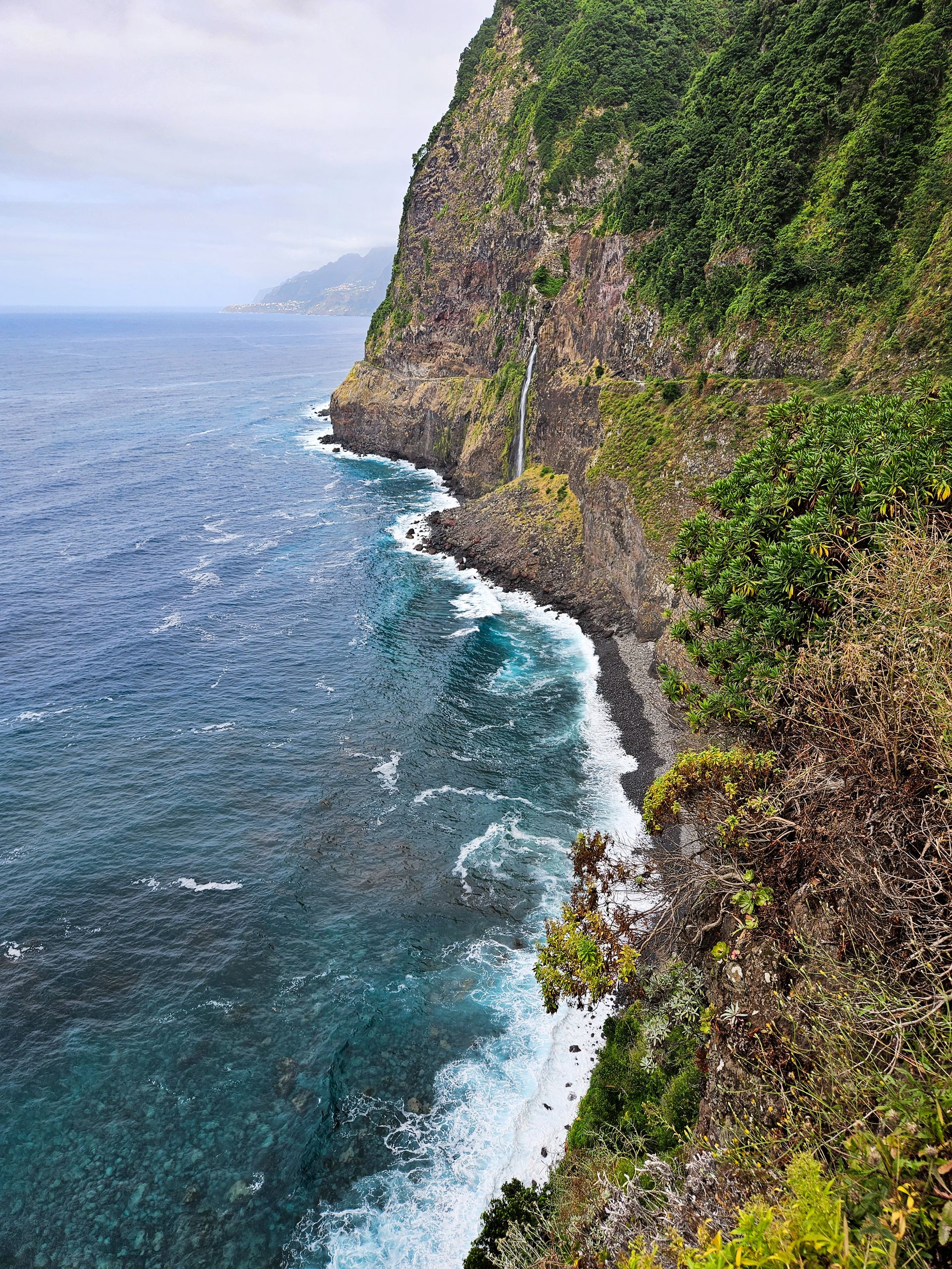 Am Miradouro do Véu da Noiva kann man einenWasserfall bewundern, der den bewachsenen Berghang hinunter in Richtung Meer stürzt. Allerdings benötigt man hier eine gutes Teleobjektiv... mit meinem Handy ist er dann doch "sehr weit weg".