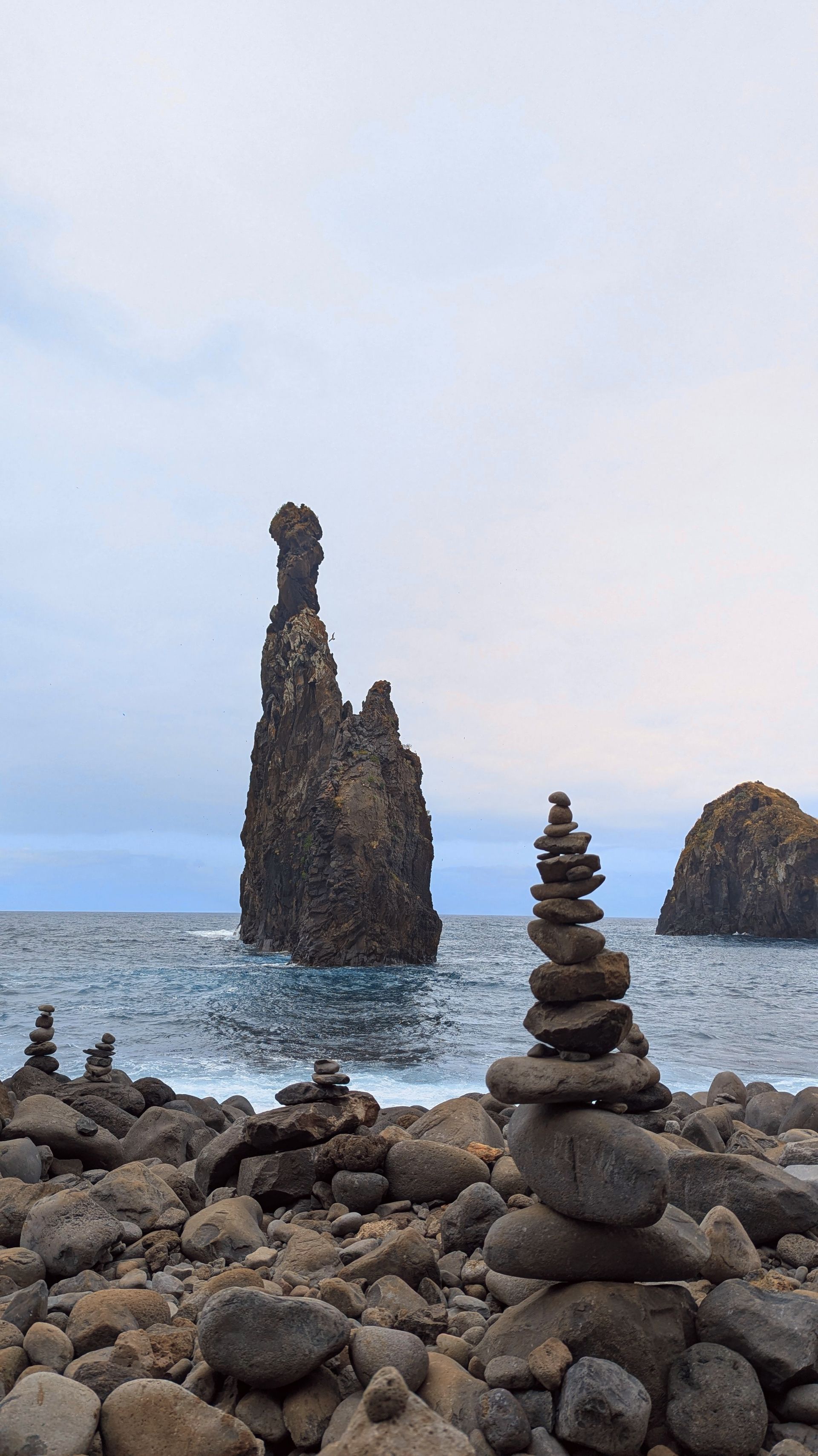 Wir laufen den Weg allerdings um den Felsen herum, da wir zuerst ans Meer gehen und quasi direkt vor dem berühmten Felsen stehen. Am steinigen Strand finden wir jede Menge "Steintürmchen". Über einen Pfad erreichen wir den Aussichtsbalkon auf dem Felsen, schießen unser "Vergleichsfoto" und gehen durch den Tunnel zurück auf die andere Seite des Felsens, wo wir über die Treppen wieder hinunter zum Parkplatz gelangen.