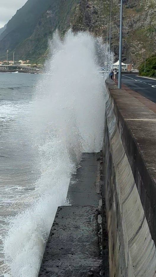Auf dem Weg zurück nach Calheta fahren wir an der Küste entlang und erreichen kurz vor Sao Vicente die Uferstraße am Meer, wo mit lauten Schlägen die Wellen gegen die Betonmauer klatschen und teilweise bis nach oben auf die Straße spritzen. Cool, das müssen wir uns aus der Nähe anschauen!