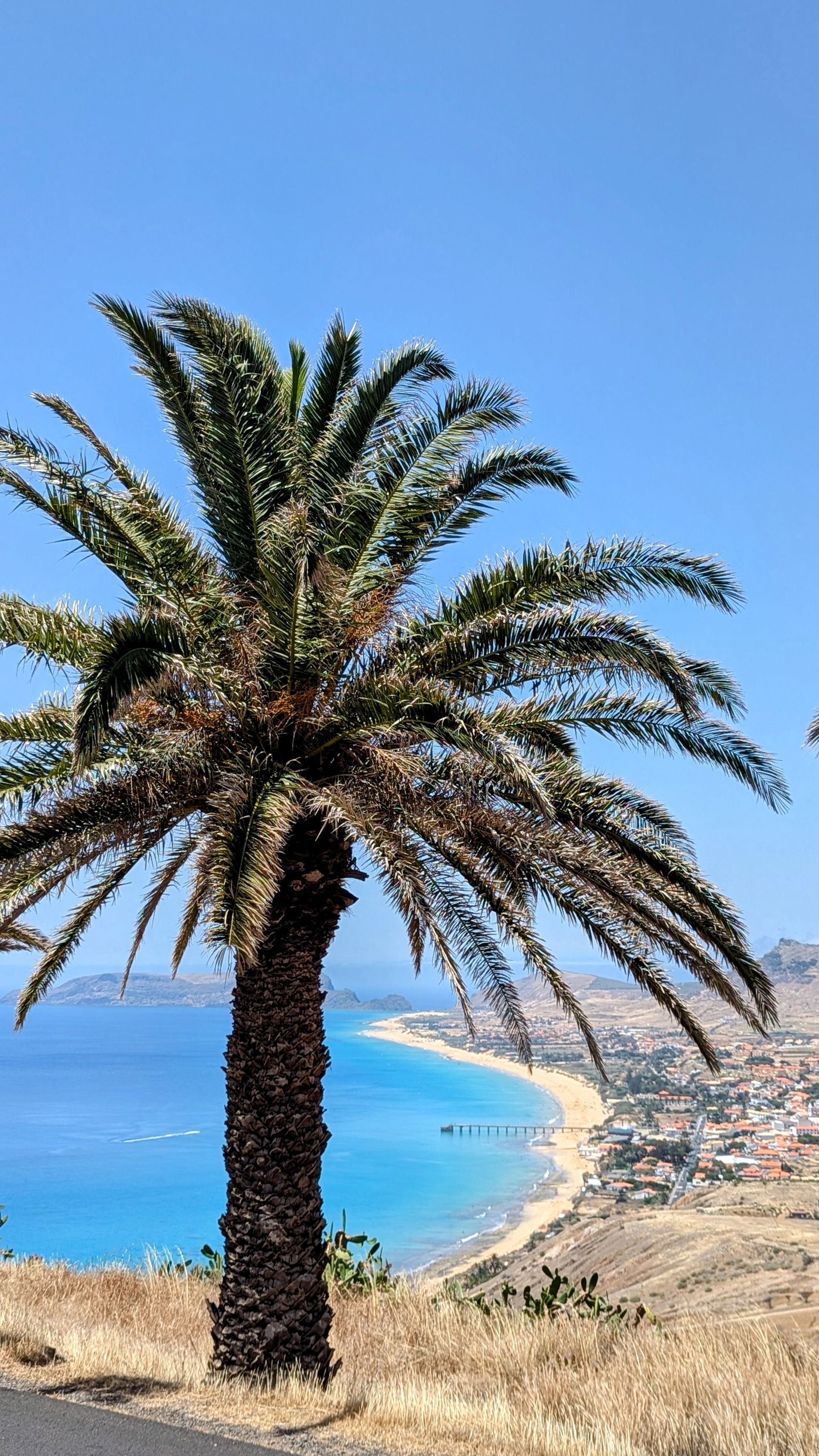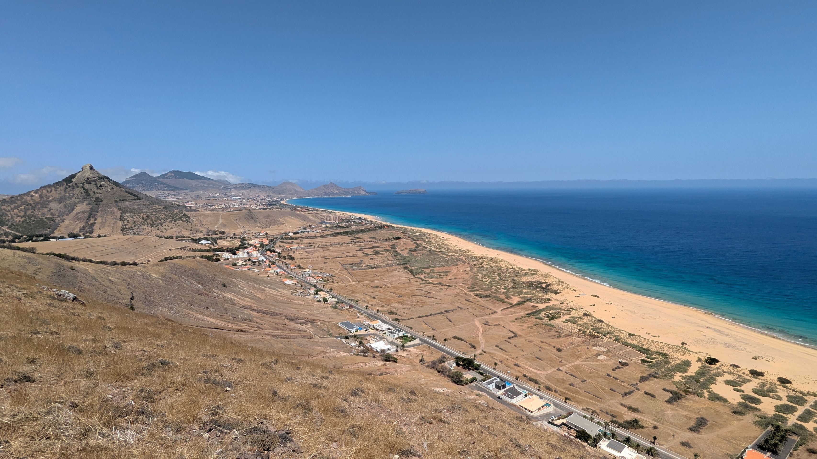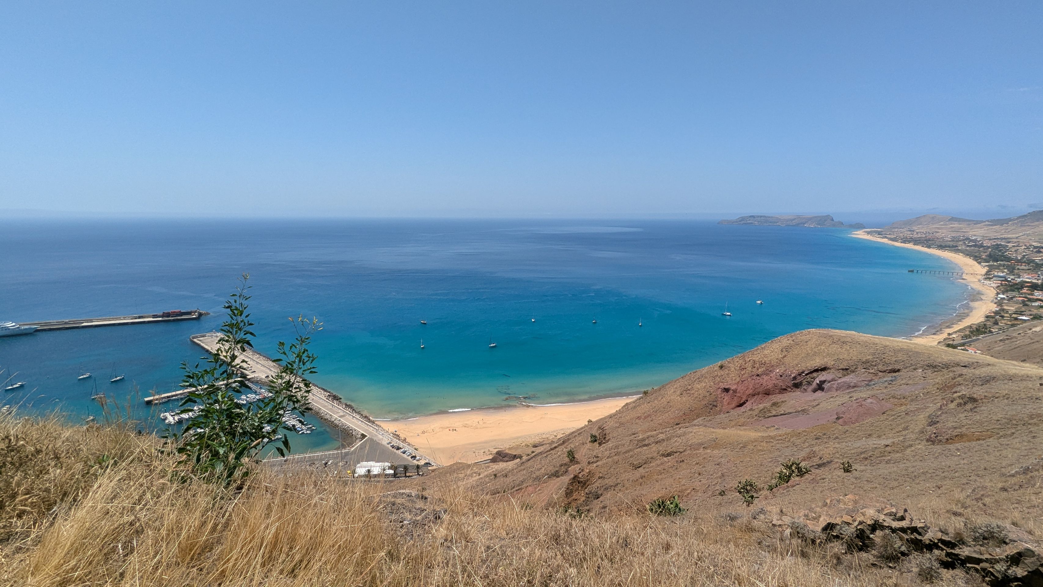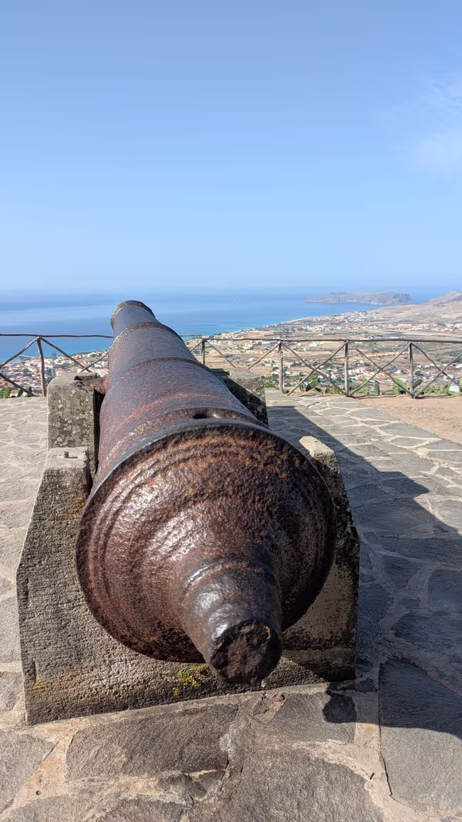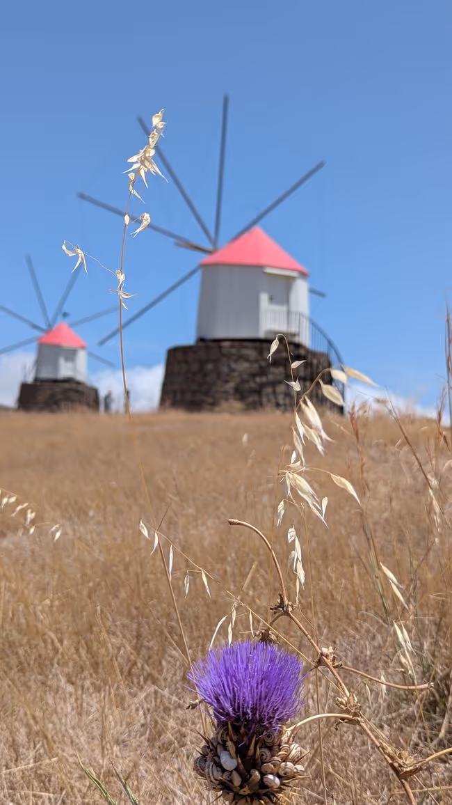 Zurück Richtung Hotel stoppen wir am Miradouro da Portela, von wo aus man einen fantastischen Blick auf den 9 km langen Sandstrand der Insel hat, den Hafen mit seinen Segelbooten und der Fähre sehen kann und über die Straße einen kurzen Fußweg zu den 3 historischen Windmühlen Moinhos Vento Porto Santo machen kann (machen wir natürlich 😜).