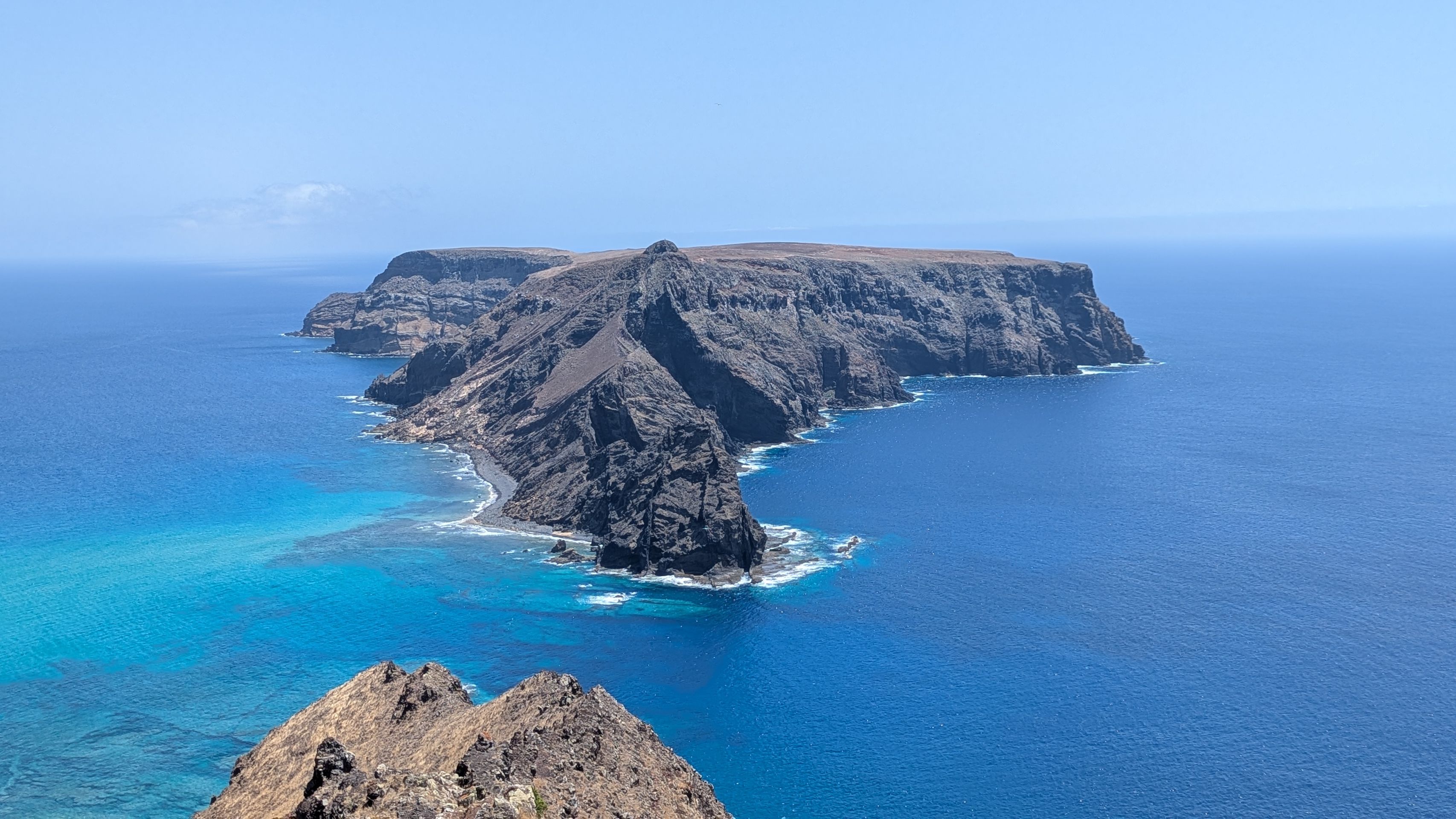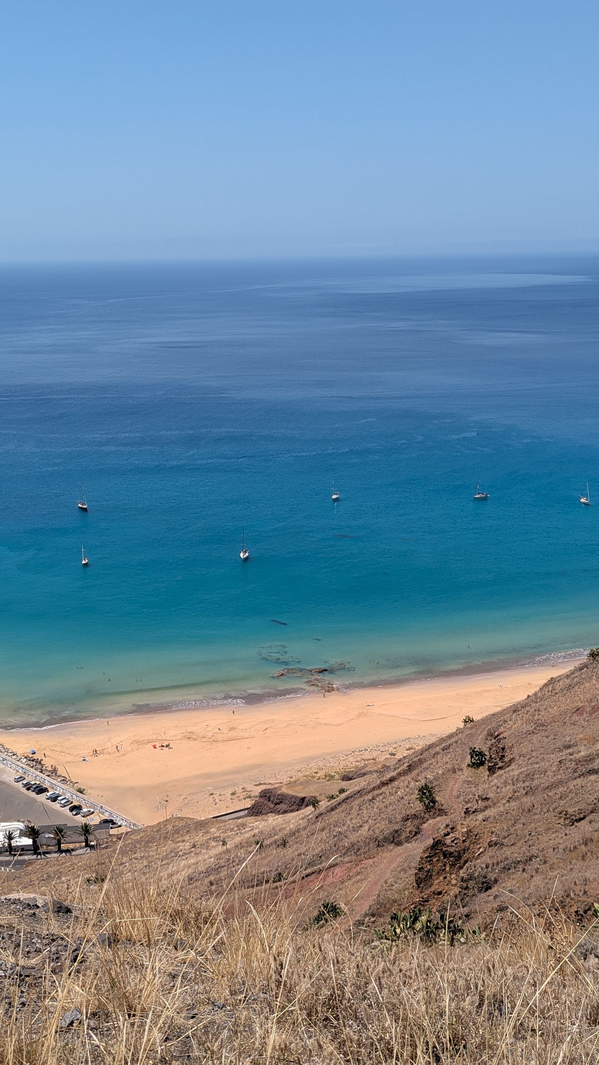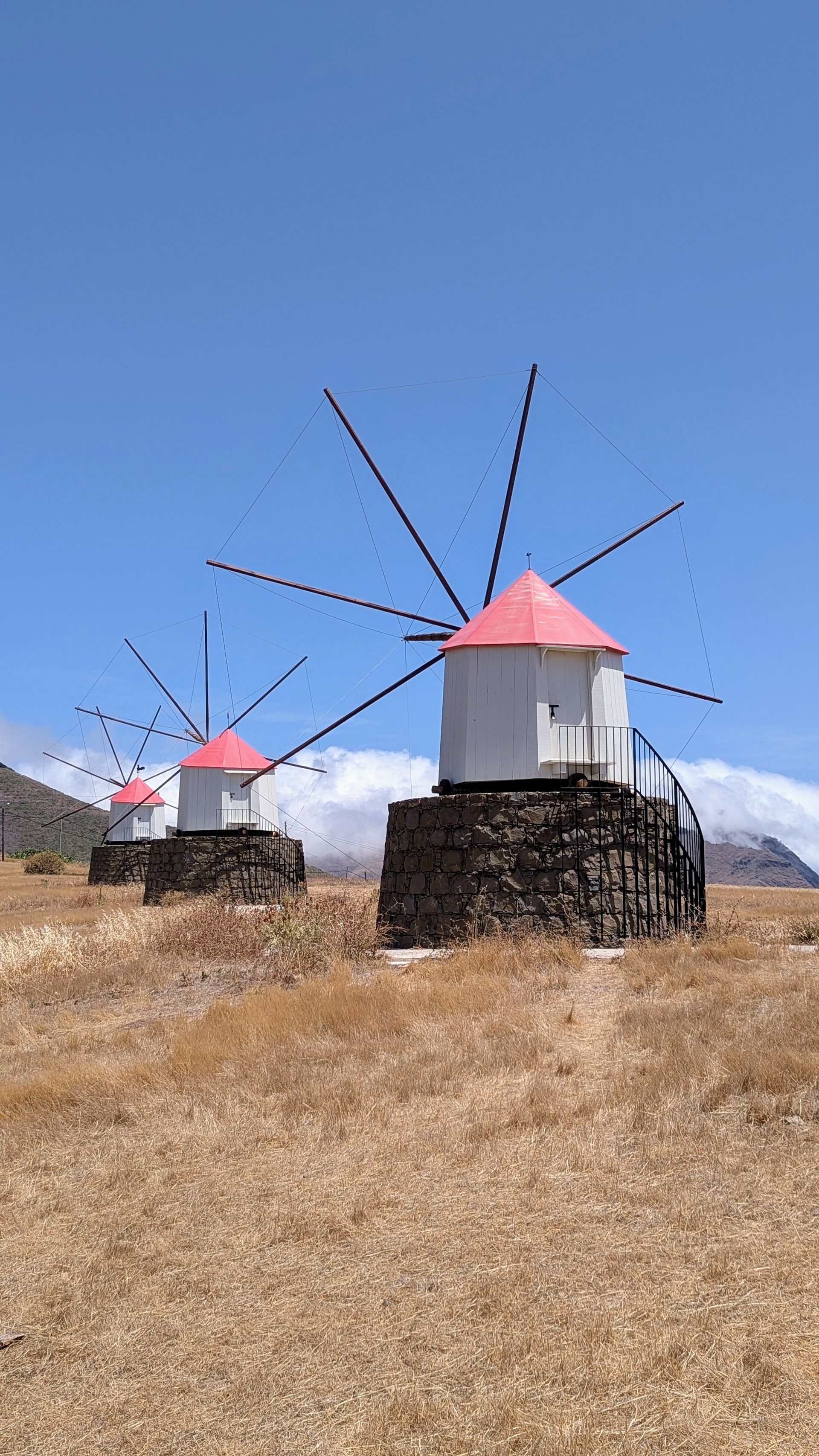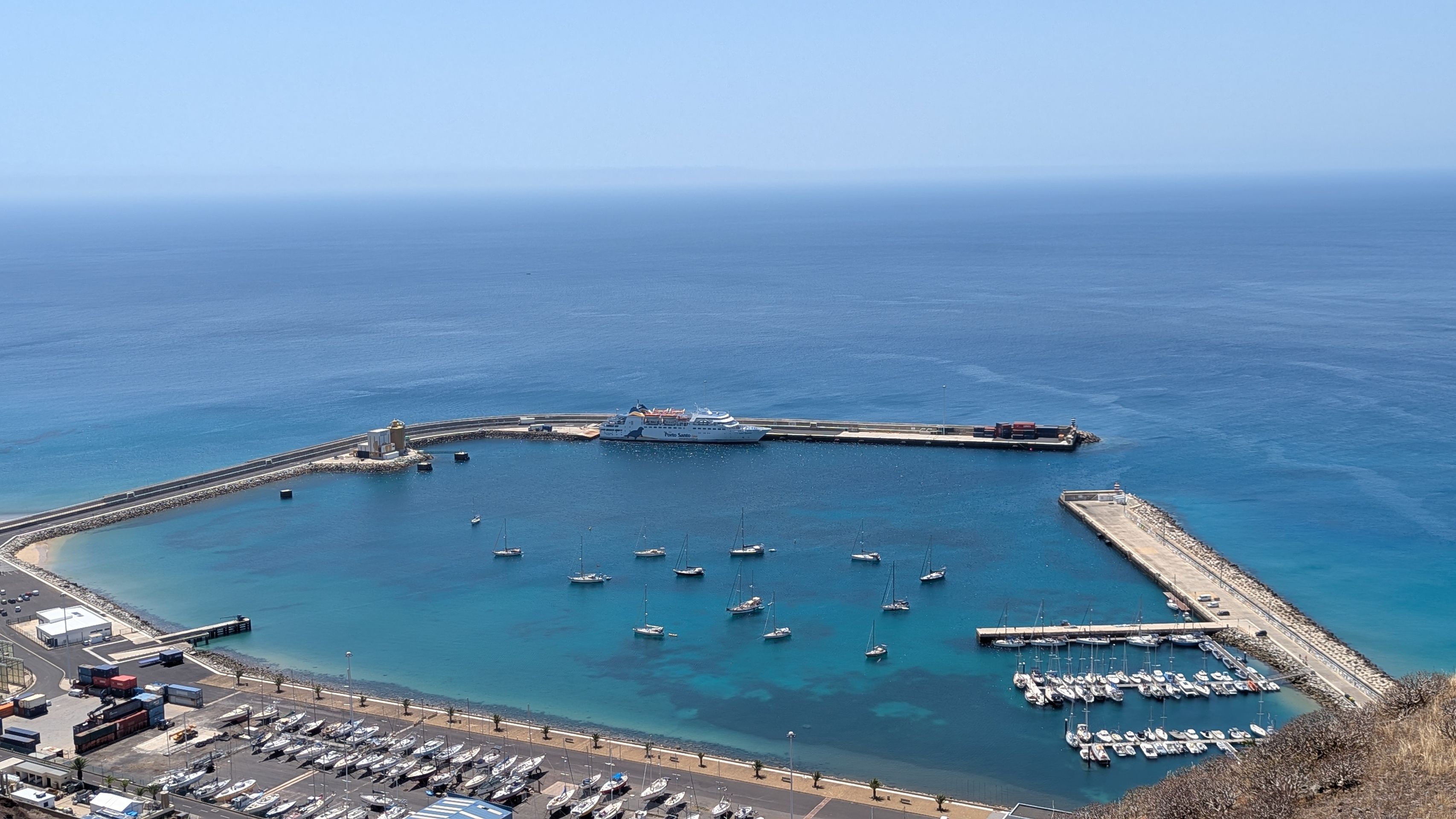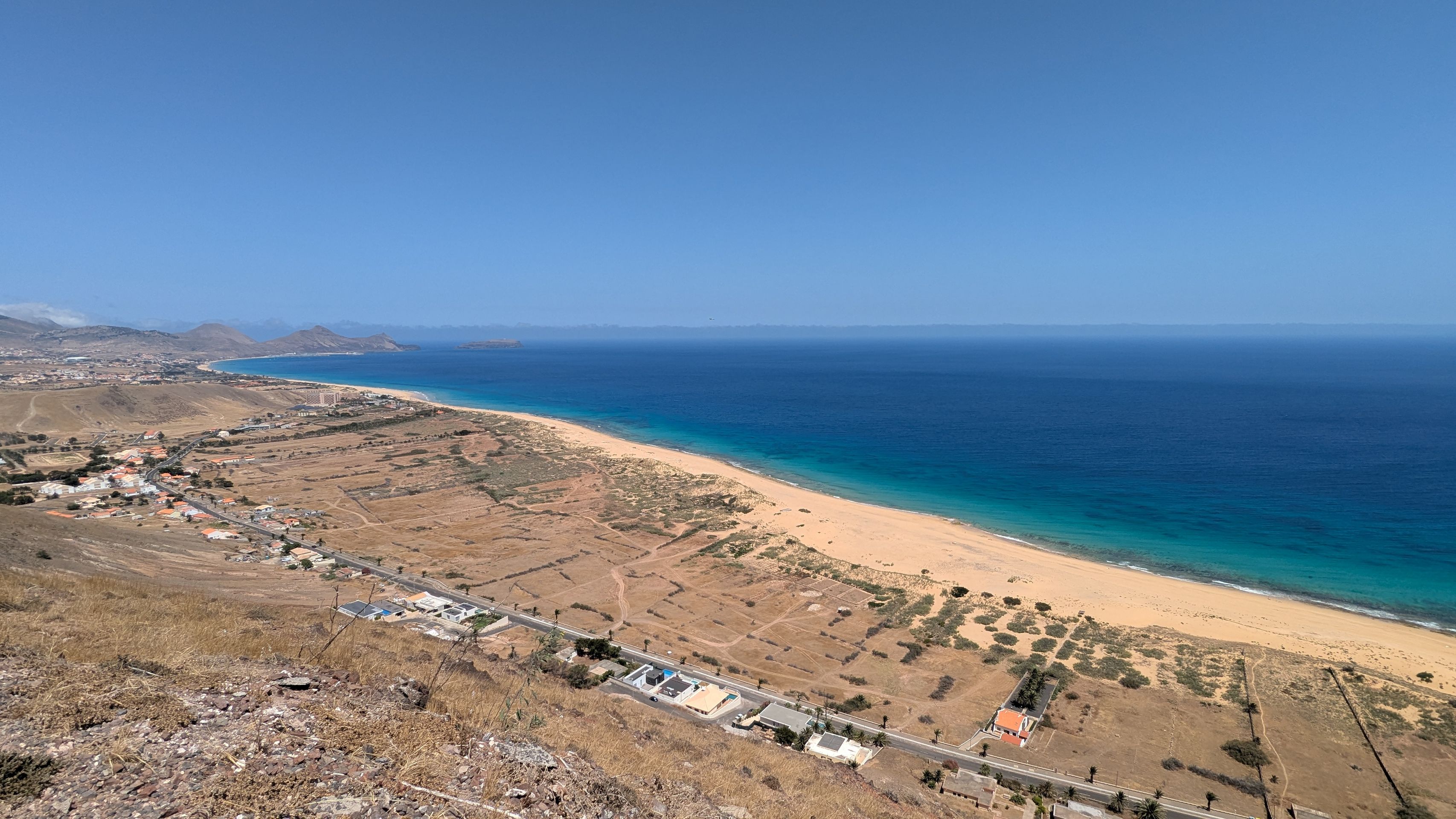 Zurück Richtung Hotel stoppen wir am Miradouro da Portela, von wo aus man einen fantastischen Blick auf den 9 km langen Sandstrand der Insel hat, den Hafen mit seinen Segelbooten und der Fähre sehen kann und über die Straße einen kurzen Fußweg zu den 3 historischen Windmühlen Moinhos Vento Porto Santo machen kann (machen wir natürlich 😜).