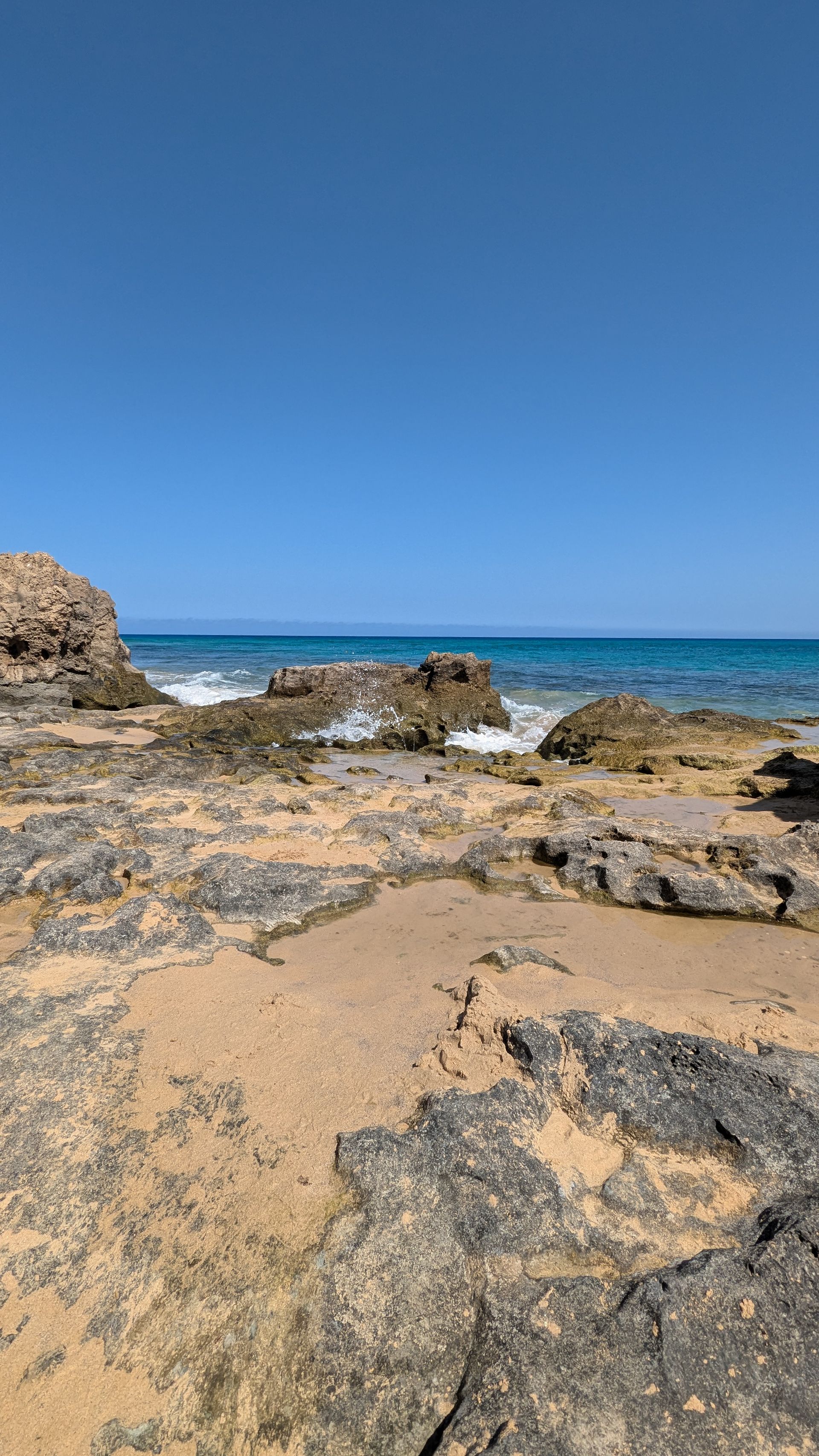 Danach fahren wir vom Ort Serra de Fora aus ans Meer, wo sich die Naturpools Piscinas Naturais do Porto dos Frades befinden sollen. Angeblich nett zum Schnorcheln. Als wir aussteigen, stehen wir vor einer unsichtbaren Hitzewand!