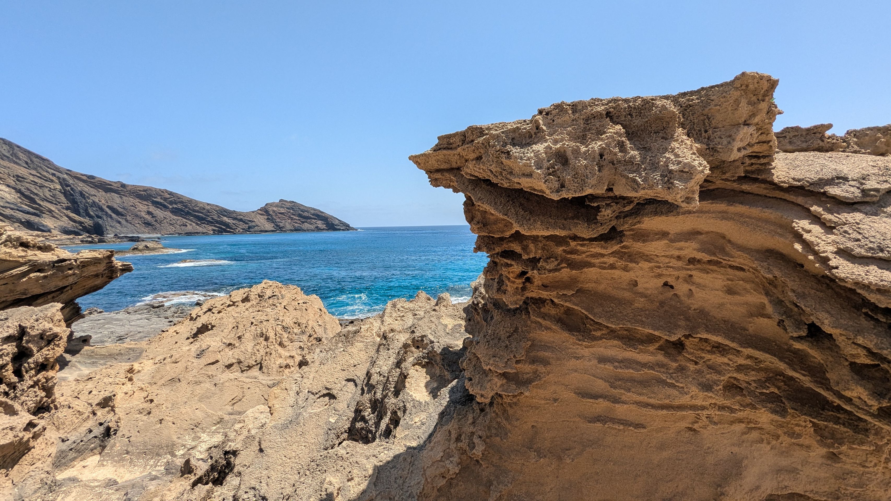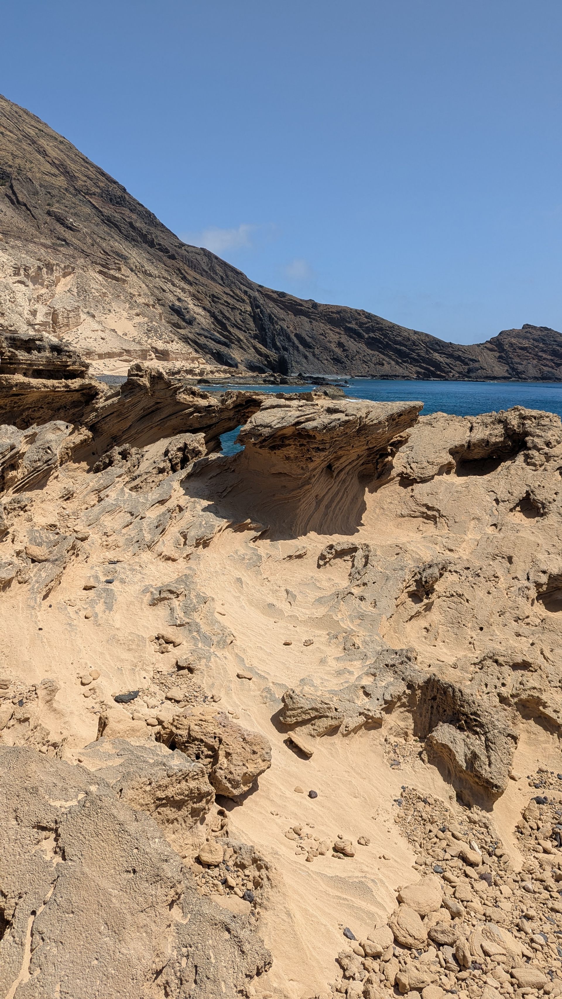 Wir laufen ein Stück an der steinigen Bucht vorbei über kleine Sanddünen zu den vulkanischen Felsformationen am Meer.