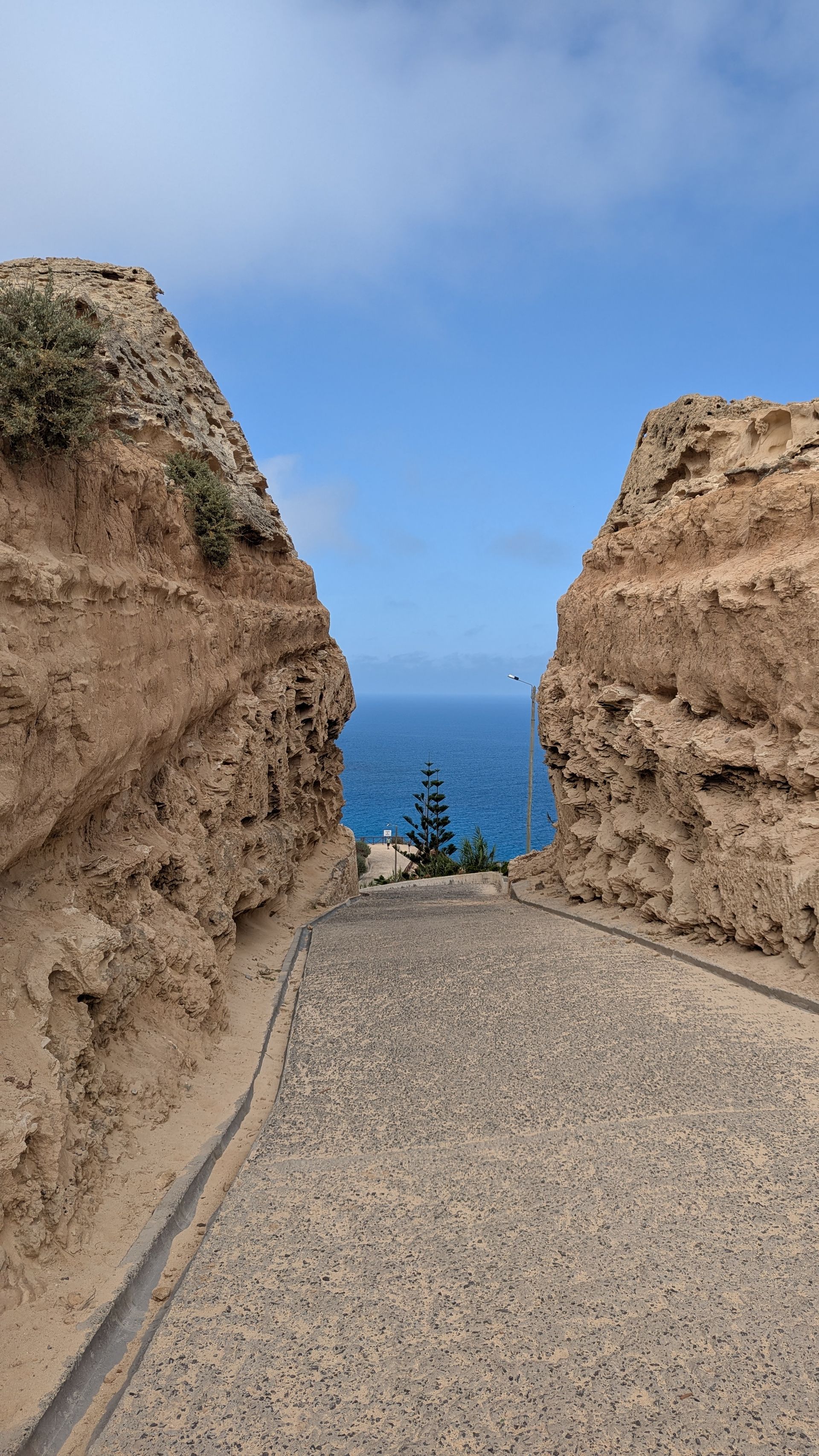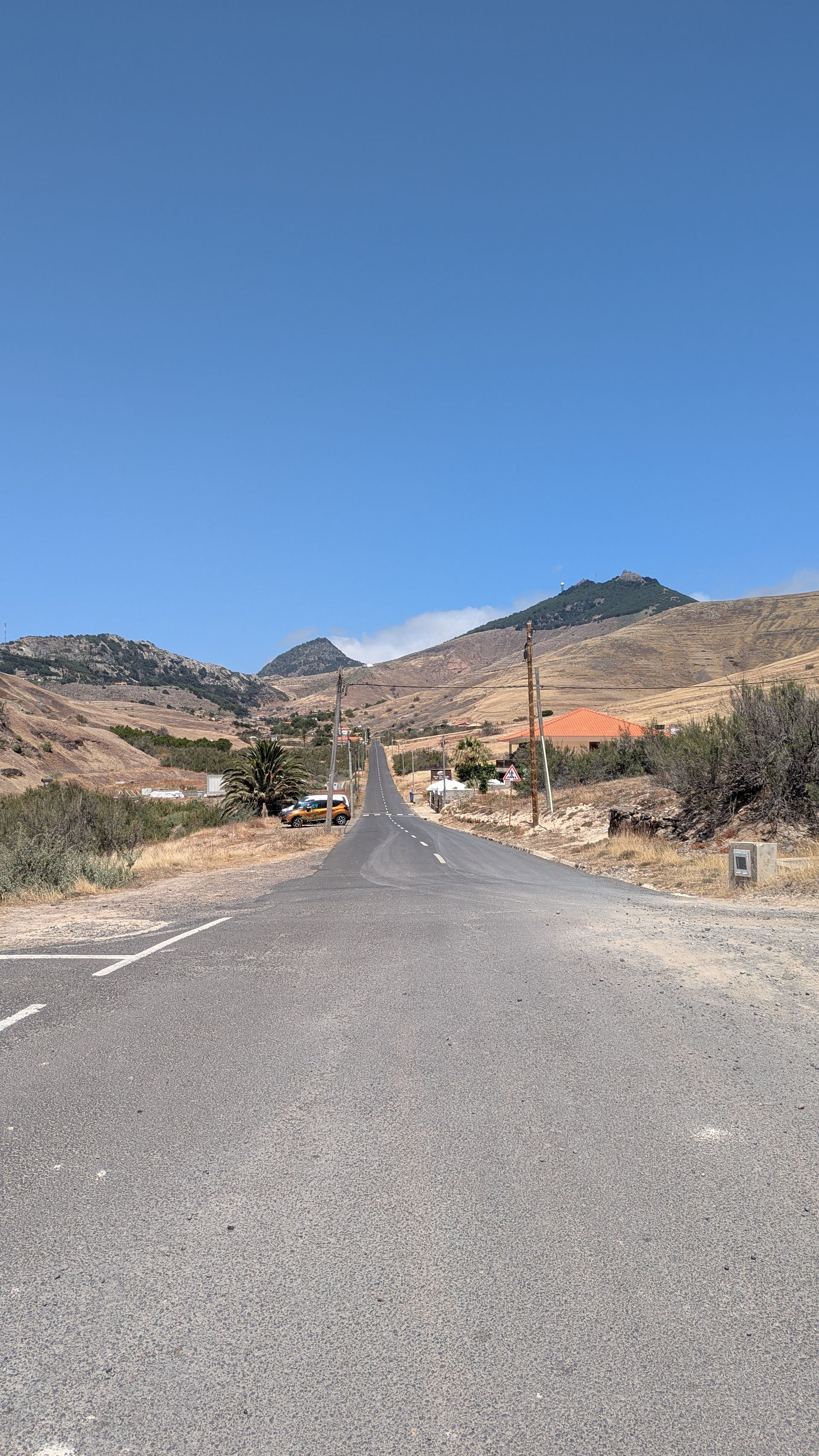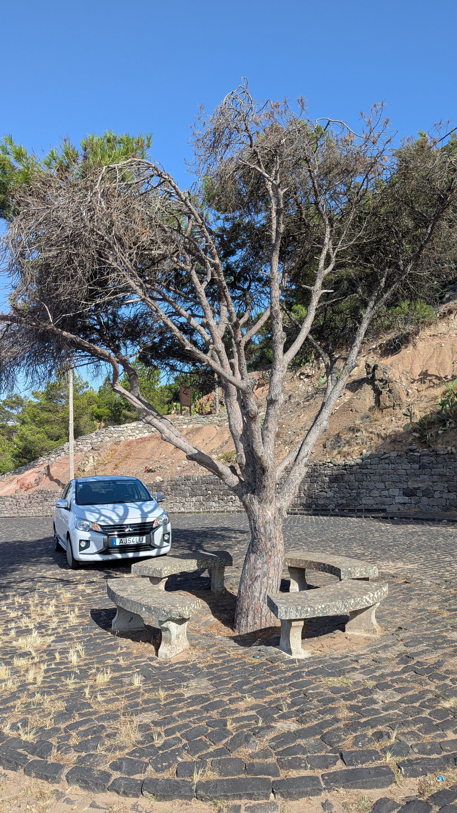 Der Gatte möchte sich gerne den Weg zum Praia do Zimbrainho anschauen, Sohnemann und ich haben aber schon signalisiert, dass wir auf diese schweißtreibende Wanderung bei den aktuellen Temperaturen keine Lust haben. Wir fahren die Stichstraße vom Miradoura das Flores ab zum Strand. Natürlich wieder Schotterpiste, dieses Mal auch noch mit Sand, Schlaglöchern und Spurrillen. Ich habe schon die handfeste Krise auf dem Beifahrersitz, aber der Gatte fährt seelenruhig weiter bis zur Haltestelle und dem Verbotsschild, weiterzufahren. Während Sohnemann und ich im Auto warten, marschiert er den Weg bis an die Küste, wo der Abstieg zum Strand beginnt, kommt aber zu der Erkenntnis, dass es sich nicht lohnt, bei der Hitze dort runter zu klettern - und der Weg zurück zum Auto sei total anstrengend und schweißtreibend. Genauso beschwerlich wird nun der der Weg mit dem Auto zurück zur Straße: unser kleiner Mitsubishi schafft es kaum den sandigen Spurrillenhügel hinauf. Uns fällt echt ein Stein vom Herzen, als wir wieder oben ankommen. Also Anmerkung: mit untermotorisiertem Kleinstwagen ist der Abstecher NICHT geeignet!