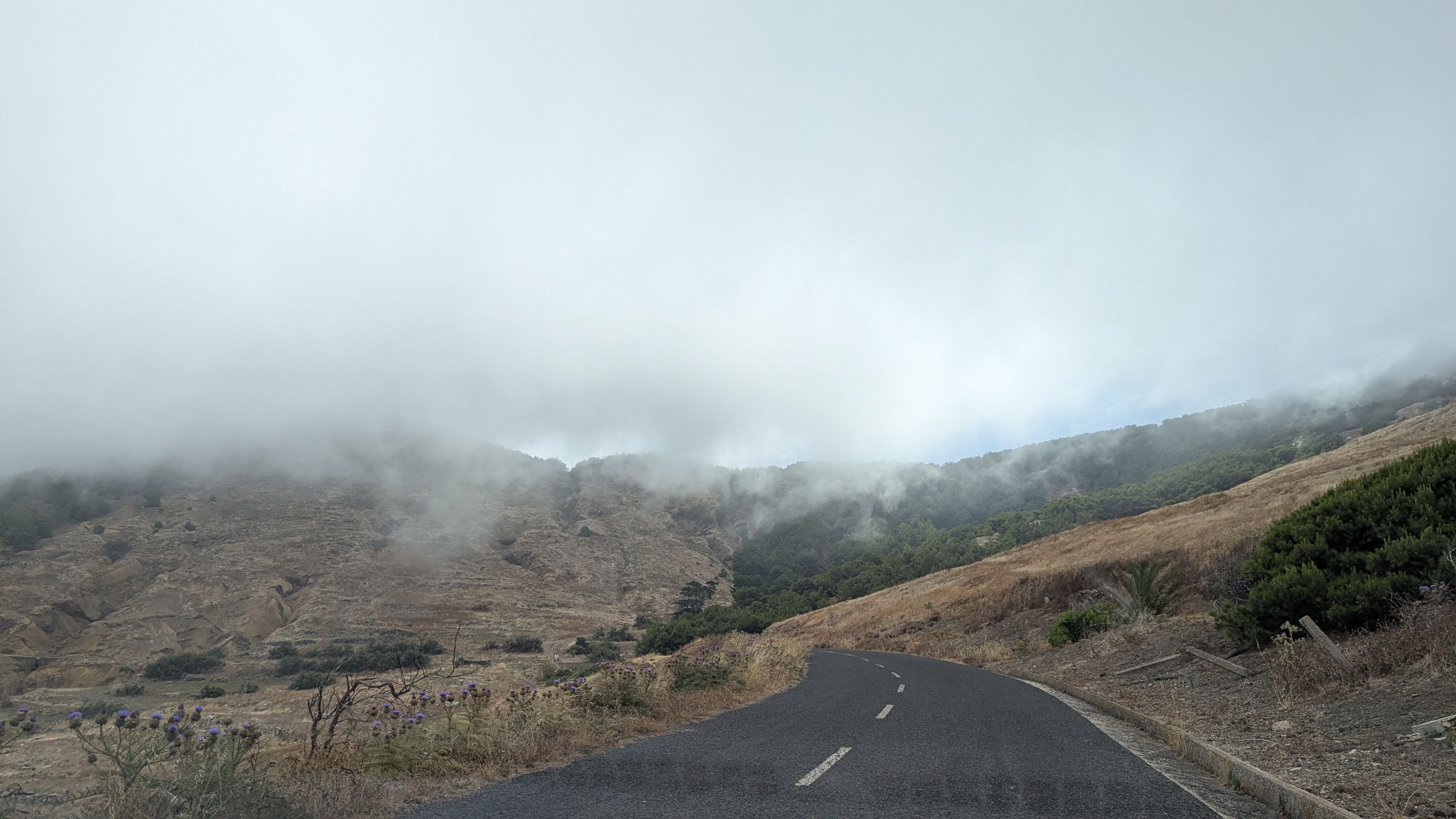Wir umrunden den östlichen Teil der Insel. Hier finden sich Wälder und Bäume am Hang, über die die Wolken ziehen. Hat etwas Mystisches. Hier herrscht jedenfalls ein Mikroklima. Kaum sind wir ein Stück um den Berg herumgefahren, ist es schlagartig gefühlte 5 Grad (oder mehr) kälter. Es weht außerdem ein Lüftchen, auf der anderen Bergseite war es windstill.