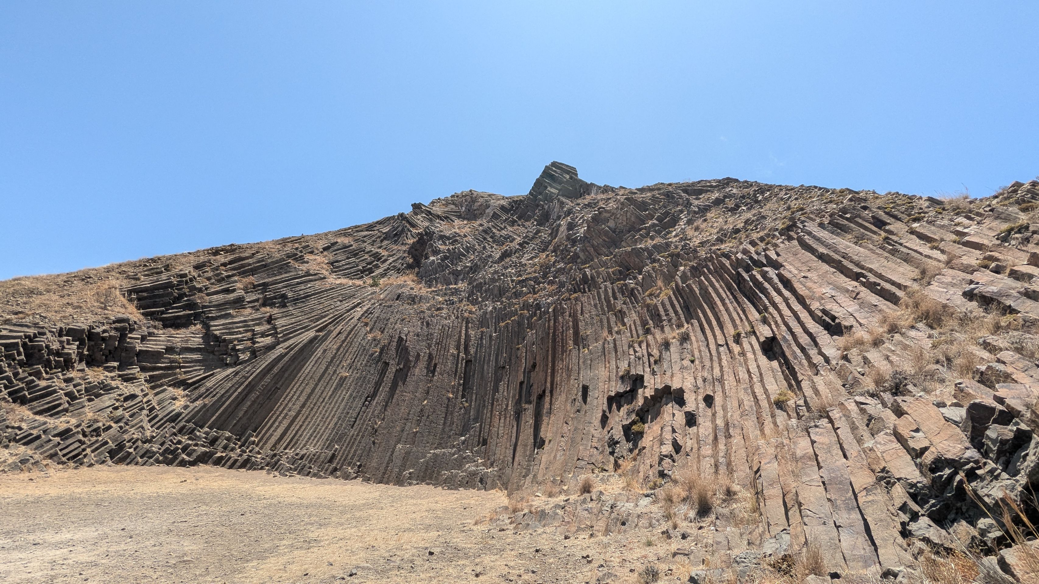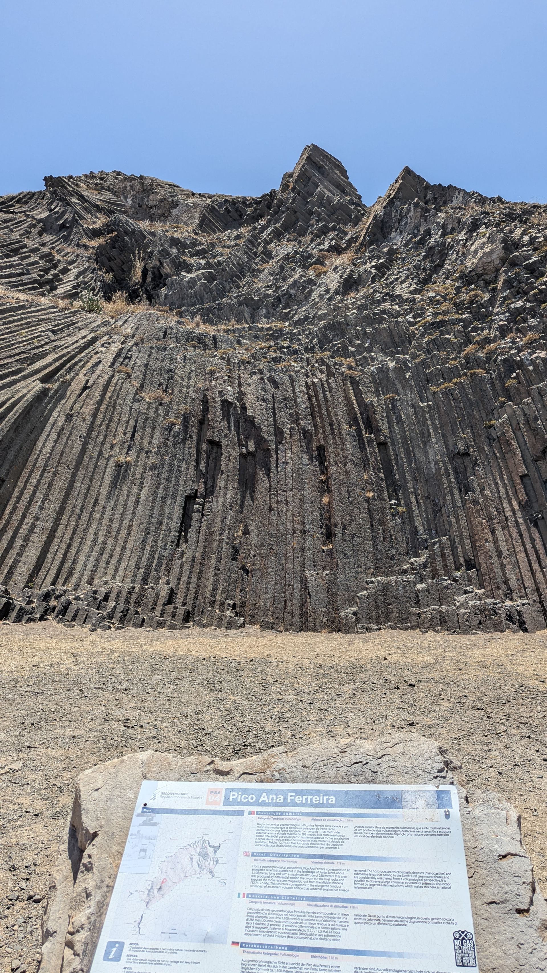 Wir fahren Richtung Süden der Insel, quasi am Hotel vorbei und machen einen Abstecher in die Inselmitte zum Pico de Ana Ferreira. Hier befindet sich ein weitere Attraktion der Insel. Mit 283 Metern über dem Meeresspiegel ist er der höchste Punkt im westlichen Teil der Insel Porto Santo. Auf seinem Gipfel befindet sich eine spektakuläre Reihe prismatischer Säulen, die vor Tausenden von Jahren durch vulkanische Aktivitäten entstanden sind.