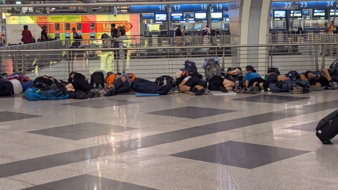 Im Flughafengebäude ist es ruhig. Auf dem Boden liegen überall "Pilger" teilweise auf Matten auf dem Boden und schlafen. Viele haben große Wanderrucksäcke dabei. Entweder, die kamen von einer letzten Tour und wollen nun per Flieger heim oder sie sind mitten in der Nacht angekommen und starten am Morgen? Wir wissen es nicht. Lustiges Bild jedenfalls.