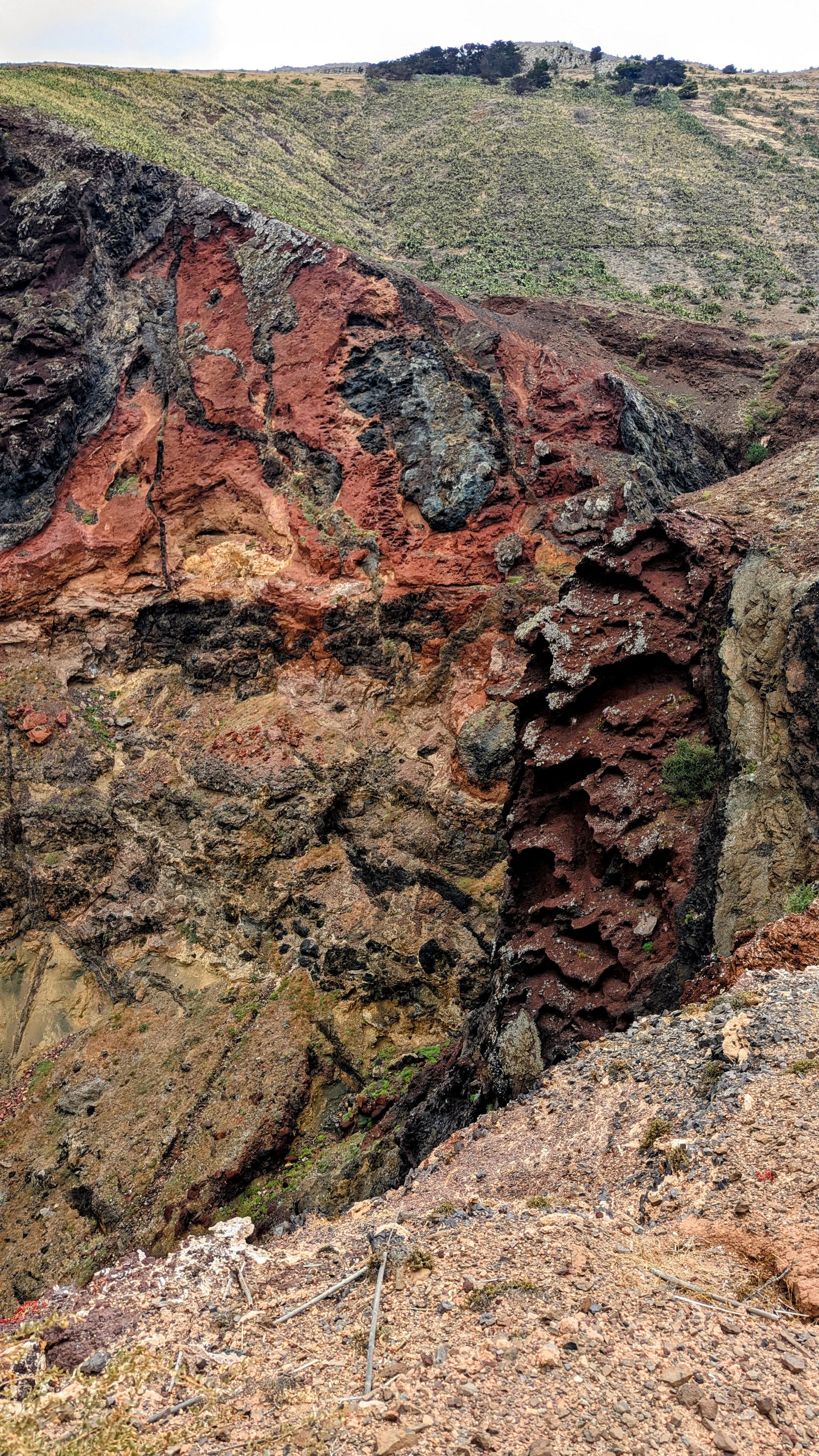 Wir stoppen am Parque de Morendas dos Morenos, kurz vor dem Miradouro do Furado Norte. Hier kann man eine Felswand anschauen, die quasi die Geschichte der Vulkanaktivität der Inel erzählt. Es gibt unterschiedliche Farben und Vulkanformationen, erstarrte Magmasäulen, Basaltgestein etc. und zwischendruch dichte Moos-Farnwände, an denen kleine Wasserfälle herunter fließen.