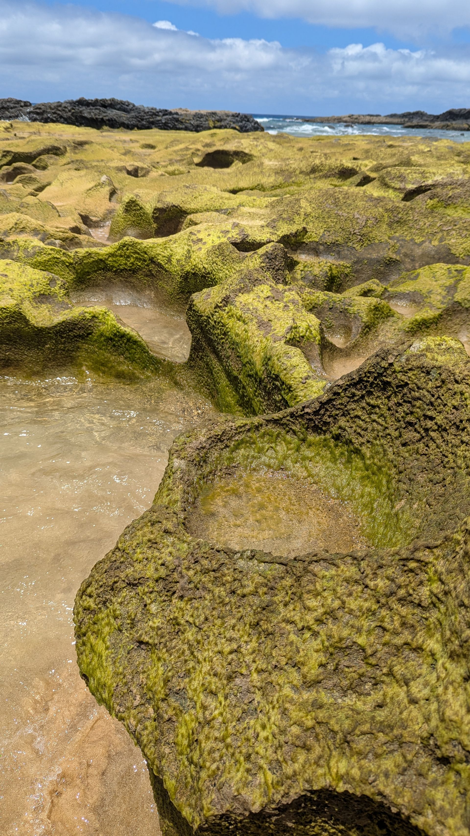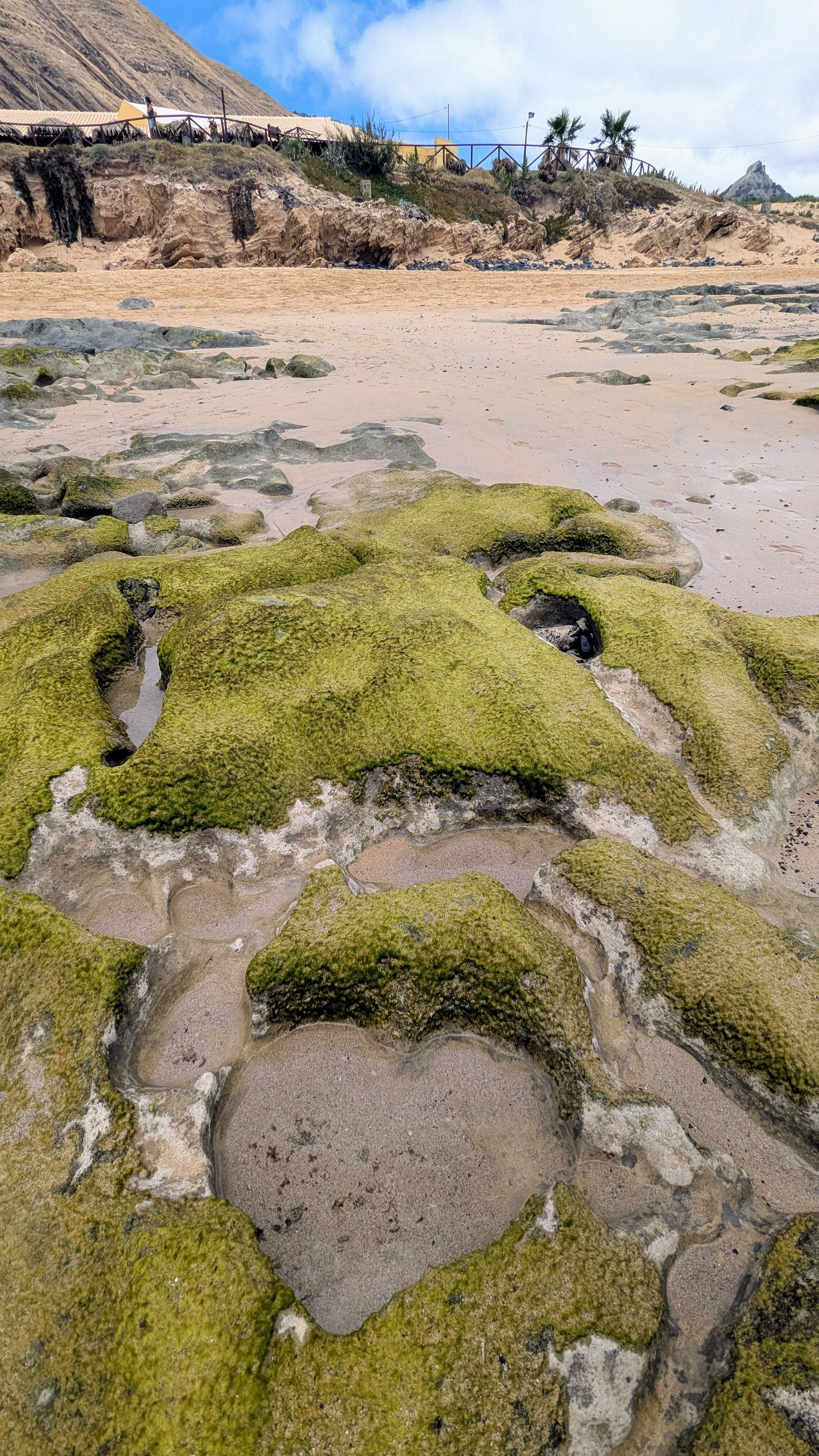 Durch die Ebbe sind die veralgten schwarzen Vulkanfelsen alle freigelegt, was die Algen im Sonnenlicht giftgrün aussehen lässt und einem "Feenreich" ähnelt, wenn man sich die vielen Rillen und kreisrunde vulkanisch geformte Minibecken anschaut.