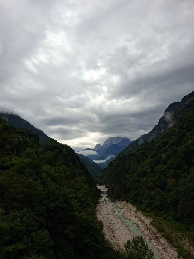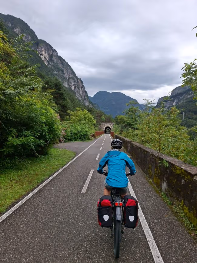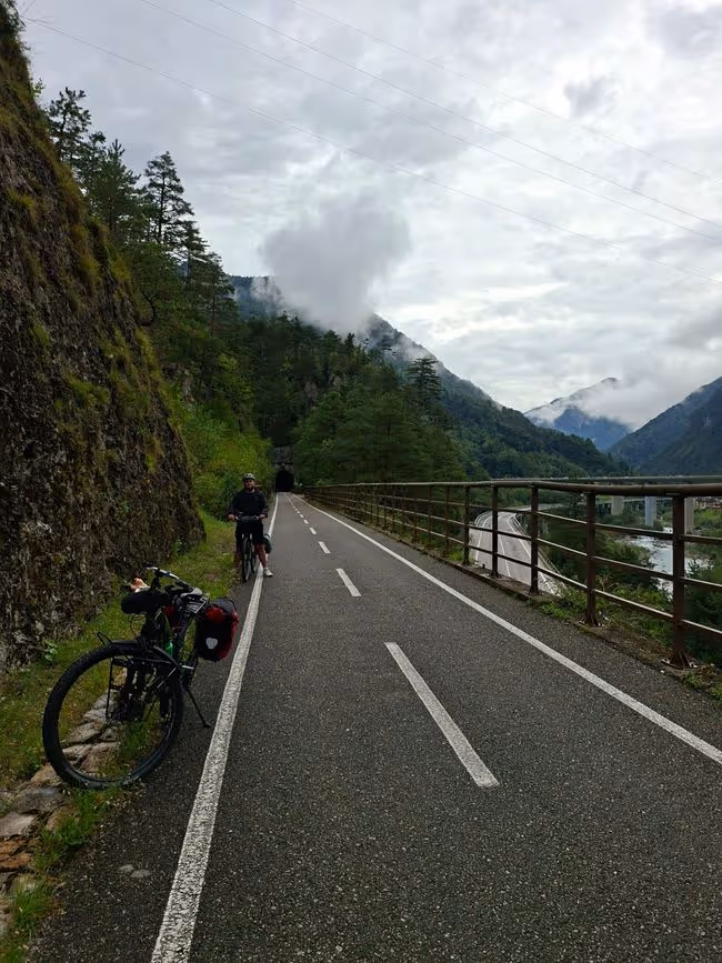 Heute wäre eigentlich eine sehr schöne Strecke gewesen. Die letzten Bergblicke, wildes Wasser kaum Strasse und viele Tunnel. Wir mussten nicht gleich bei Regen losfahren, sondern sind erst nach ca 2 Stunden geduscht worden. Mir war das erste Mal auf dieser Tour richtig kalt. Es ging fast nur bergab, mit Schwitzen war also nichts. In Gemona angekommen gönnten wir uns einen Tee und kamen auf die Idee, morgen die letzten beiden Etappen zusammen zu legen. Wir wollen nochmal ordentlich strampeln und dann hoffentlich das Erlebnis Sonne und Meer genießen zu können. Gerade als wir die Unterkunft erreicht haben, fing es erneut an heftig zu regnen und gewittern. Glück gehabt.