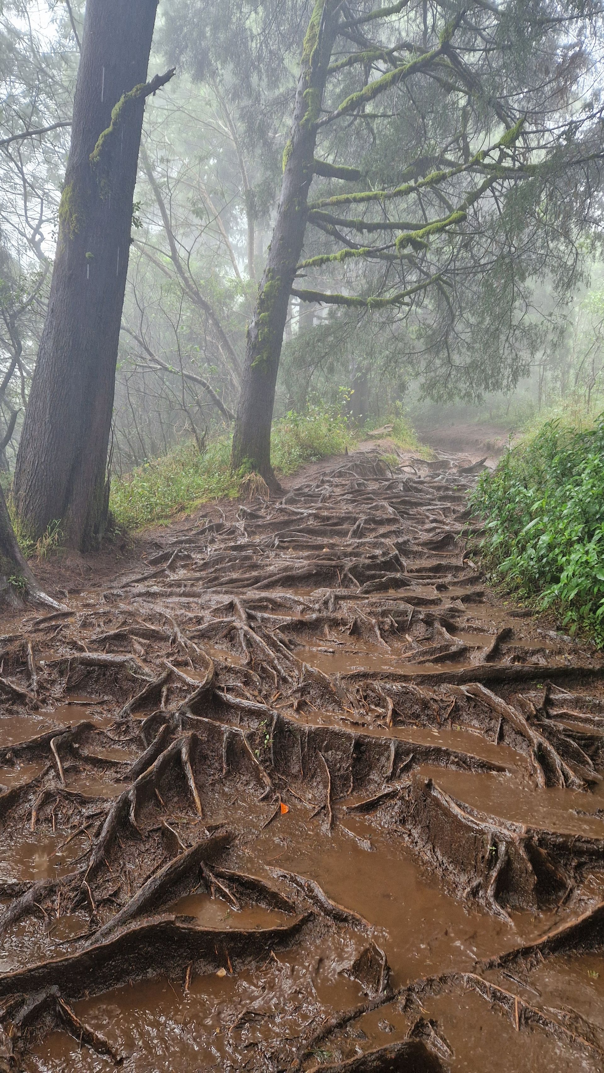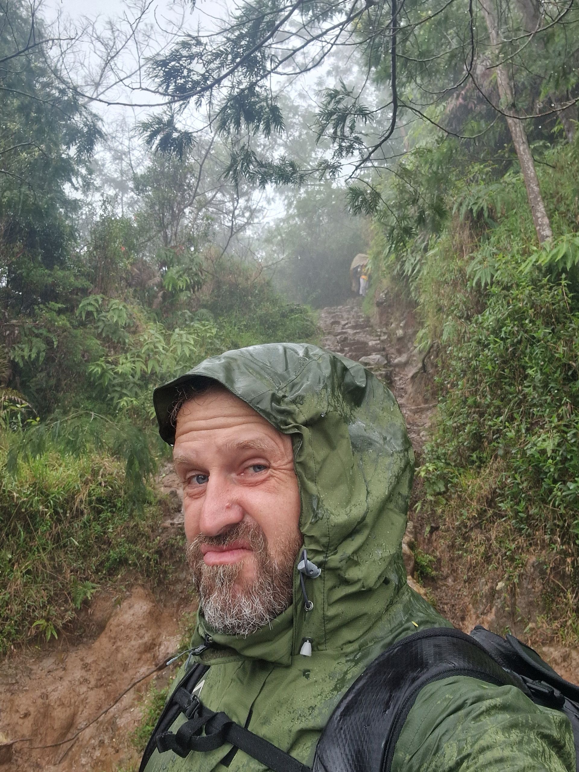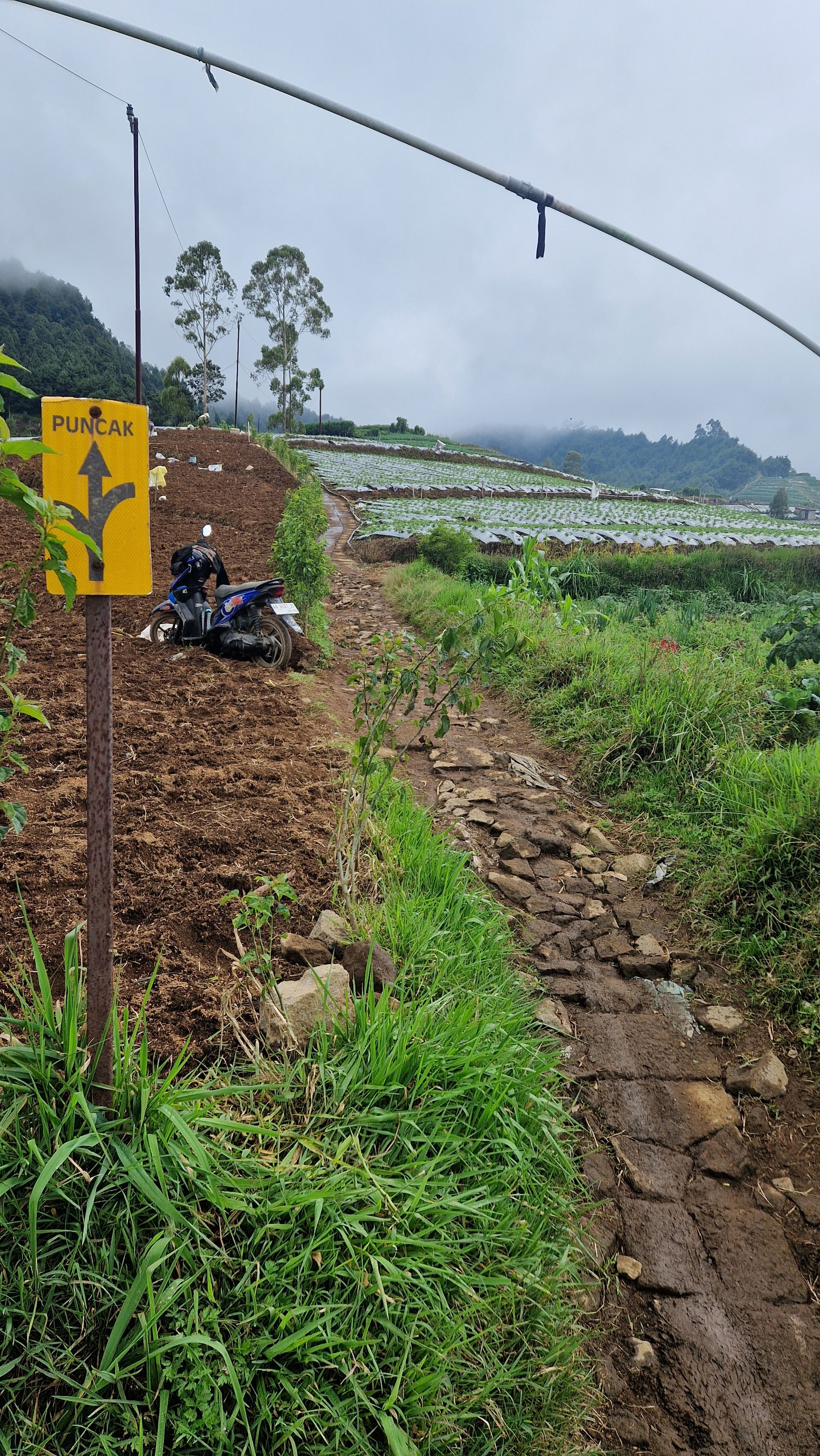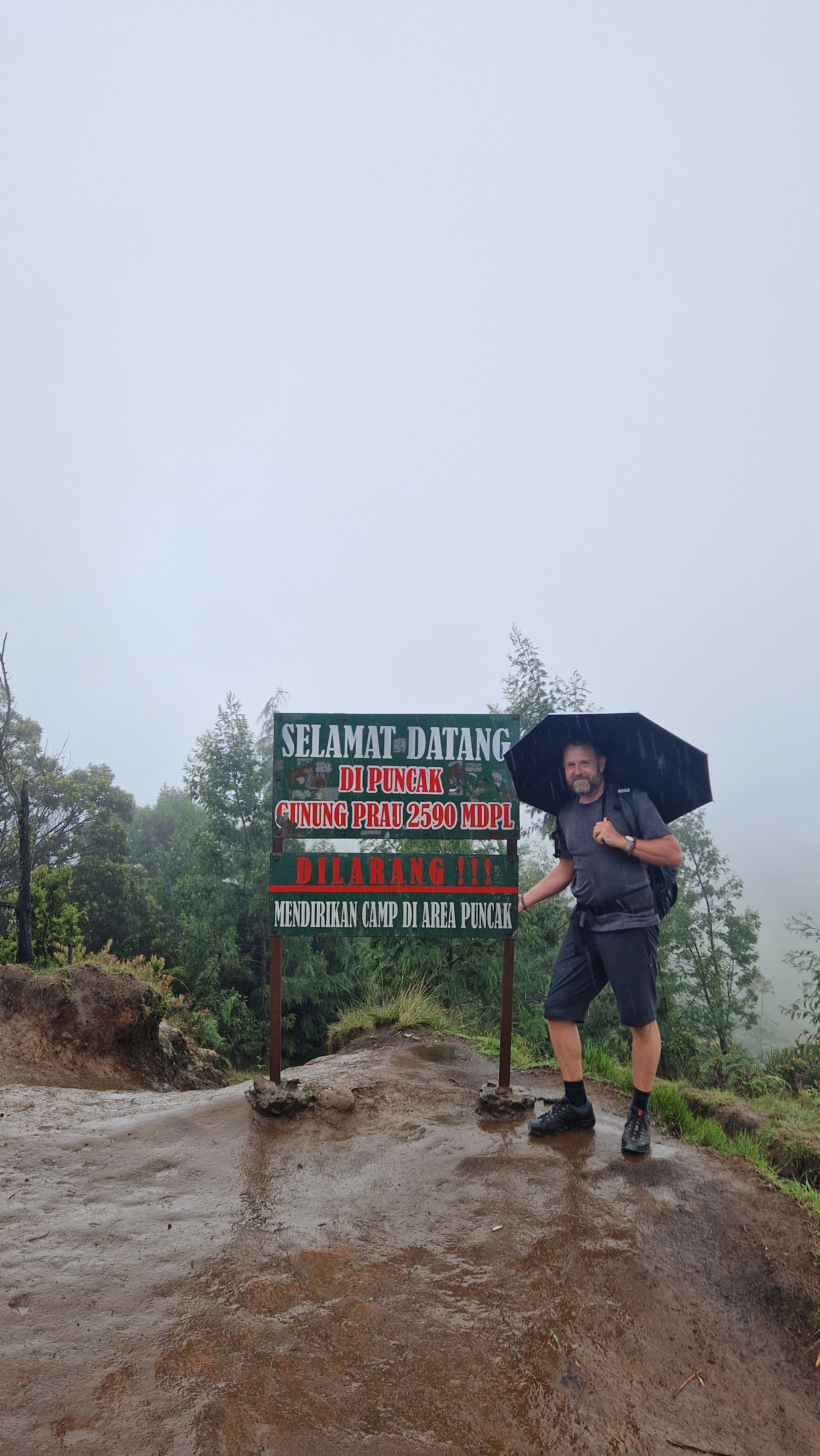 Den folgenden Tag saß ich bei leichtem Nieselregen zum Frühstück. Entschied mich dann dennoch für eine Wanderung zum Prau-Gipfel. Dabei ließ ich Dieng hinter mir, durchwanderte die Kartoffelfelder, welche sich rund um Dieng an den Hängen schmiegten, wurde hier wieder herzlich von den Bauern und Bäuerinnen begrüßt, bevor ich irgendwann den Wald erreichte. Und dann, wie sollte es auch anders sein, begann es zu regnen und es hörte auch in den nächsten 3 Stunden, nicht mehr auf. Der Weg war nur noch eine Mischung aus Bachwasser und Schlamm. Kurz vor dem Gipfel hörte es 10 Minuten auf, Zeit für eine Rast. Anschließend sollte genau da, wo kein Baum mehr war, weit und breit, ein Gewitter einsetzen. So begann ich umgehend meinen Abstieg, die Aussicht hier oben war eh gleich null.