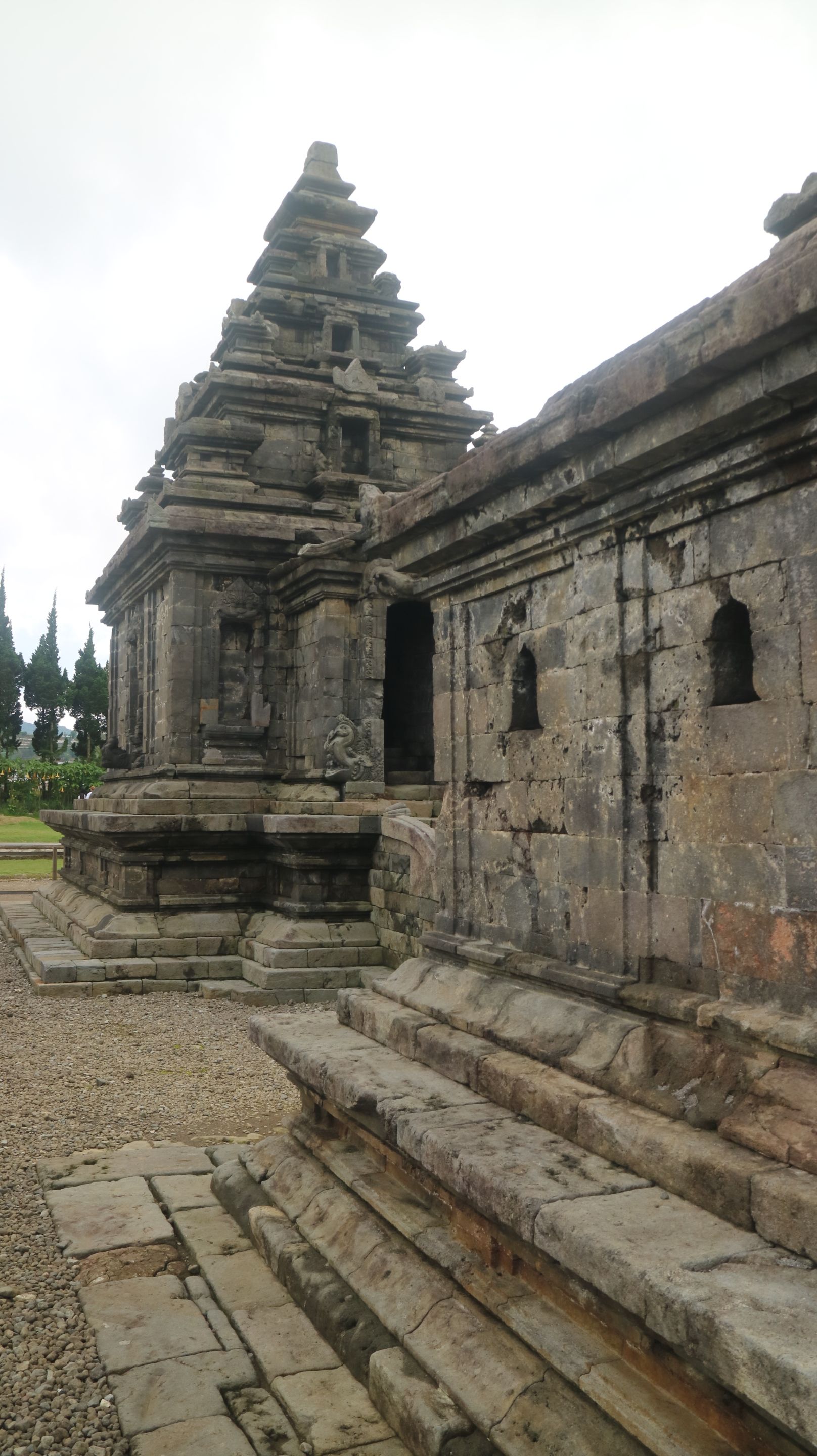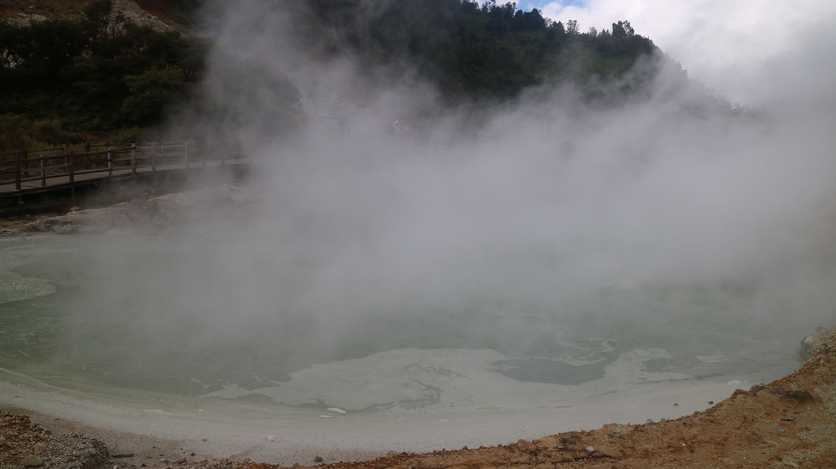 Ich verließ die Stadt am übernächsten Tag, zuerst erneut mit dem Zug, aber nur eine Station, also 30 Minuten. Von hier rief ich ein Grab-Taxi. In welchem ich mich aus Gewohnheit anschnallte, es aber zu piepsen begann, der Fahrer ausstieg, zu mir kam und erklärte, das geht so nicht, da es sonst die ganze Zeit weiter piepst. Also abschnallen. Es ging hier die nächsten 2 Stunden nur bergauf, über teils abenteuerliche Steigungen. Ich bin mir aber bis heute nicht sicher, ob mein Fahrer nicht fahren konnte oder ob der Motor zu schwach war. Der Motor heulte ständig im ersten Gang bei 5 bis 6 000 Umdrehungen. Die ersten zwei Drittel der Strecke, führten dabei direkt durch einen exotischen Garten. Mais, Kaffee, Mango, Kartoffeln, Reis, Kakao, Durian und noch vieles mehr wuchs am Wegesrand. Ich stand dann endlich bei 18 Grad in Dieng und spazierte hier am Nachmittag noch zum nahen Sikidang-Krater und Ajuna-Tempel.