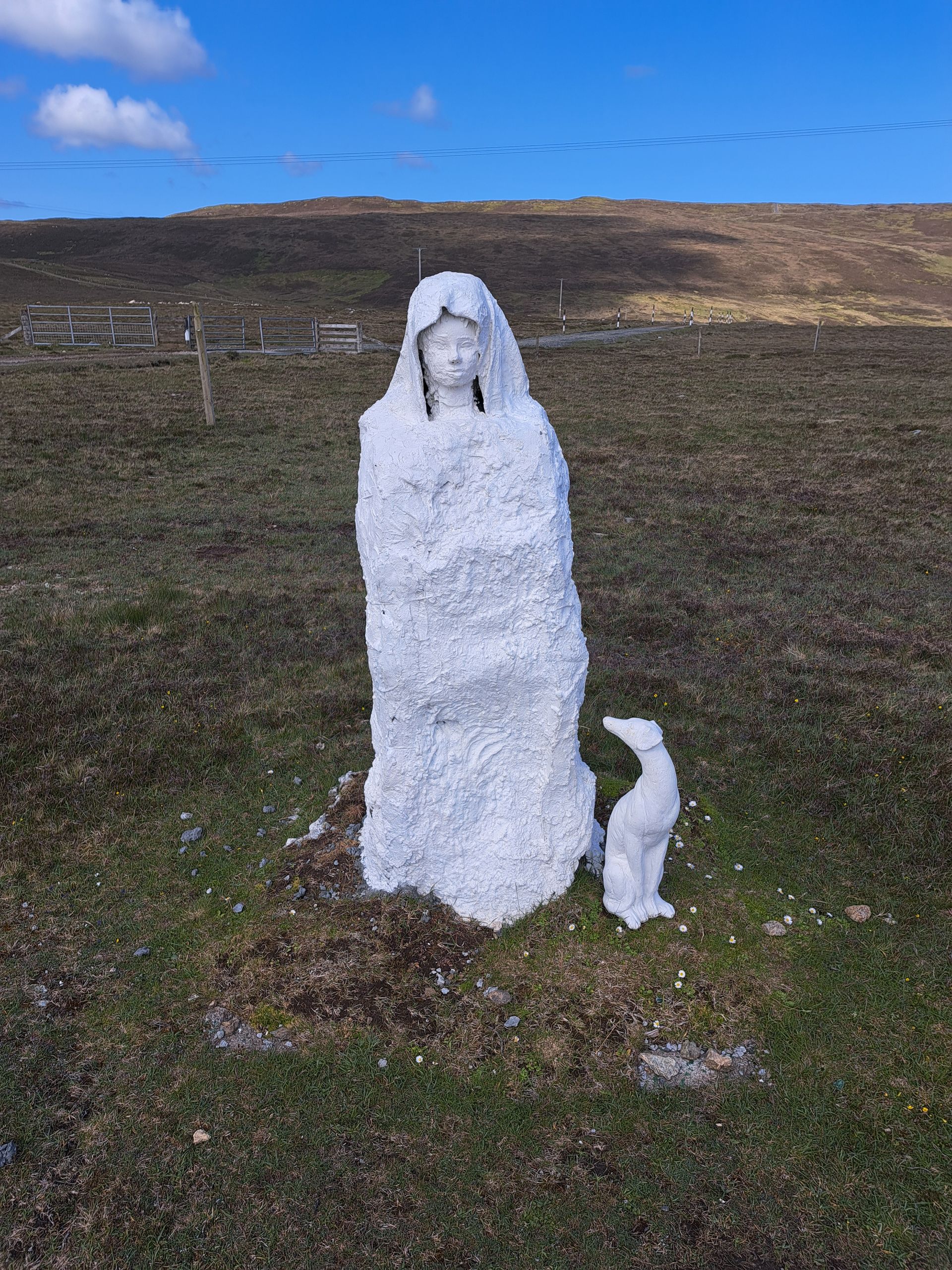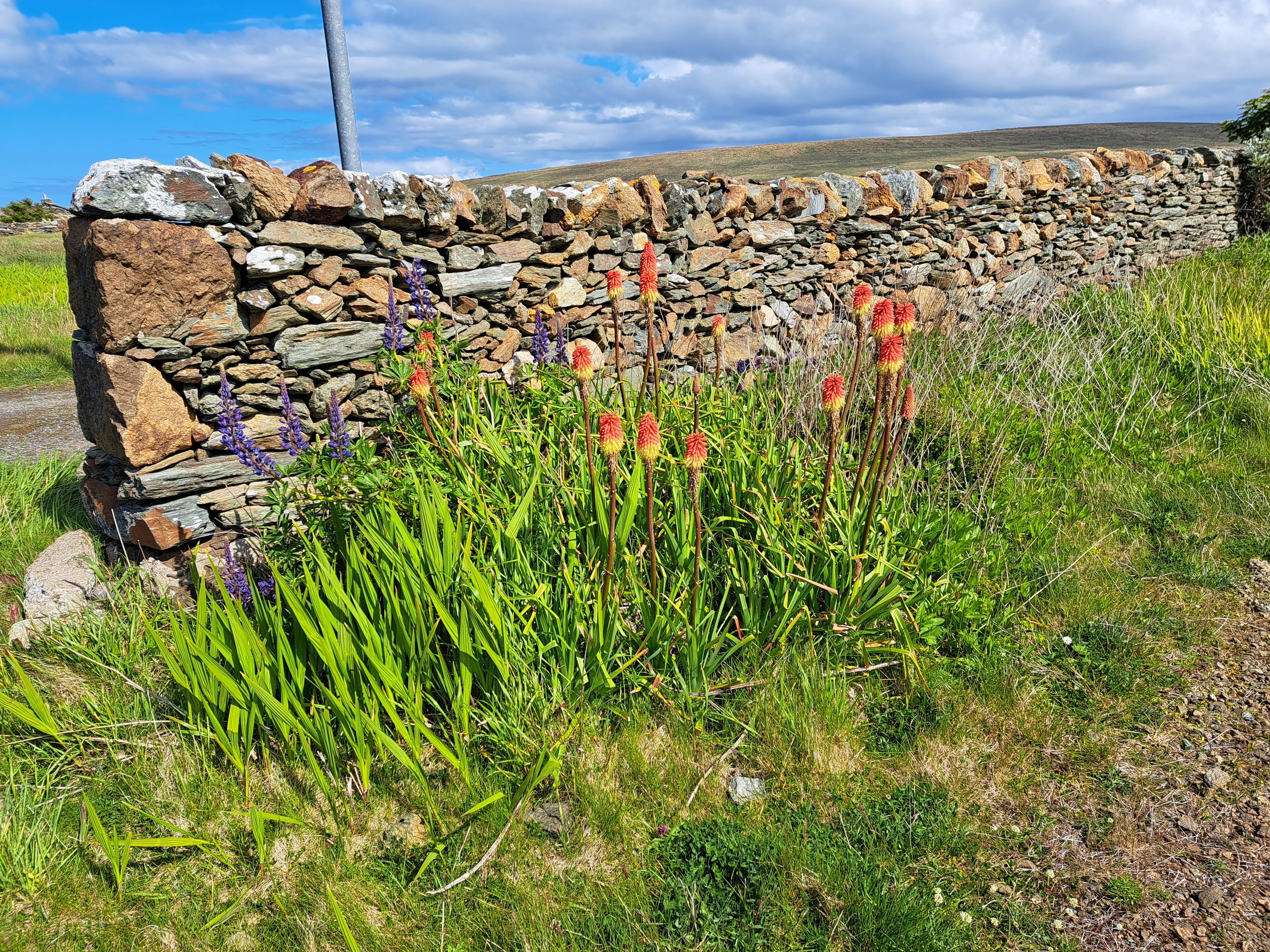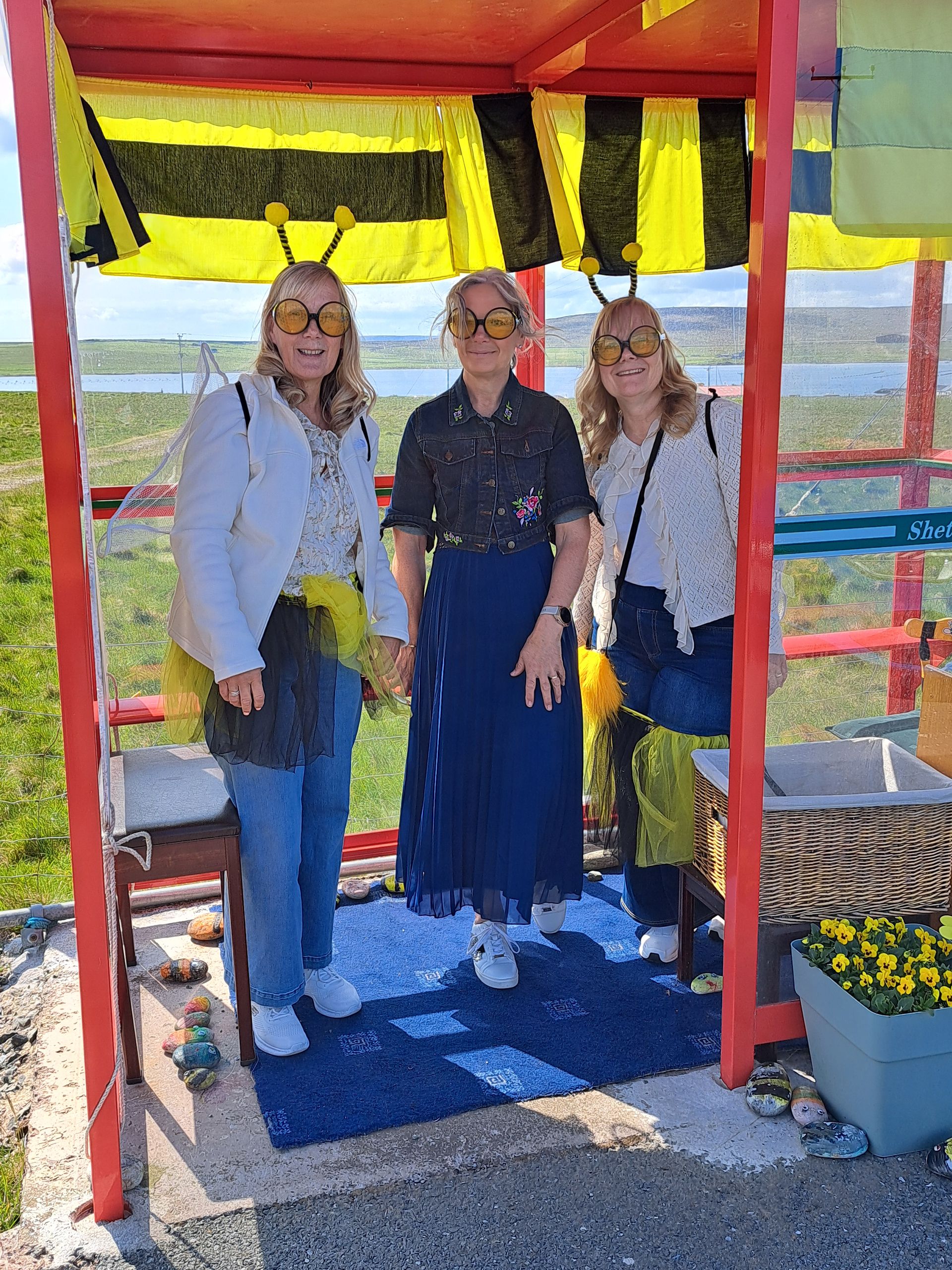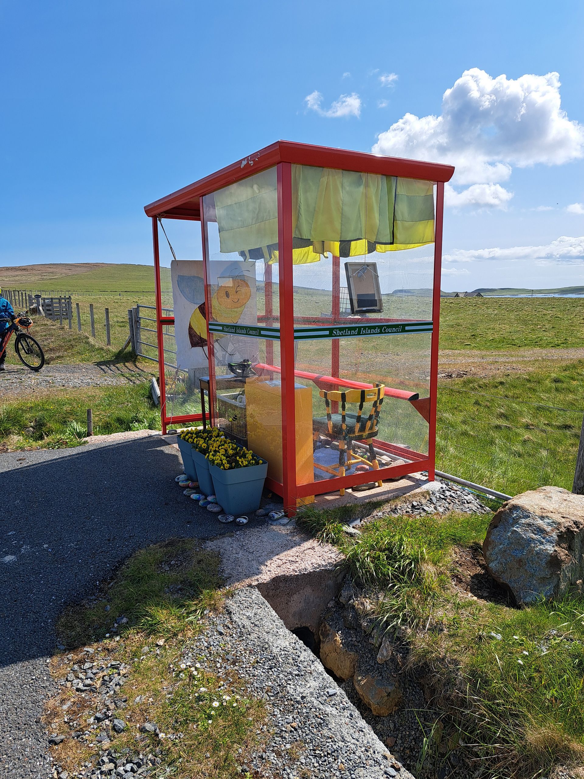 Die ersten Shetland-Pony werden gesichtet. Wir besichtigen eine Kirche und dann den ersten Lebensmittel-Laden, den wir sehen. Ich kaufe einen kleinen Whisky fürs Anstossen am Ziel. Dann die erste Attraktion: Bobbys Bus Shelter. Ein Bub hatte sich beschwert, dass "sein" Bushäuschen entfernt wurde. Daraufhin wurde es wieder aufgestellt, und viele Menschen brachten Gegenstände mit, die einem das Warten auf den Bus angenehmer machen, zB einen Stuhl oder eine Dekoration. Das hat sich zum Selbstläufer entwickelt, und 2025 steht im Zeichen der Biene, siehe Bilder.