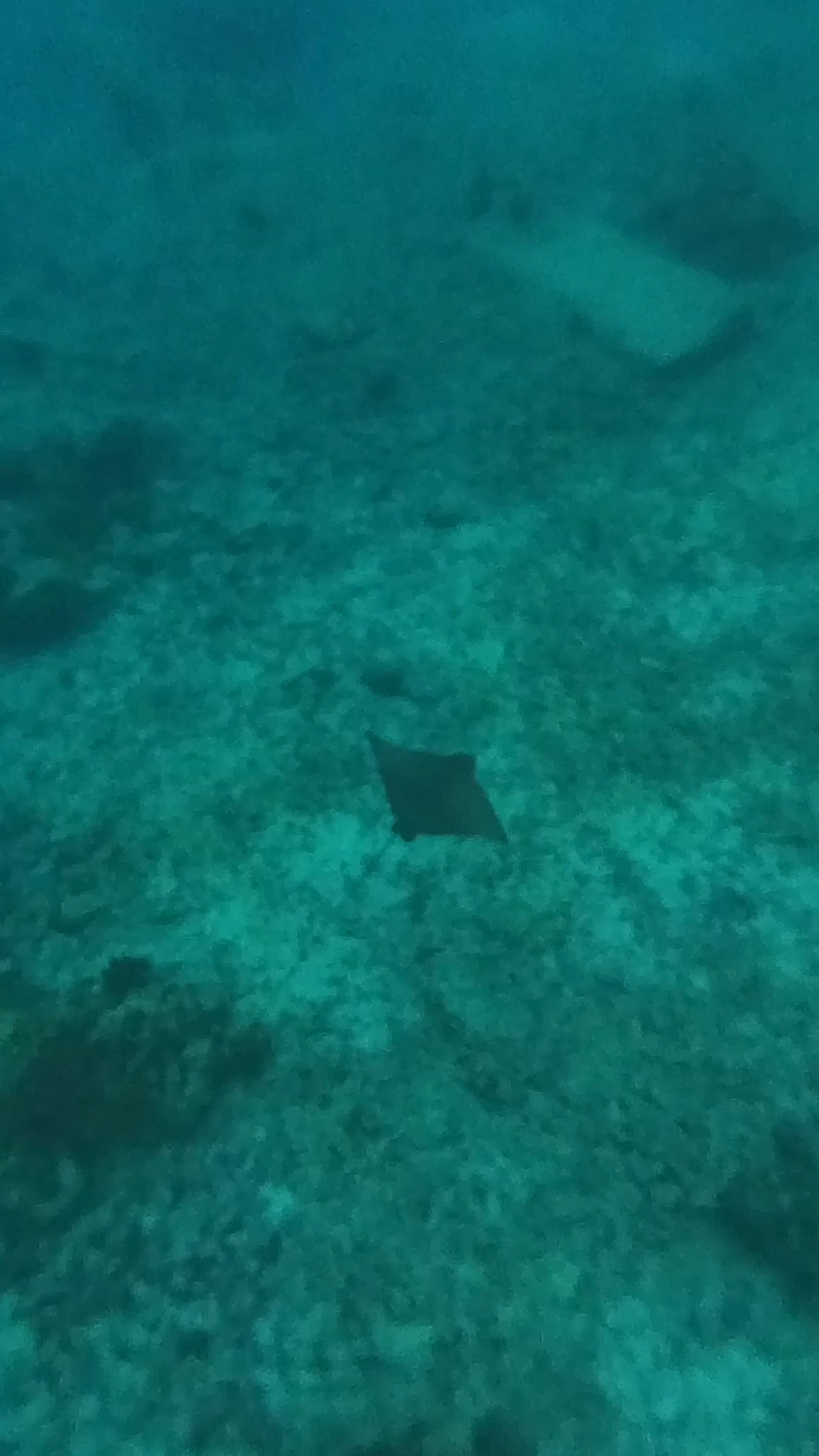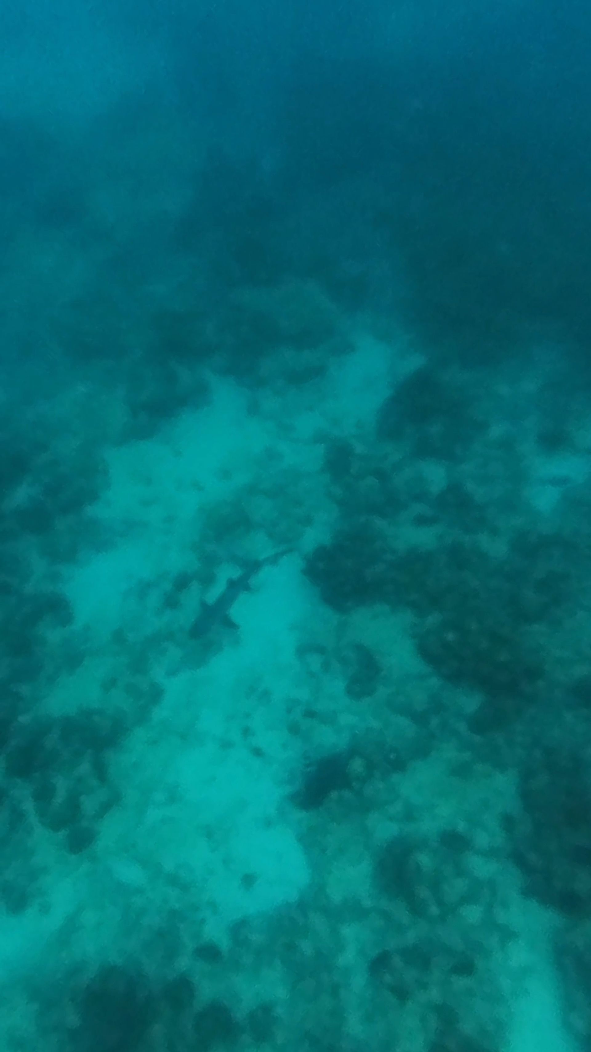 Die Sicht war ein bisschen getrübt, doch dann ein dumpfer Schrei und wildes Gewinke unter Wasser, um Rolis Aufmerksamkeit zu erlangen. Tanja hatte einen kleinen Weißflossen-Riffhai entdeckt, der gemütlich seine Abendessenrunden zog.