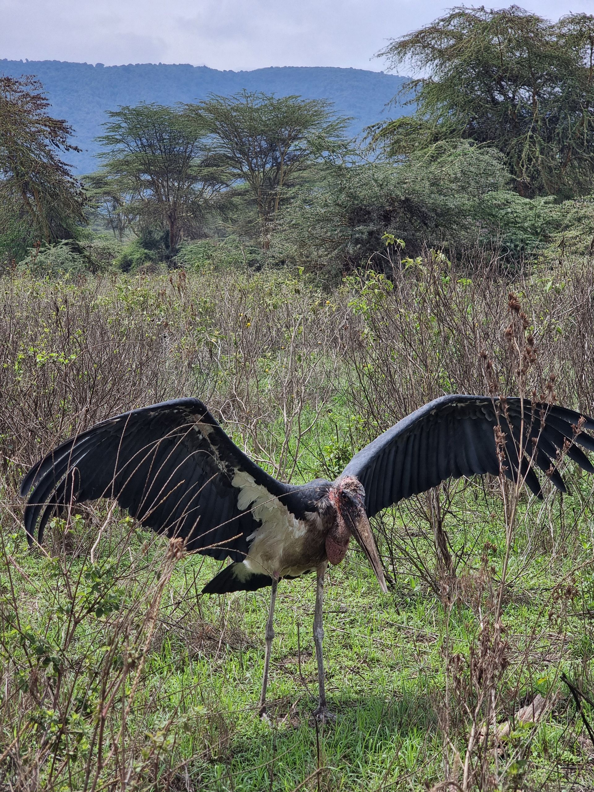 Beim Mittagessen blinzelte dann die Sonne durch und wir bekamen Besuch von einem selbstbewussten, aber hässlichen, Marabu Storch - Mitglied der sogenannten "Ugly 5".