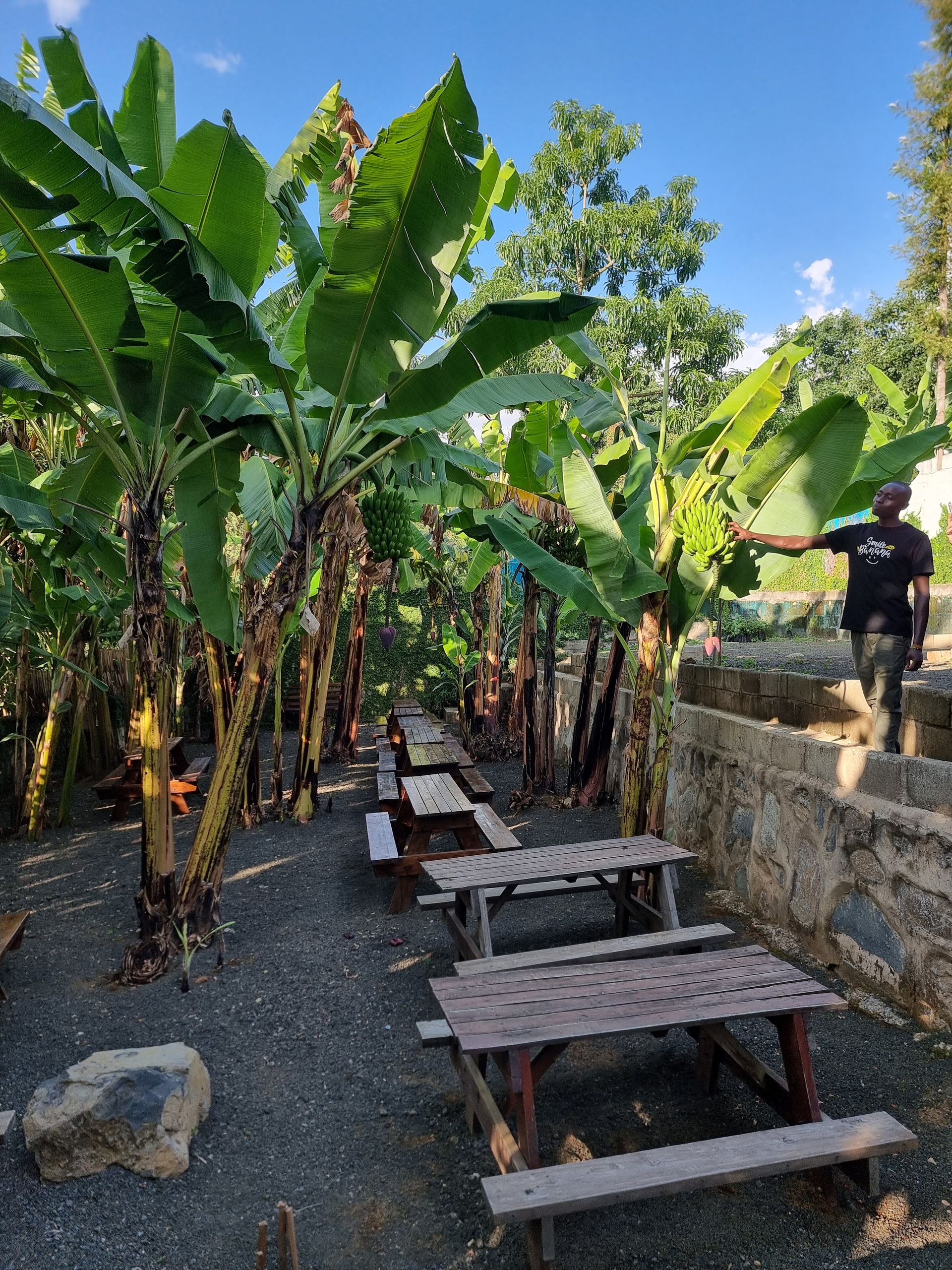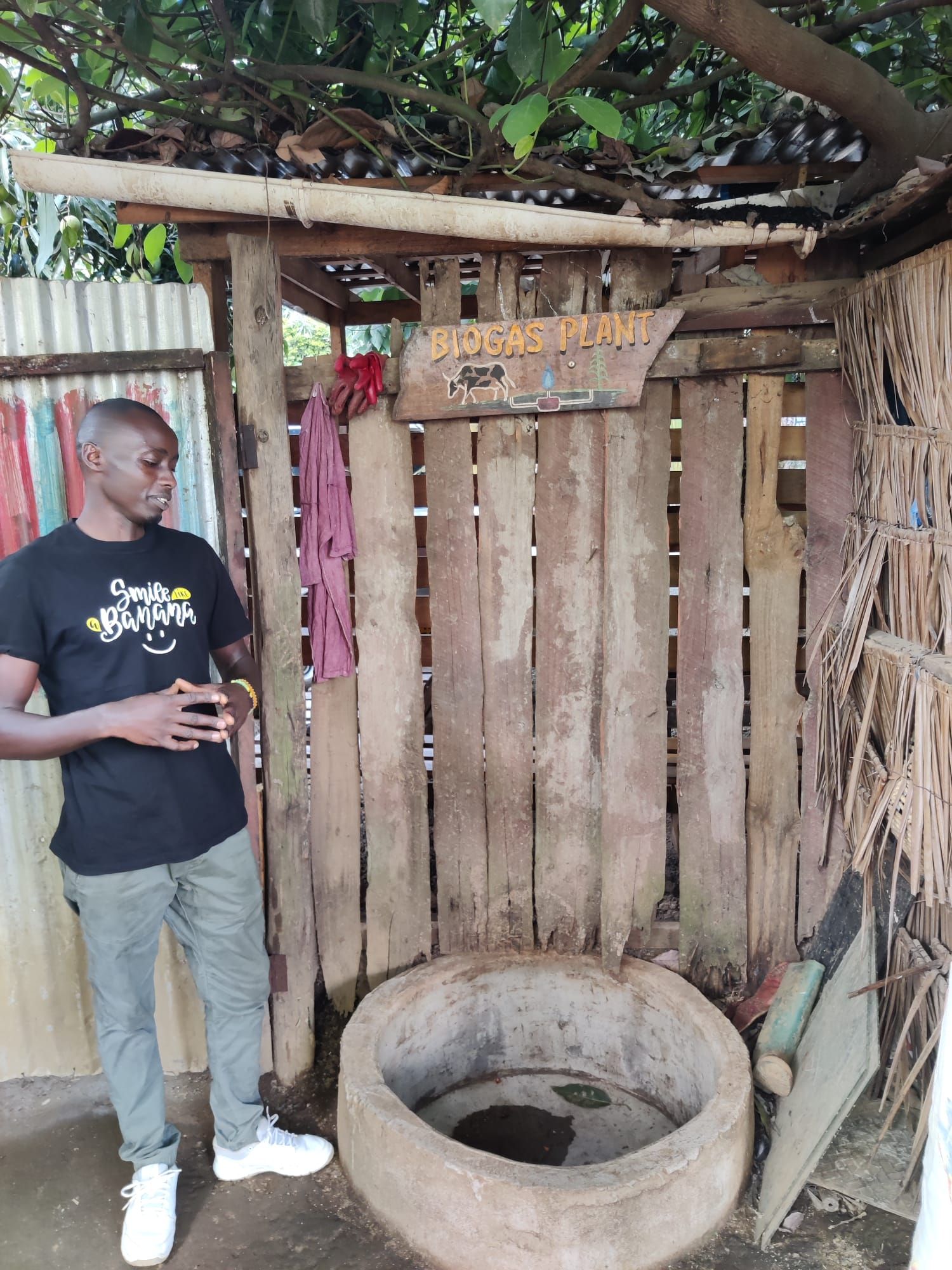 Kühe, Ziegen und Hühner für Milch, Fleisch und Eier und vor allem für die hauseigene Biogasanlage. Ausscheidungen der Tiere werden in einem Behälter gesammelt und Bakterien vergasen diese, sodass das entstehende Gas unter anderem zum Kochen und Wasser aufheizen verwendet werden kann. Das Herzstück der Farm ist die Bananenplantage mit 16 verschieden Bananensorten zum Kochen, Essen und Frittieren.