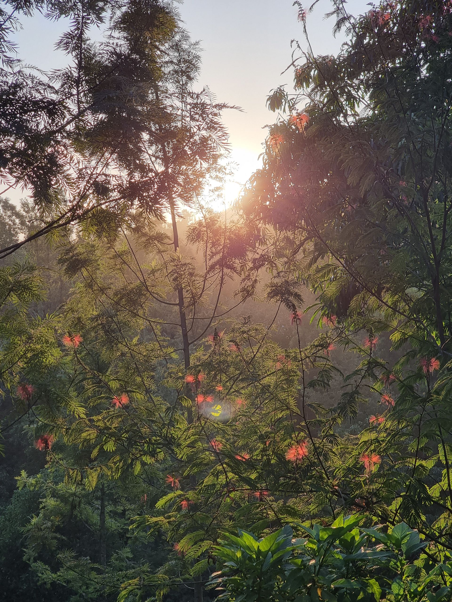 Mit der Erwartung frische Bananen, Avocados, Mangos, Papaya und Co aus eigenem Anbau, sowie selbstgemachten Kaffee genießen zu können, setzten wir uns in den Frühstücksraum, der direkt an die offene Küche grenzte. Wir waren die einzigen Gäste. Auf allen anderen Tischen stapelte sich das benutzte Geschirr, dreckige Gläser und Tassen. Nach einigen Minuten kam der Koch, gleichzeitig Kellner, und fragte, was wir denn gern frühstücken würden, doch Auswahl hatte er keine für uns. Es gab ein vorgefertigtes Frühstücksteller mit Ei, Teigtaschen und einem Bananenpancake. Der Koch hatte keinen Stress und so warteten wir 30 min auf unser einfach gehaltenes aber leckeres Frühstück. Auch unser Kaffee und Tee wurden mit viel Hingabe - 45 min lang - zubereitet und so konnten wir diesen erst nach dem Frühstück genießen.