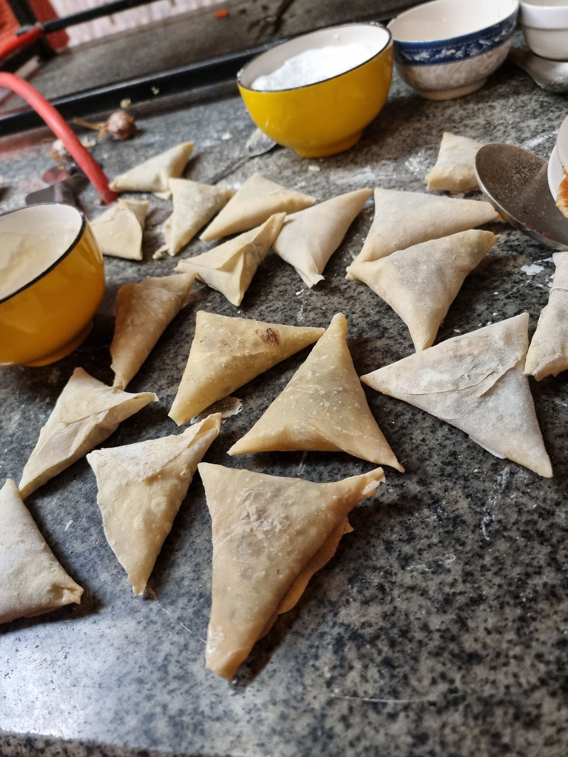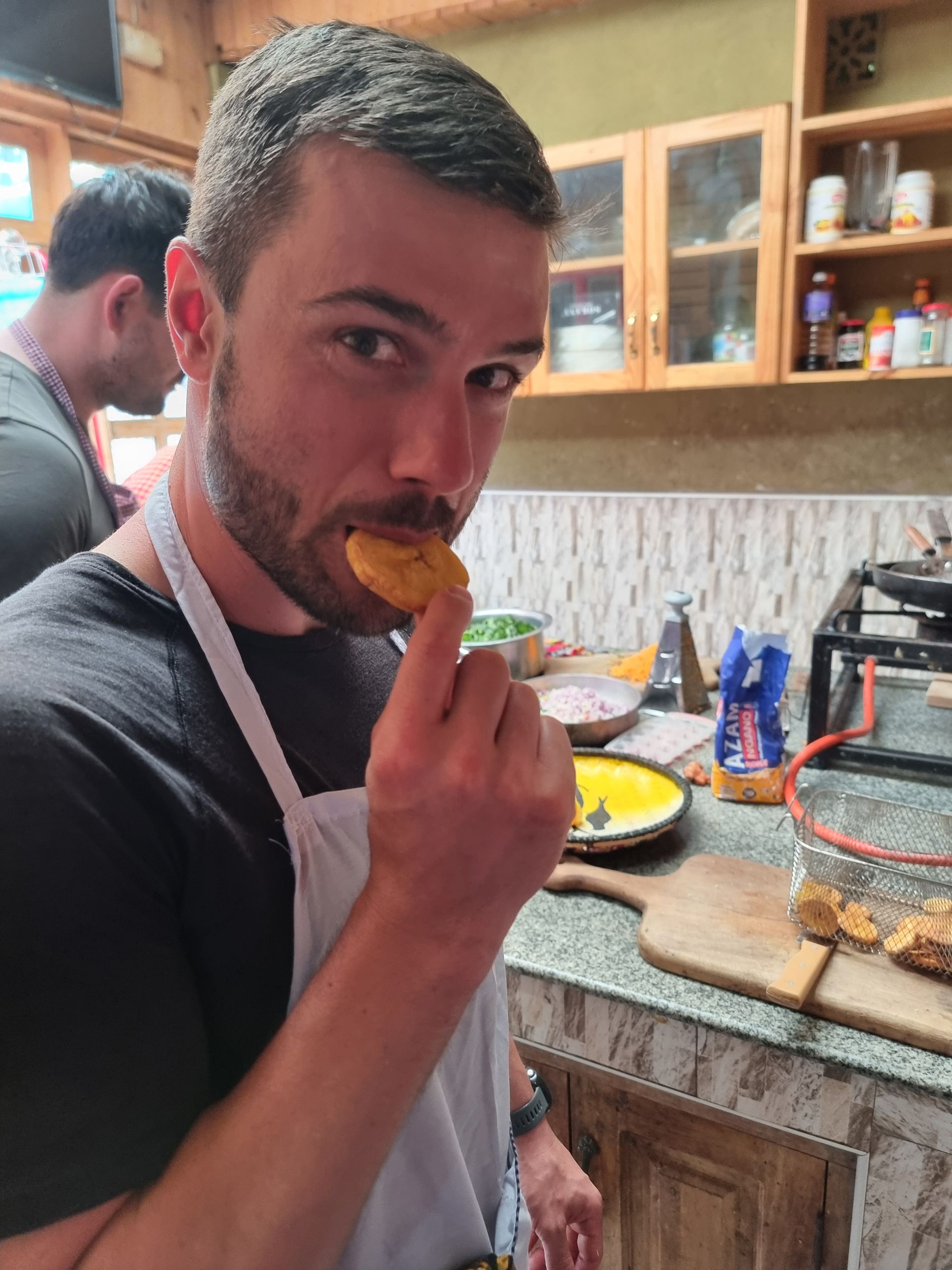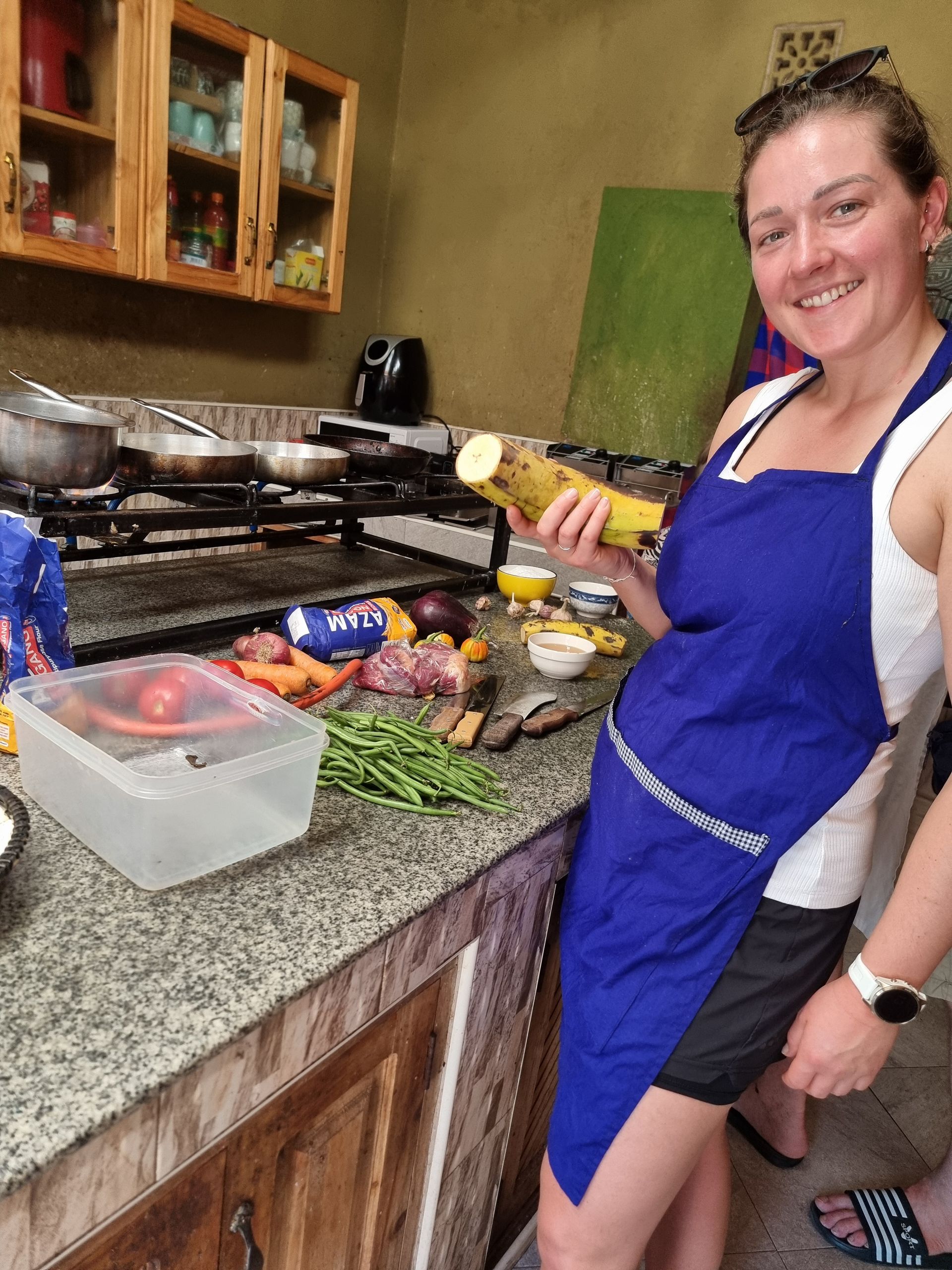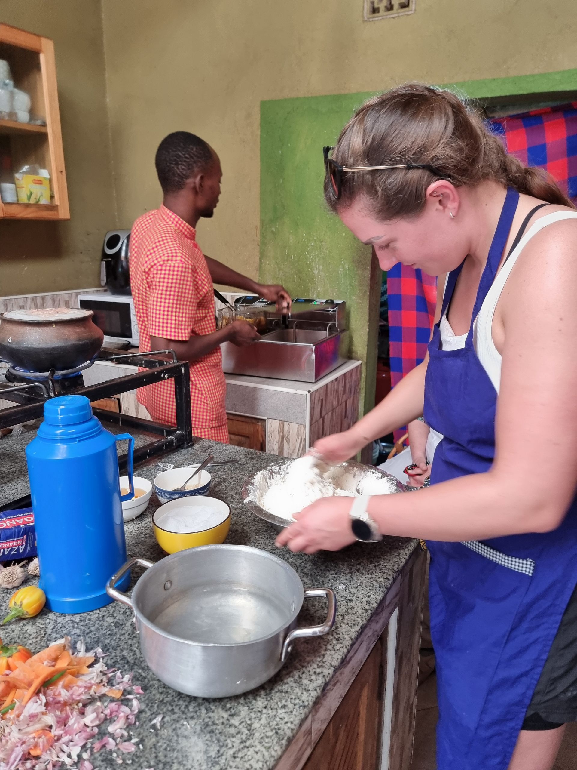 Vom Kochkurs waren wir mega begeistert. Ein motivierter Koch mit Leidenschaft und Händchen für die tansanische Küche brachte uns bei, wie man Bananenchips, gefüllte Samosa, Naanbrot, gekochter Blattspinat, heimisches Gemüse und Beefstew zubereitete. Roli bewährte sich beim Naanbrot ausrollen und Tanja beim Teigtaschenfalten.