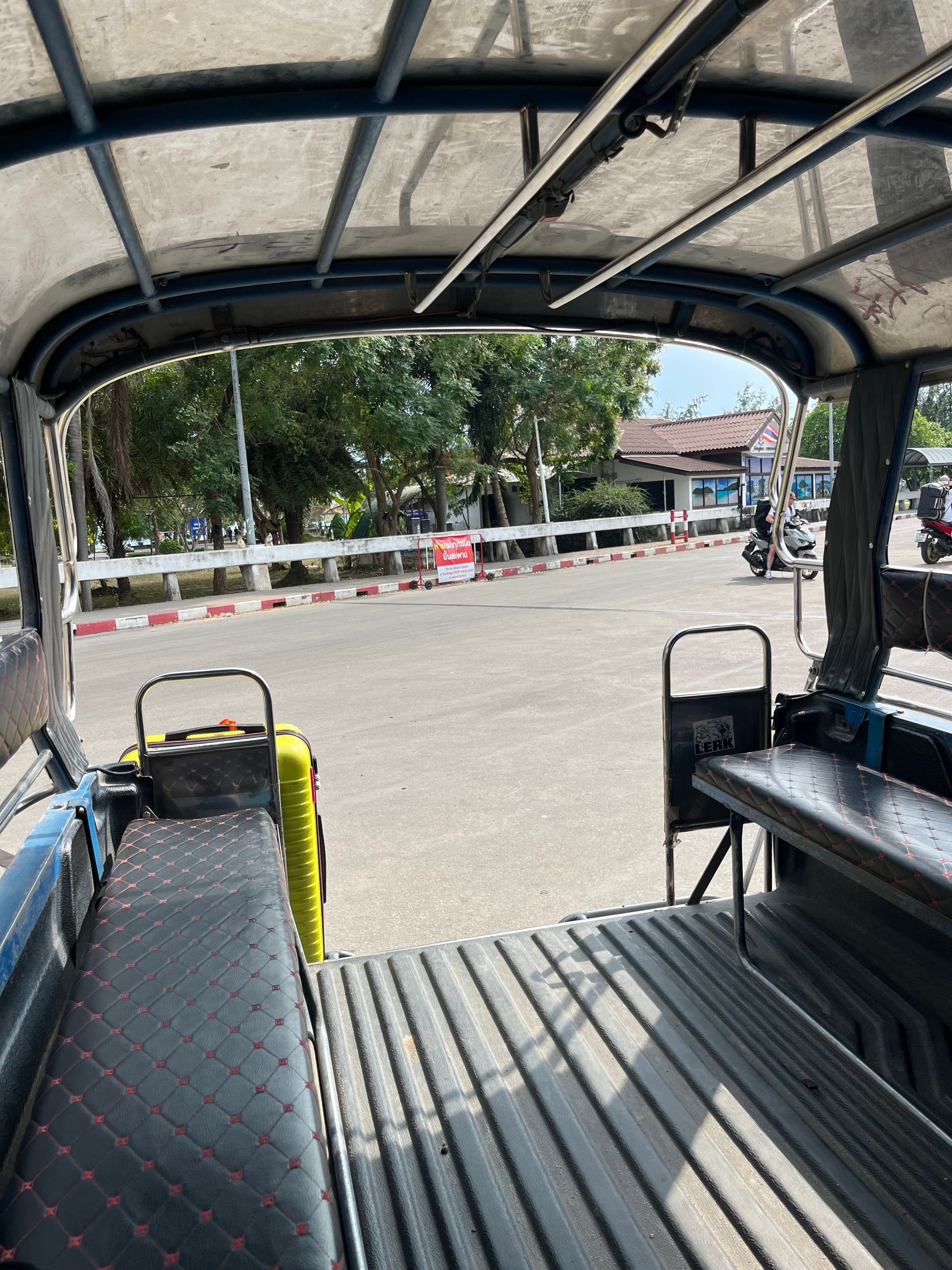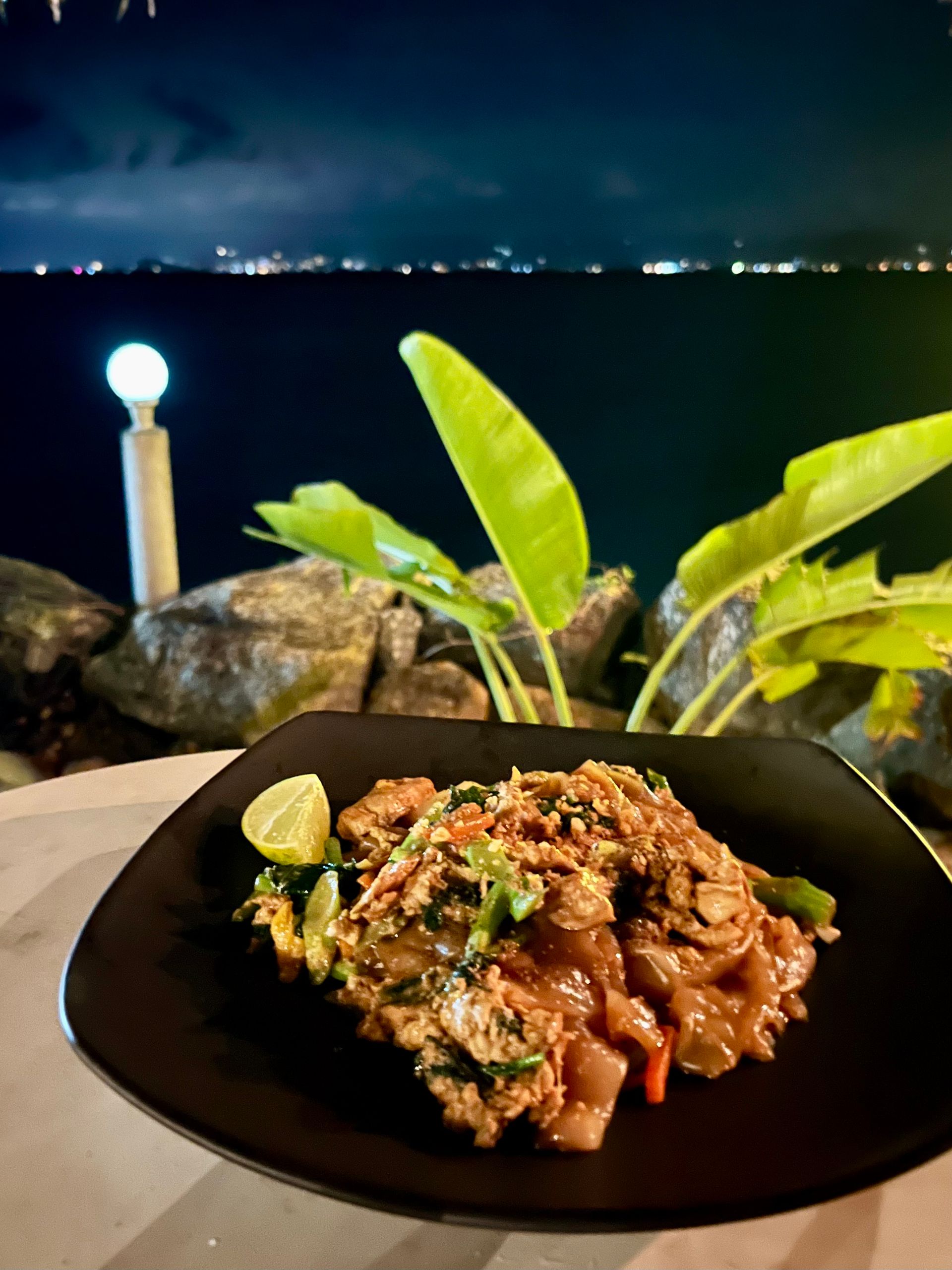 Am Tag der Anreise storniert meine Gastgeberin plötzlich meinen Aufenthalt…! Meine S-Bahn hat so viel Verspätung, dass ich trotz großzügig eingeplantem „Puffer“ meinen Anschluss nach Frankfurt verpasse. Der Folgezug kommt nur mit der Hälfte der Waggons - aber wieder einmal mit viel Glück ergattere ich einen Sitzplatz, inkl. nettem Sitznachbarn. Der Rest verläuft nach Plan, 12:20 Stunden Flug nach Singapur (ich - schon immer große Freundin des gepflegten Mittagsschlafs - kann einfach nicht schlafen!), 1 Stunde Aufenthalt (wovon ich mindestens 20 Minuten für den Weg gebraucht habe), 2 Stunden Flug nach Koh Samui, ein Transfer zum Hafen und von dort mit der Fähre nach Koh Phangan. Leider warten dort nicht wie früher Menschen, die Unterkünfte anbieten. Also erstmal ein Restaurant mit WLAN suchen, und bei einem Glasnudel-Salat mit Hähnchen & einem kalten, thailändischem Bier nach einem Platz zum Schlafen suchen - diesmal natürlich auf einer anderen Plattform. Und siehe da, ungefähr dort, wo ich hinwollte, wird mir etwas angezeigt, das ich mir leisten kann - gebucht! Ich besteige ein „Songthaew“ (Gruppentaxi mit 2 gegenüberliegenden Sitzbänken auf der Ladefläche - Sicherheitsgurte etc. interessieren hier niemanden), und werde wenige Minuten später an der Hauptstraße, die parallel zum Strand verläuft rausgelassen. Ich stehe vor einem Restaurant (naja, eher Imbiss, offen zur Straße hin), daneben eine Art breiter Durchgang zum Strand. Ich werde begrüßt von meinem sehr netten Vermieter David, und einquartiert in einem Bungalow, dessen Glasfront zum Meer zeigt, von dem mich nur ein paar Meter trennen. Ein kleines Paradies mit Hängematte, Sitzgelegenheiten, und einem zauberhaften Bambus-Pavillon direkt am Wasser…
