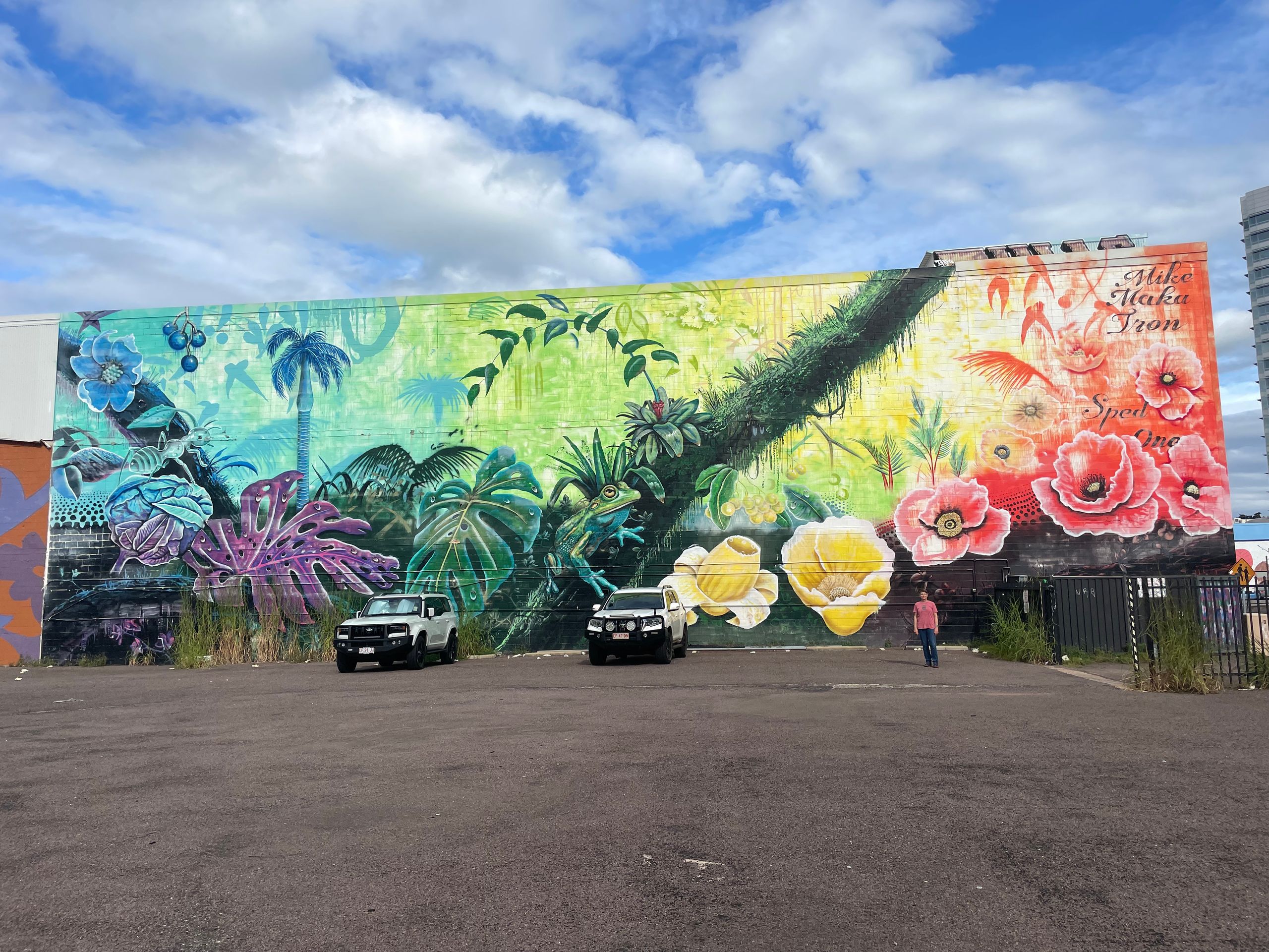 Darwin ist, zumindest zu dieser Jahreszeit, ein sehr geruhsames Örtchen. Dass hier 135.000 Menschen leben sollen, ist kaum zu glauben. Richtige Wow-Momente hatten wir zwar noch keine, aber hier kann man erst mal ganz entspannt ankommen. Was uns am besten gefallen hat, waren die vielfältige Street Art sowie der tropische Regenwald. Der greift selbst in der Innenstadt immer wieder um sich: Üppige Bäume und Sträucher, Fliegende Hunde und fremdartige Insekten.