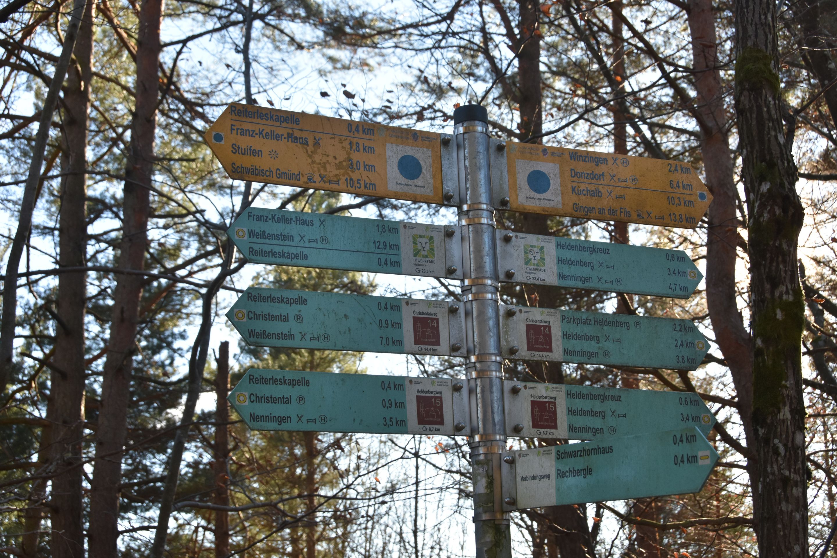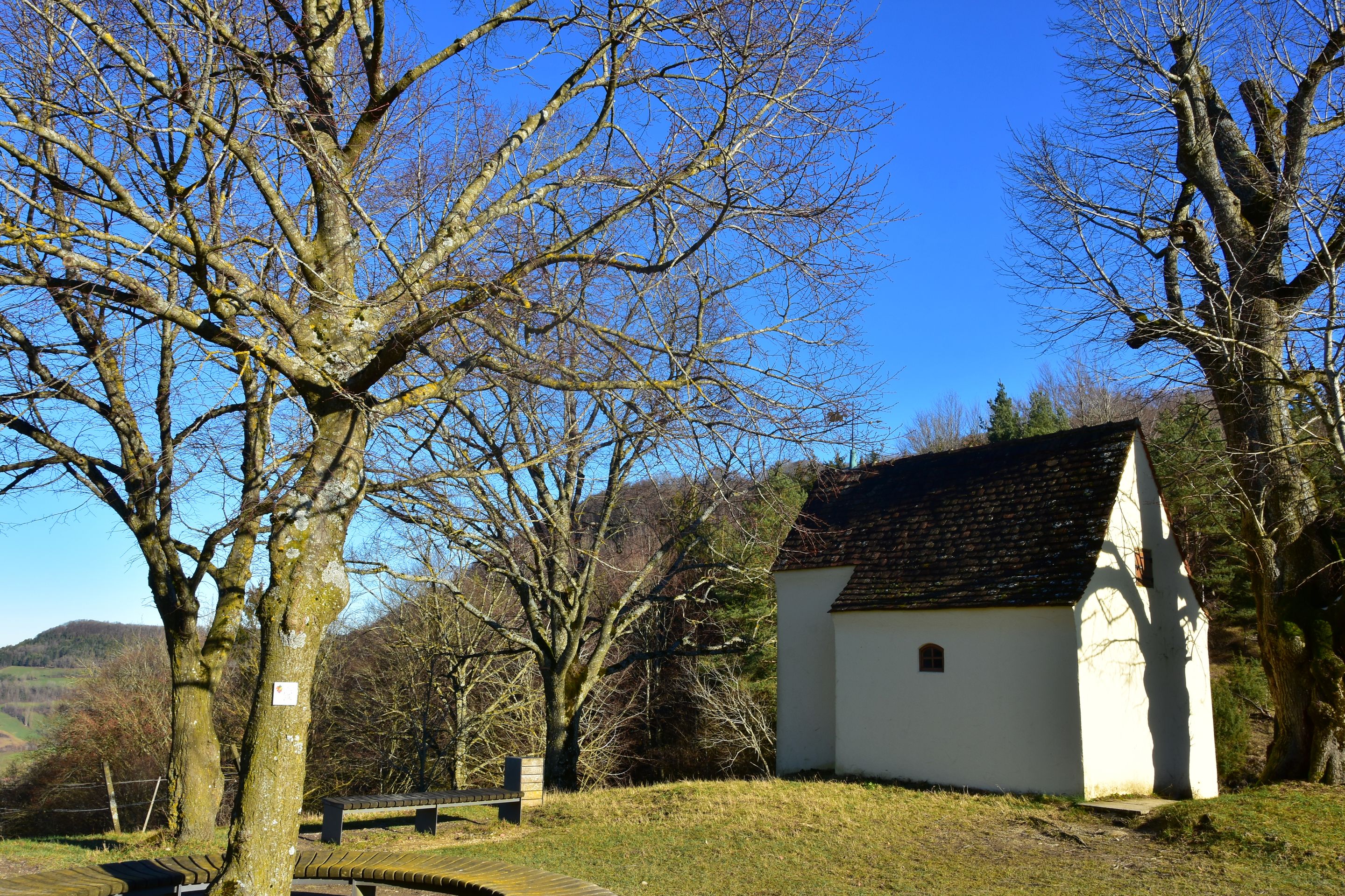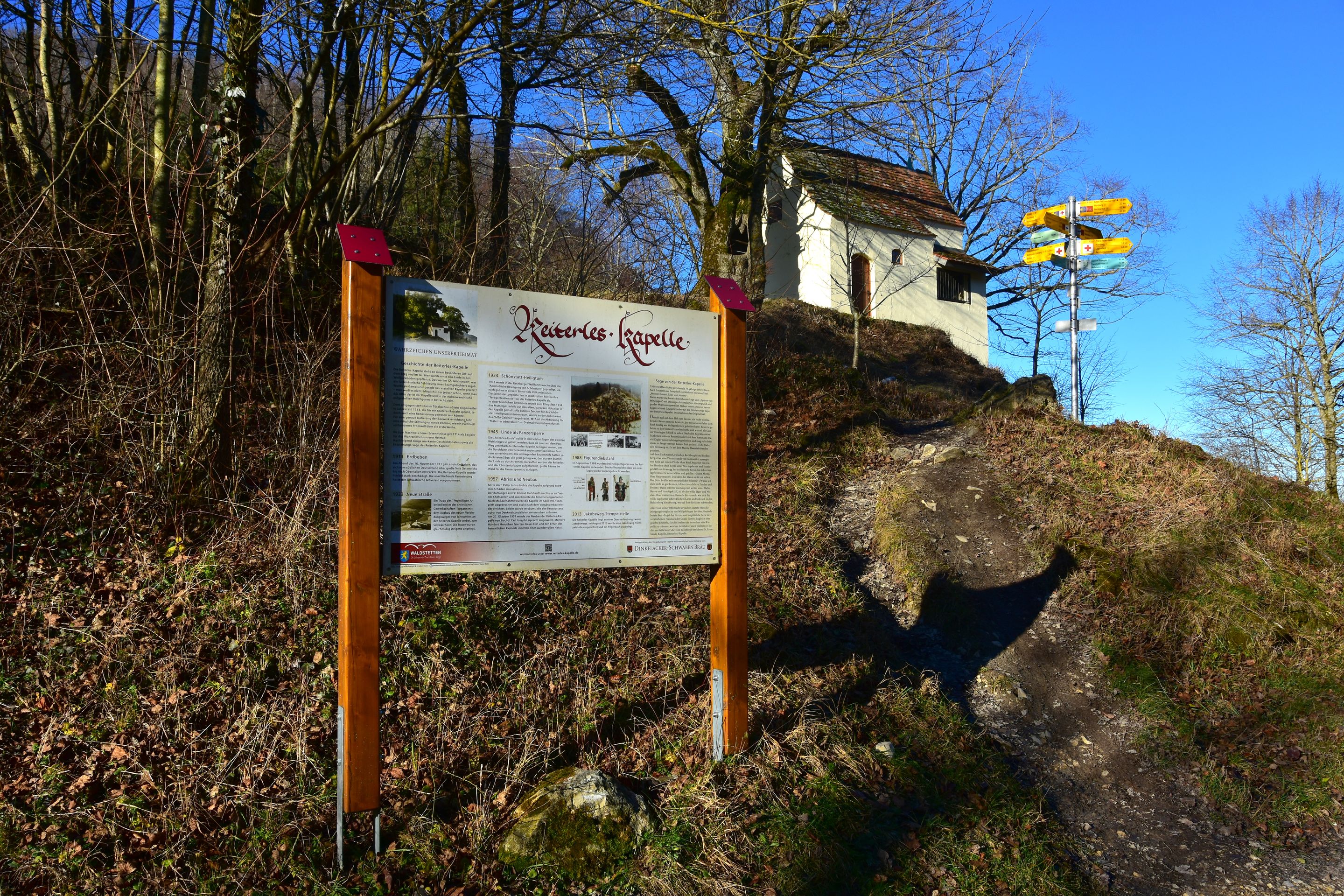 1714 datiert, welches als Jahr der ersten Erwähnung über dem Türsturz der Kapelle zu finden ist.Die Kapelle und ihre GeschichteDer Bau der Reiterles Kapelle ist eng mit der Verehrung des Viehpatrons St. Leonhard verbunden. Als heilige Stätte hat sie seit jeher eine religiöse Bedeutung. Über dem Eingang zur Kapelle befindet sich die Jahreszahl 1714, was auf eine zumindest teilweise Renovierung oder Wiederherstellung in diesem Jahr hindeutet. Die genaue Entstehungszeit bleibt jedoch im Dunkeln, sodass die Ursprünge vermutlich noch weiter zurückreichen.Die Reiterles Kapelle ist vor allem auch durch die Gründungssage "Der Holzbrockeler" bekannt, die eine spannende Legende rund um den Bauern Reuterle aus Tannweiler und den Winzinger Hauptmann Roth erzählt. Laut dieser Erzählung stiftete Reuterle die Kapelle, nachdem er sich aus einer gespenstischen Bedrohung befreit hatte. Die Legende, die mit mystischen und übernatürlichen Ereignissen rund um den Tod des Hauptmanns Roth verbunden ist, hat sich im Volksmund über Generationen hinweg gehalten und trägt zur kulturellen Bedeutung des Ortes bei.Das Wahrzeichen von WaldstettenDie Reiterles Kapelle hat sich über die Jahre hinweg zu einem wichtigen Wahrzeichen der Region entwickelt. Besonders hervorzuheben ist die Linde, die direkt neben der Kapelle steht und als Naturdenkmal geschützt ist. Die Kapelle und ihre Umgebung sind ein beliebtes Ziel für Wanderer, die nicht nur die religiöse Bedeutung des Ortes schätzen, sondern auch die idyllische Landschaft genießen. Früher war die Kapelle zudem ein oft besuchter Wallfahrtsort, was die Bedeutung für die lokale Bevölkerung unterstreicht.Ein Ort der Verehrung und WallfahrtBesonders markant ist auch die Inschrift „MTA“ (Mater ter Admirabilis – Dreimal wunderbare Mutter), die 1933 zur Verehrung der Gottesmutter Maria an der Stirnseite der Kapelle angebracht wurde. Diese Inschrift verweist auf die tiefe religiöse Bedeutung des Bauwerks, das nicht nur als Kapelle, sondern auch als Symbol der Spiritualität und Hingabe betrachtet wird.Heute ein Ziel für Pilger und WandererDie Reiterles Kapelle hat heute auch eine andere Funktion übernommen. Sie ist als Stempelstelle des Jakobusweges bekannt und dient damit auch als Ziel für Pilger auf ihrem Weg nach Santiago de Compostela. Diese Rolle als Etappenpunkt im Pilgerweg macht die Kapelle auch international von Bedeutung. Früher war sie im Privatbesitz, mittlerweile wird sie von der Gemeinde Waldstetten betreut, die dafür sorgt, dass der historische und religiöse Wert des Ortes erhalten bleibt.Neben der Kapelle steht eine große alte Linde, die um das Jahr 1600 gepflanzt worden sein muss, also rund 100 Jahre älter als die Jahreszahl über der Tür der Kapelle.Die Reiterleskapelle ist ein wahrer Knotenpunkt für unzählige Wanderwege in der Region. Man kann zum Beispiel das Naturschutzgebiet Kaltes Feld mit Hornberg, Galgenberg und Eierberg, ein über 634ha großes Schutzgebiet um die Hochebene Kaltes Feld erreichen. Das Kalte Feld mit seinen Ausläufern Hornberg und Galgenberg ist ein Zeugenberg der Schwäbischen Alb und mit 781m die höchste Erhebung in Ostwürttemberg.Man kann von hier aber auch wunderbar ins Christental absteigen.Man könnte ebenso auch die Kohlöffelrunde, die Lautertalrunde, die Messelbergtour, zum Rötelstein, zum Messelstein, oder zu den anderen vier Kapellen auf Waldstettergemarkung: Michaelskapelle, Pieta Kapelle, Kapelle Hürbelsbach und Kapelle St. Georg.Umrahmt von den markanten Dreikaiserbergen bietet die Region rund um Waldstetten und Schwäbisch Gmünd ein wahres Wanderparadies für alle Naturfreunde. Die malerische Landschaft, unberührte Wanderpfade, spektakuläre Ausblicke, gemütliche Einkehrmöglichkeiten und zahlreiche Sehenswürdigkeiten am Wegesrand machen die Wandertouren zu einem unvergesslichen Erlebnis. Neben den beiden Qualitätswanderwegen „Kaltes Feld Weg“ und „Waldkugelbahn Weg“ gibt es eine Vielzahl an Routen, die sich an Geschichtsinteressierte, Kulturfreunde, Genießer sowie kleine und große Abenteurer richten. Hier ist für jeden Geschmack und jedes Wanderlevel etwas Passendes dabei!
