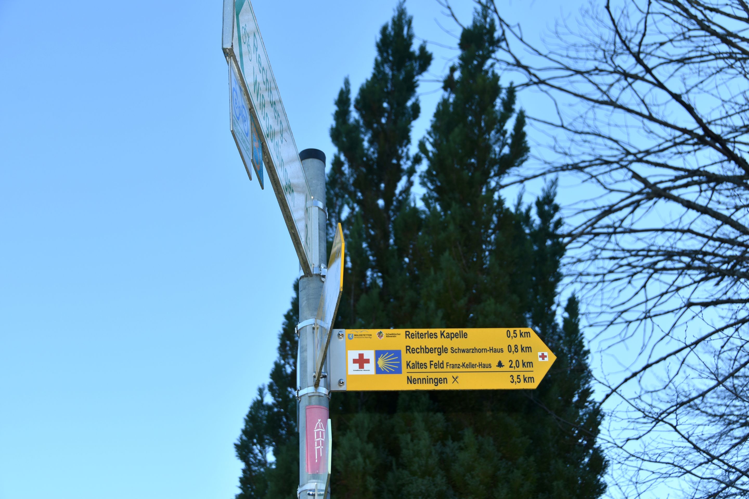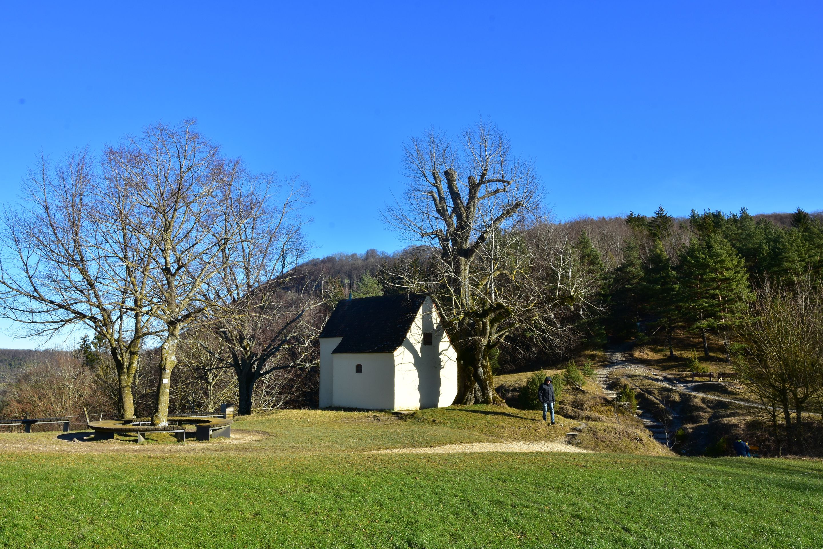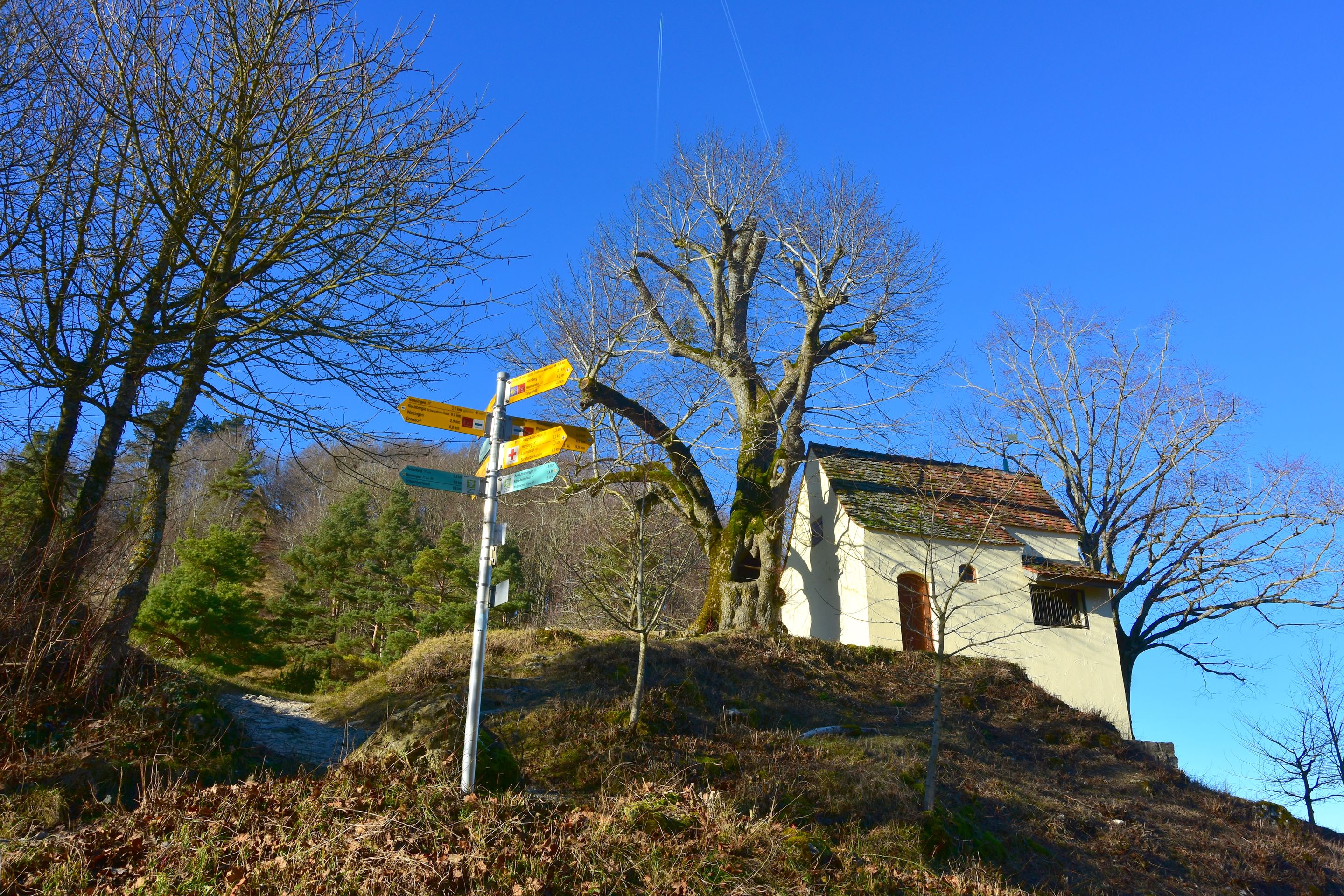1714 datiert, welches als Jahr der ersten Erwähnung über dem Türsturz der Kapelle zu finden ist.Die Kapelle und ihre GeschichteDer Bau der Reiterles Kapelle ist eng mit der Verehrung des Viehpatrons St. Leonhard verbunden. Als heilige Stätte hat sie seit jeher eine religiöse Bedeutung. Über dem Eingang zur Kapelle befindet sich die Jahreszahl 1714, was auf eine zumindest teilweise Renovierung oder Wiederherstellung in diesem Jahr hindeutet. Die genaue Entstehungszeit bleibt jedoch im Dunkeln, sodass die Ursprünge vermutlich noch weiter zurückreichen.Die Reiterles Kapelle ist vor allem auch durch die Gründungssage "Der Holzbrockeler" bekannt, die eine spannende Legende rund um den Bauern Reuterle aus Tannweiler und den Winzinger Hauptmann Roth erzählt. Laut dieser Erzählung stiftete Reuterle die Kapelle, nachdem er sich aus einer gespenstischen Bedrohung befreit hatte. Die Legende, die mit mystischen und übernatürlichen Ereignissen rund um den Tod des Hauptmanns Roth verbunden ist, hat sich im Volksmund über Generationen hinweg gehalten und trägt zur kulturellen Bedeutung des Ortes bei.Das Wahrzeichen von WaldstettenDie Reiterles Kapelle hat sich über die Jahre hinweg zu einem wichtigen Wahrzeichen der Region entwickelt. Besonders hervorzuheben ist die Linde, die direkt neben der Kapelle steht und als Naturdenkmal geschützt ist. Die Kapelle und ihre Umgebung sind ein beliebtes Ziel für Wanderer, die nicht nur die religiöse Bedeutung des Ortes schätzen, sondern auch die idyllische Landschaft genießen. Früher war die Kapelle zudem ein oft besuchter Wallfahrtsort, was die Bedeutung für die lokale Bevölkerung unterstreicht.Ein Ort der Verehrung und WallfahrtBesonders markant ist auch die Inschrift „MTA“ (Mater ter Admirabilis – Dreimal wunderbare Mutter), die 1933 zur Verehrung der Gottesmutter Maria an der Stirnseite der Kapelle angebracht wurde. Diese Inschrift verweist auf die tiefe religiöse Bedeutung des Bauwerks, das nicht nur als Kapelle, sondern auch als Symbol der Spiritualität und Hingabe betrachtet wird.Heute ein Ziel für Pilger und WandererDie Reiterles Kapelle hat heute auch eine andere Funktion übernommen. Sie ist als Stempelstelle des Jakobusweges bekannt und dient damit auch als Ziel für Pilger auf ihrem Weg nach Santiago de Compostela. Diese Rolle als Etappenpunkt im Pilgerweg macht die Kapelle auch international von Bedeutung. Früher war sie im Privatbesitz, mittlerweile wird sie von der Gemeinde Waldstetten betreut, die dafür sorgt, dass der historische und religiöse Wert des Ortes erhalten bleibt.Neben der Kapelle steht eine große alte Linde, die um das Jahr 1600 gepflanzt worden sein muss, also rund 100 Jahre älter als die Jahreszahl über der Tür der Kapelle.Die Reiterleskapelle ist ein wahrer Knotenpunkt für unzählige Wanderwege in der Region. Man kann zum Beispiel das Naturschutzgebiet Kaltes Feld mit Hornberg, Galgenberg und Eierberg, ein über 634ha großes Schutzgebiet um die Hochebene Kaltes Feld erreichen. Das Kalte Feld mit seinen Ausläufern Hornberg und Galgenberg ist ein Zeugenberg der Schwäbischen Alb und mit 781m die höchste Erhebung in Ostwürttemberg.Man kann von hier aber auch wunderbar ins Christental absteigen.Man könnte ebenso auch die Kohlöffelrunde, die Lautertalrunde, die Messelbergtour, zum Rötelstein, zum Messelstein, oder zu den anderen vier Kapellen auf Waldstettergemarkung: Michaelskapelle, Pieta Kapelle, Kapelle Hürbelsbach und Kapelle St. Georg.Umrahmt von den markanten Dreikaiserbergen bietet die Region rund um Waldstetten und Schwäbisch Gmünd ein wahres Wanderparadies für alle Naturfreunde. Die malerische Landschaft, unberührte Wanderpfade, spektakuläre Ausblicke, gemütliche Einkehrmöglichkeiten und zahlreiche Sehenswürdigkeiten am Wegesrand machen die Wandertouren zu einem unvergesslichen Erlebnis. Neben den beiden Qualitätswanderwegen „Kaltes Feld Weg“ und „Waldkugelbahn Weg“ gibt es eine Vielzahl an Routen, die sich an Geschichtsinteressierte, Kulturfreunde, Genießer sowie kleine und große Abenteurer richten. Hier ist für jeden Geschmack und jedes Wanderlevel etwas Passendes dabei!