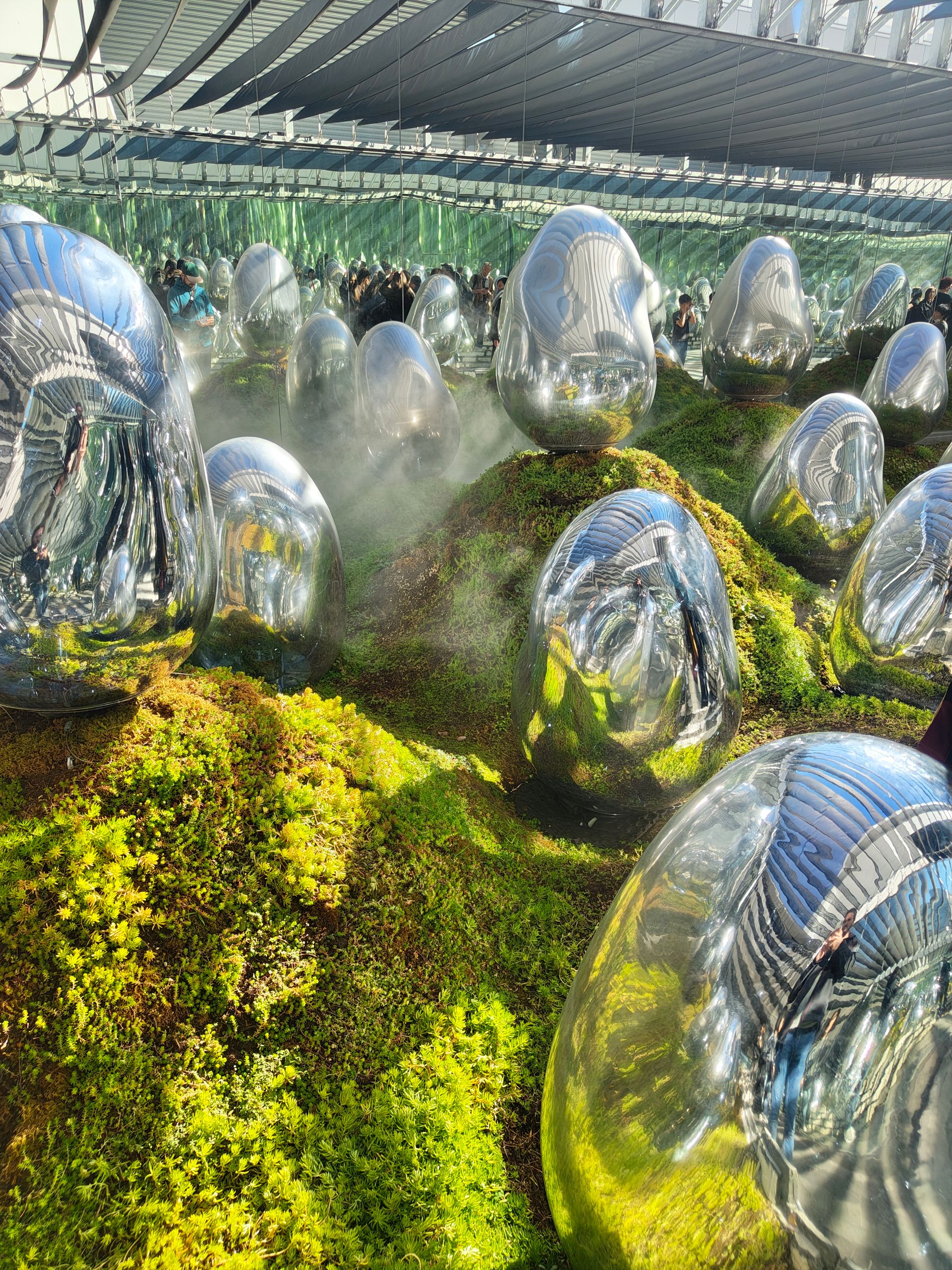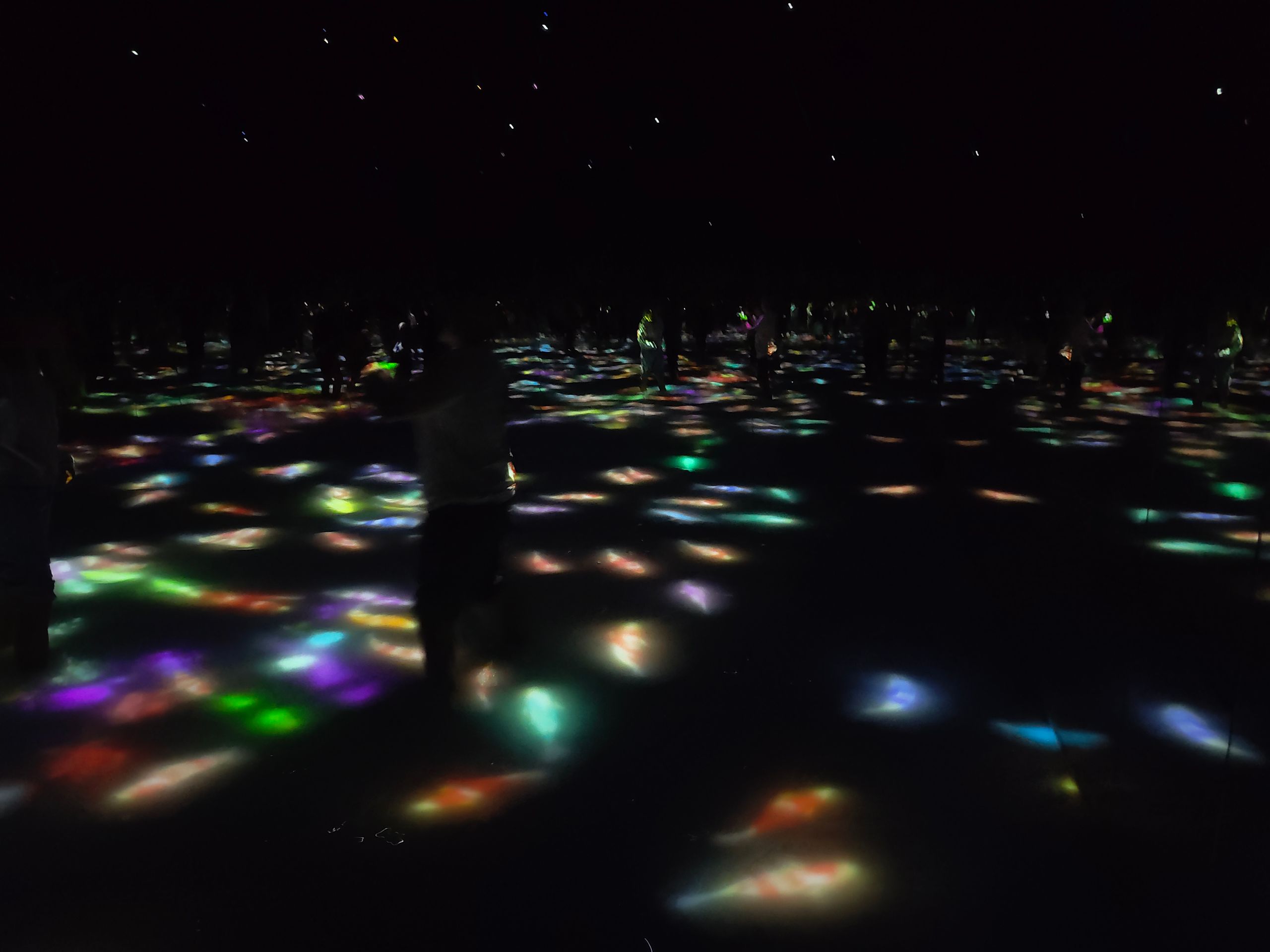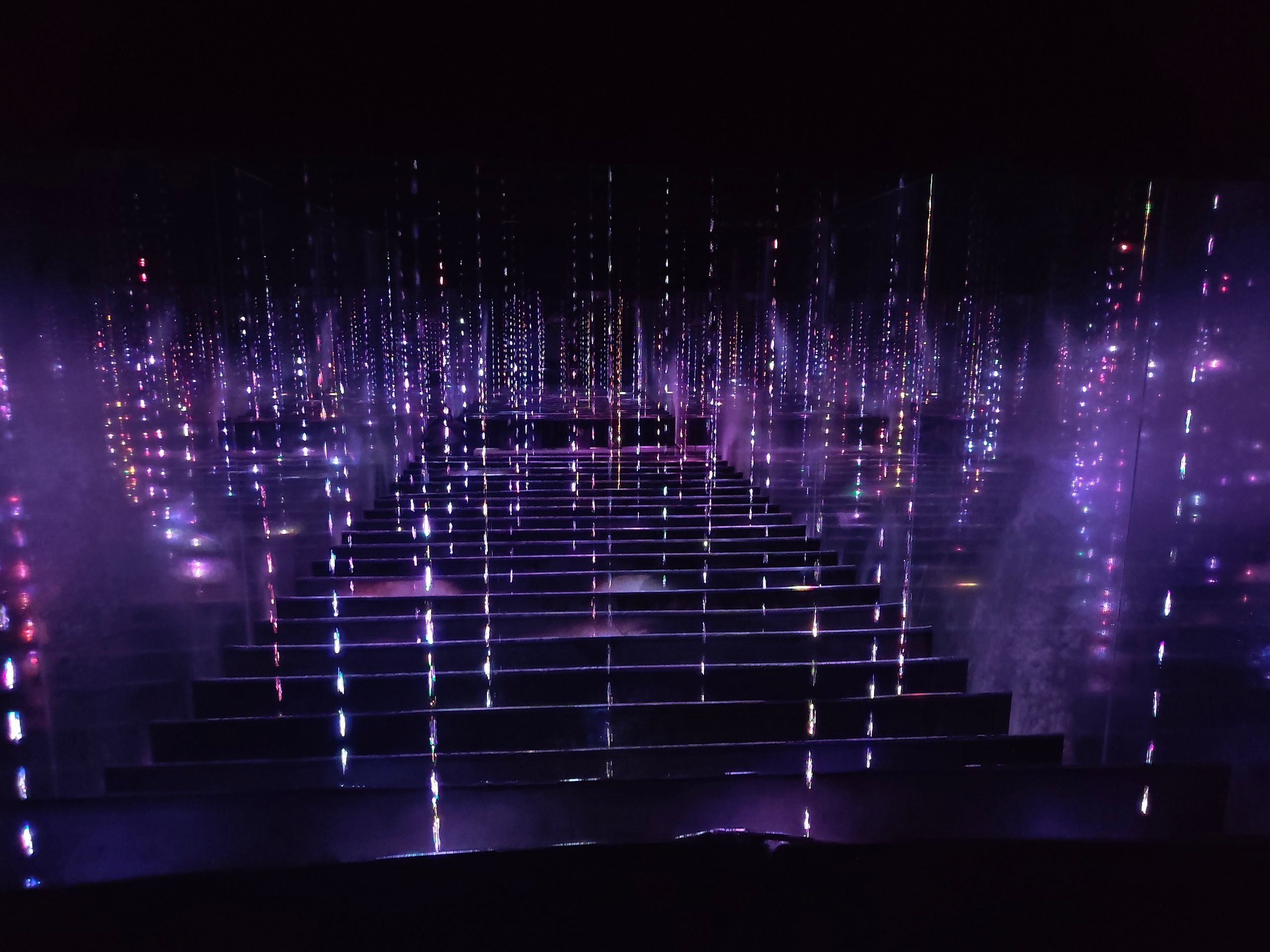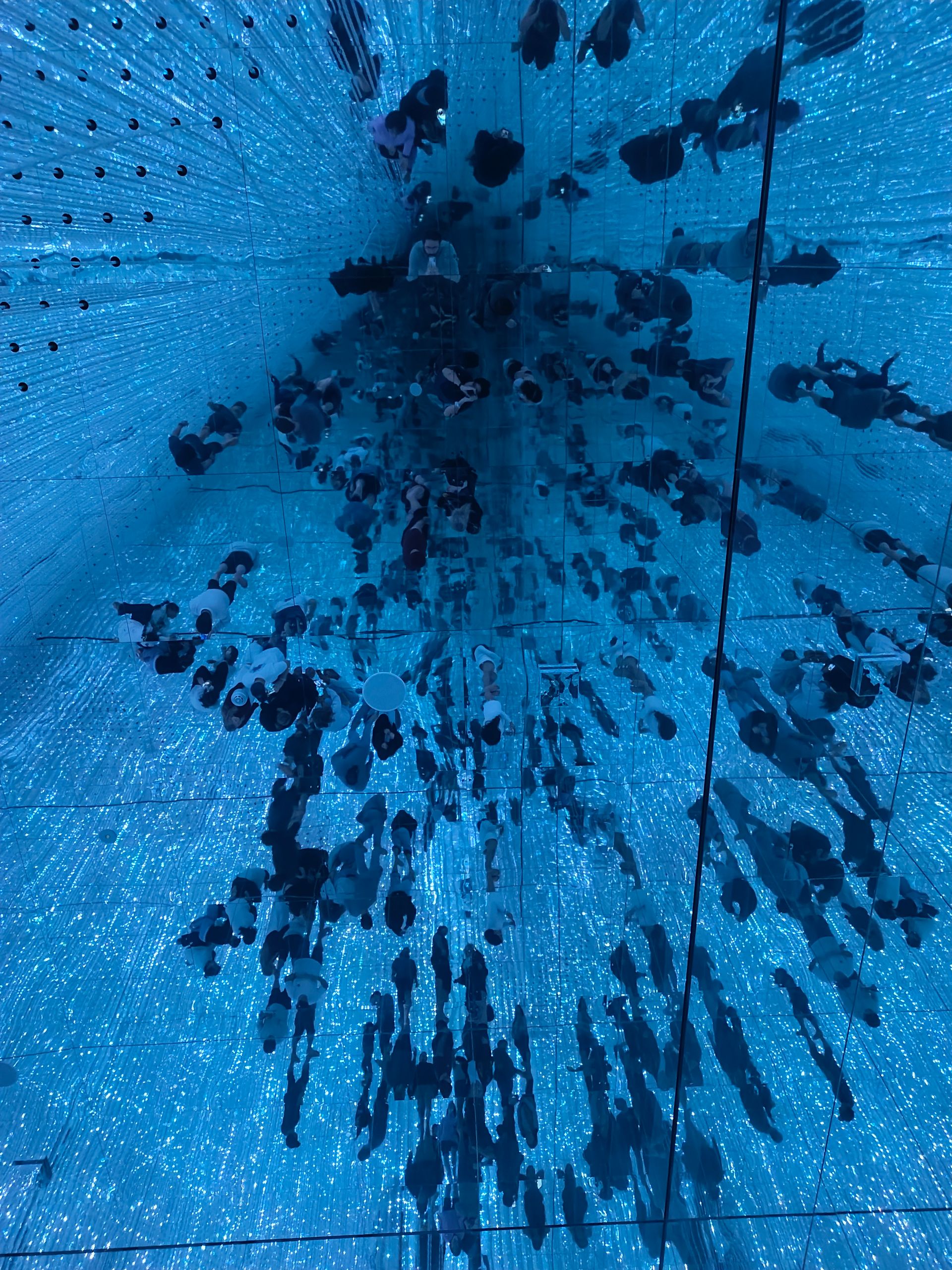 Es folgten mehrere Installationen, die sich gegenseitig immer wieder übertroffen haben: ein leuchtender Wasserfall aus Licht, ein Raum mit vollständig verspiegeltem Boden, der jede Orientierung aufhebt, und eine Lichtinstallation, die den Namen „infinite“ mehr als verdient hat – man hatte das Gefühl, in einem endlosen Raum aus schwebenden Lichtern zu stehen.