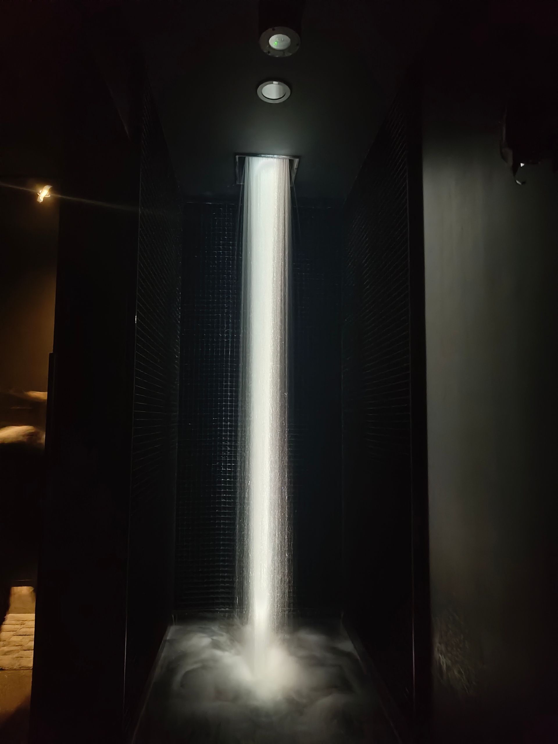 Los ging es mit einer Rampe, auf der Wasser in sanftem Strom nach unten floss, während Projektionen die Umgebung ständig veränderten. Barfuß durch das Wasser zu laufen, während sich Licht und Farben bewegen, war ein ziemlich surrealer Einstieg, an dessen Ende ein kleiner Wasserfall auf uns wartete.