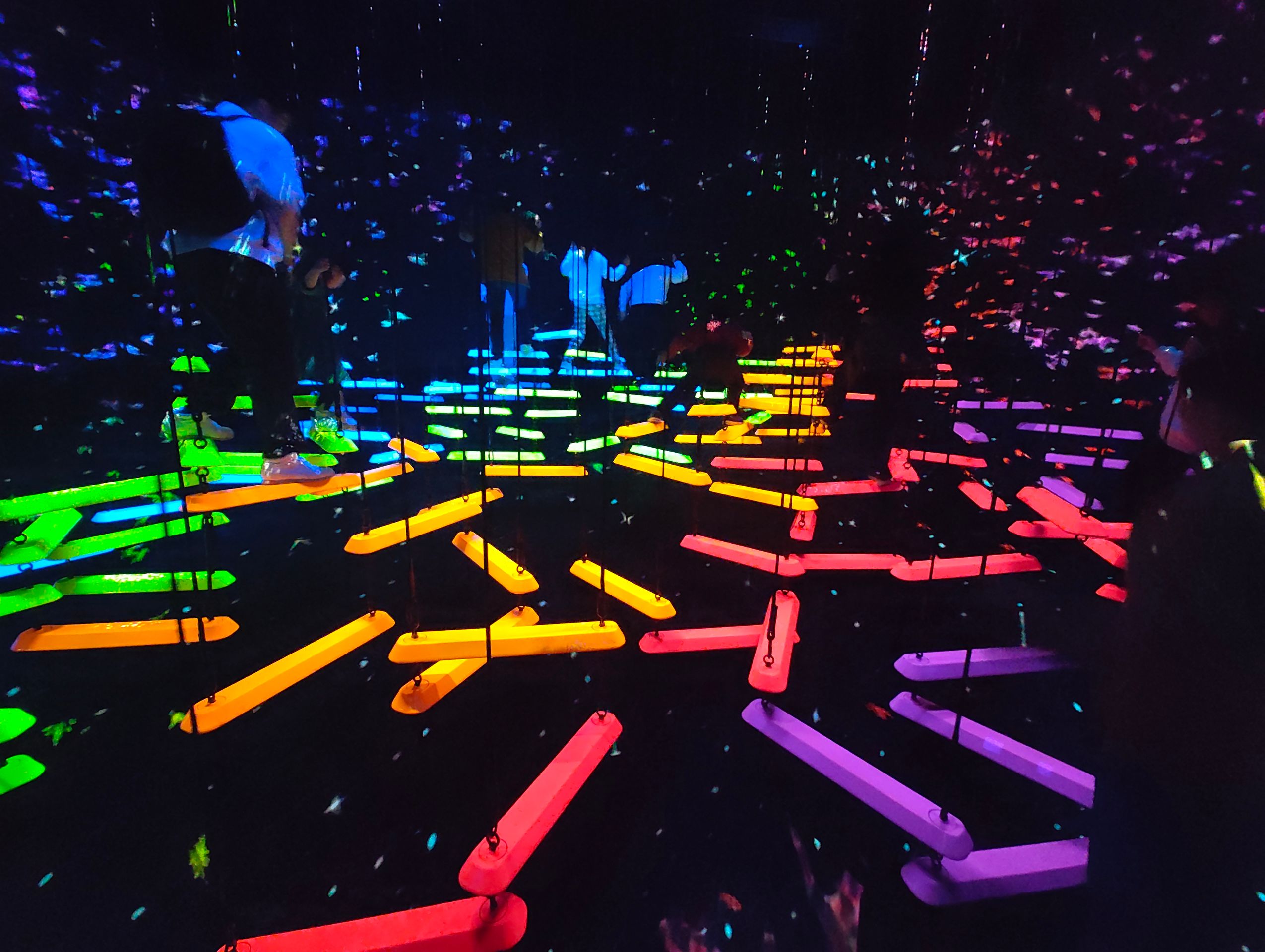Damit war der Wasserbereich abgeschlossen, und es ging weiter in den sogenannten Forest-Bereich. Hier standen interaktive Installationen im Mittelpunkt, bei denen Licht, Bewegung und Balance eine Rolle spielten. Alles reagiert auf die Besucher:innen – nichts bleibt statisch.