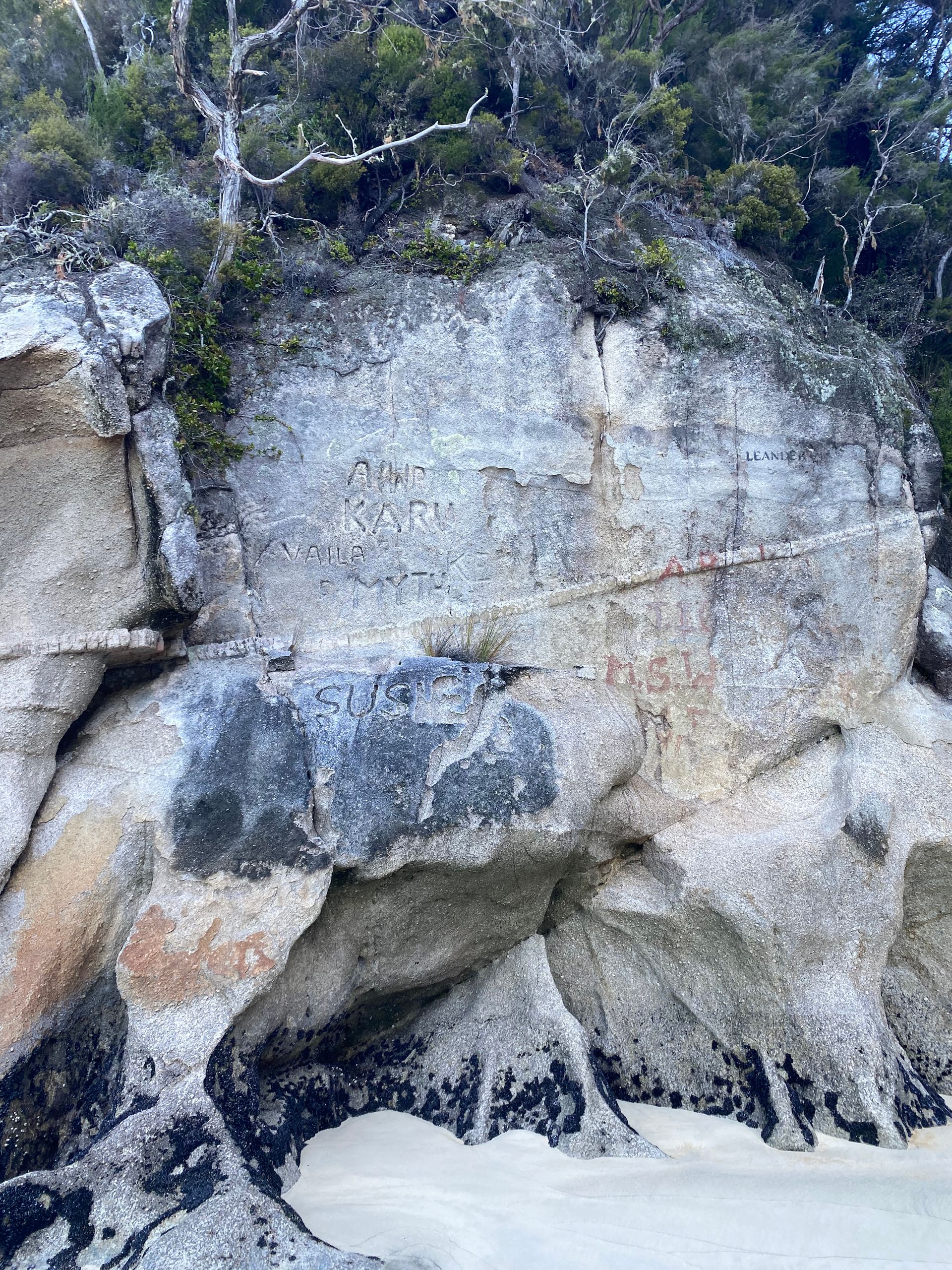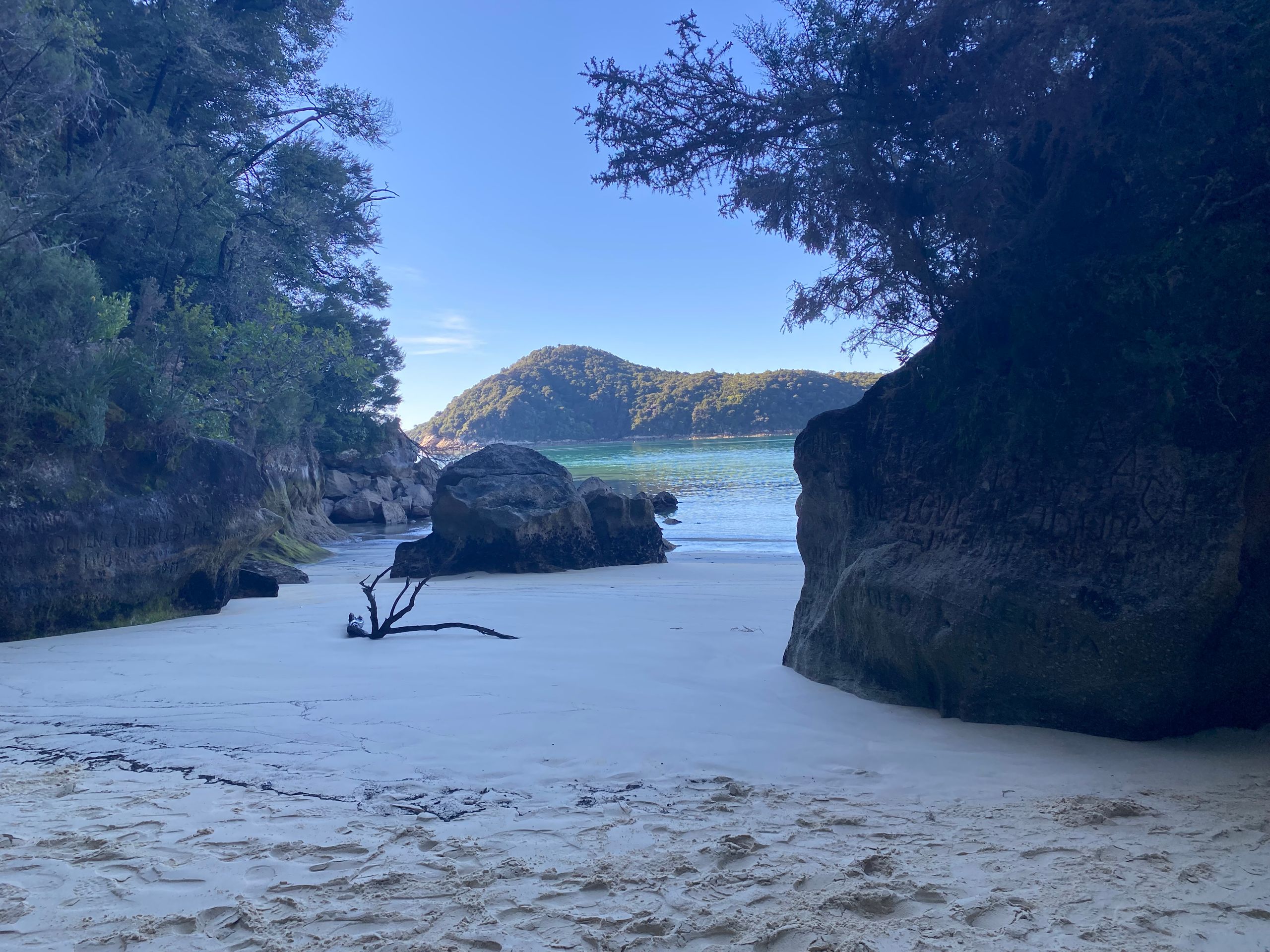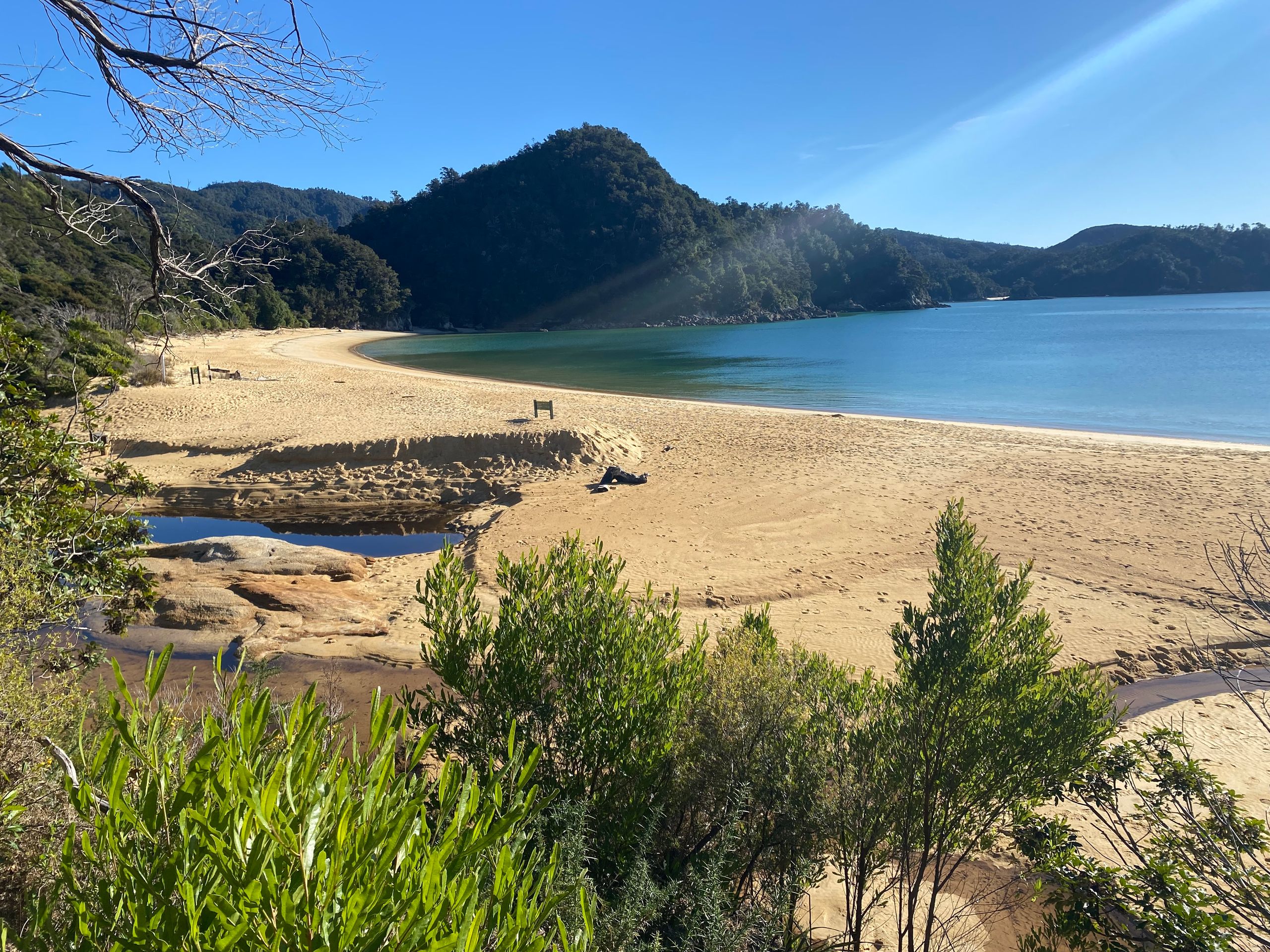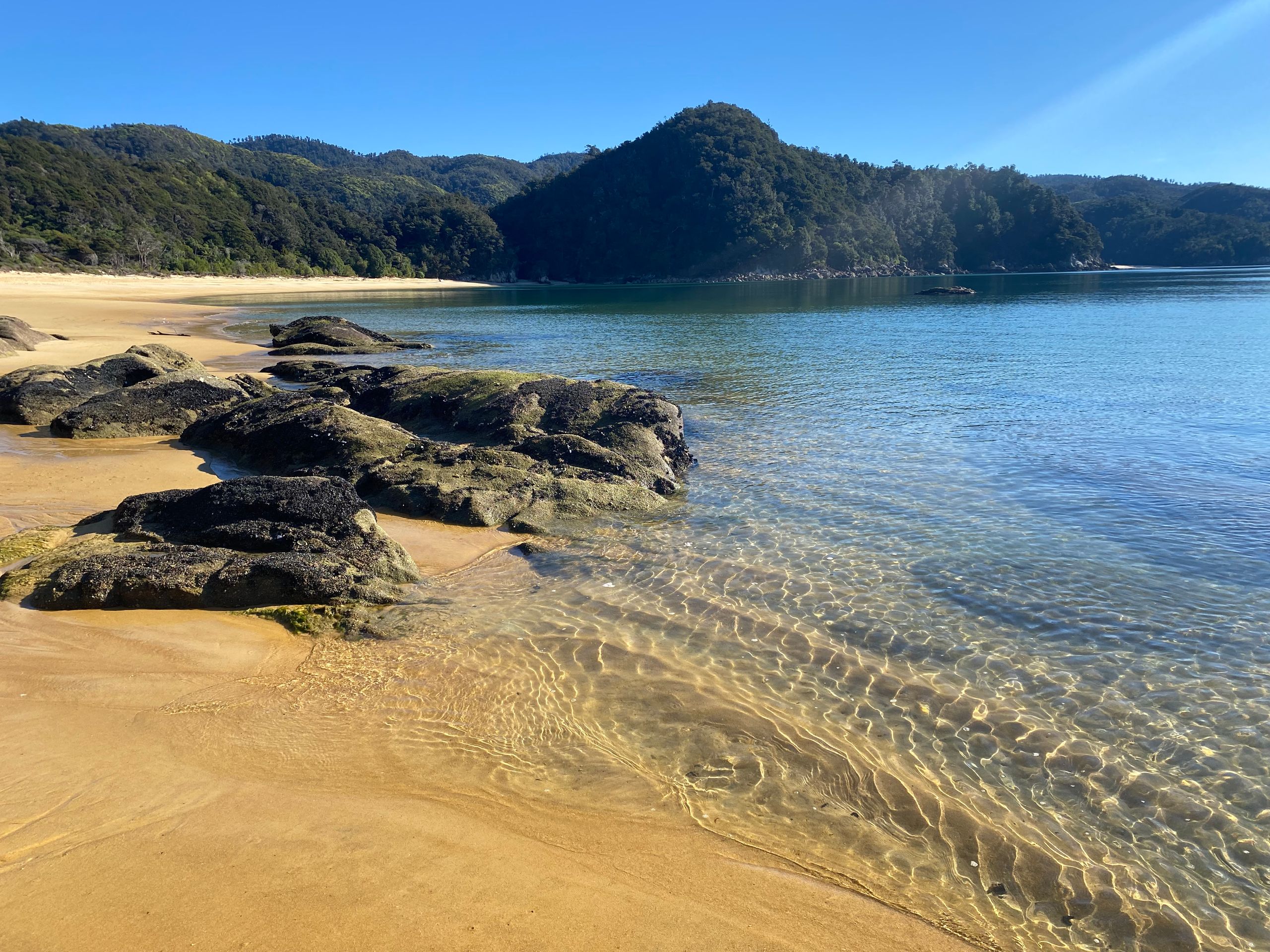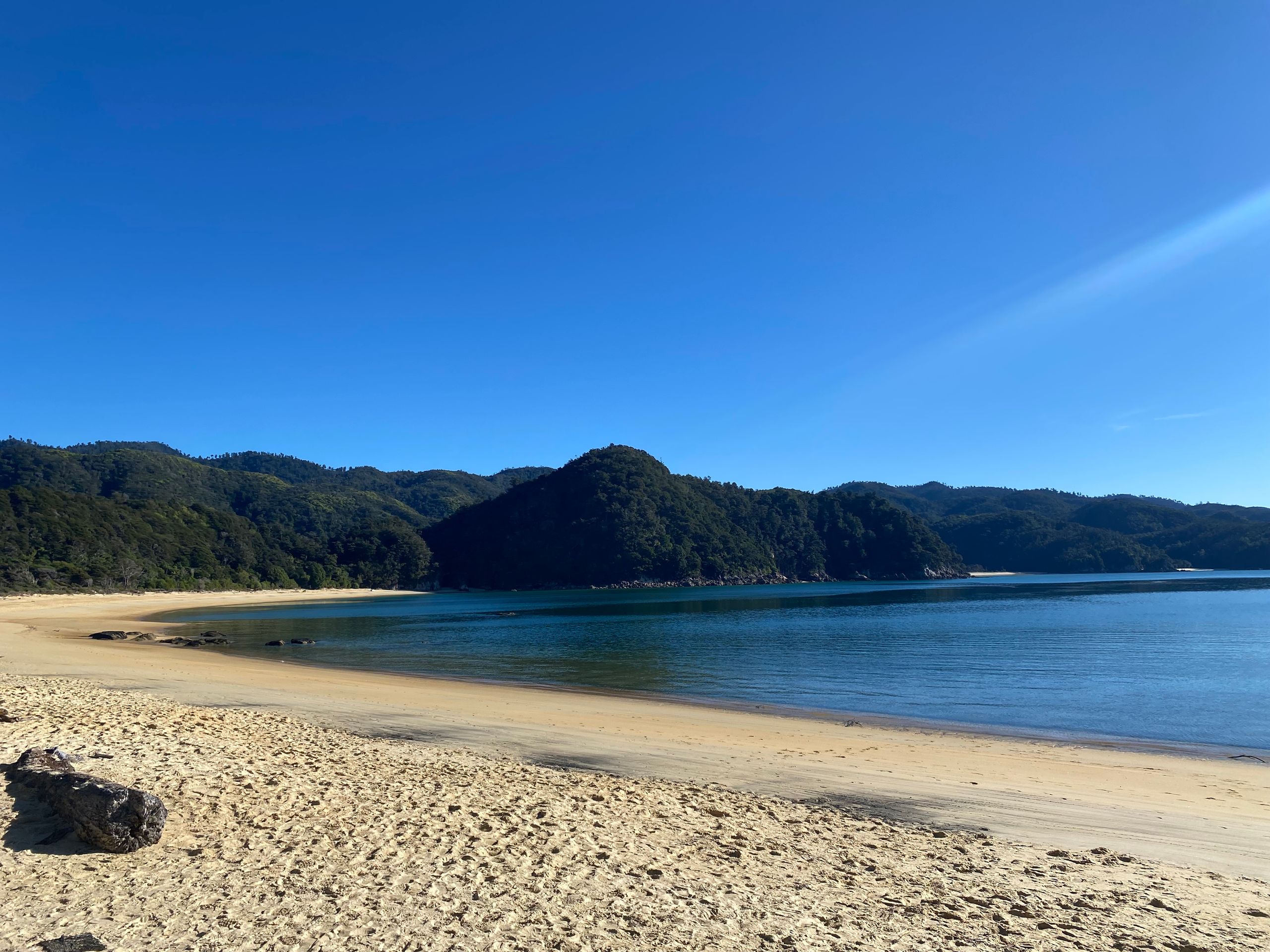Also gestern hab ich Gott sei dank ja nen chiller tag eingelegt, morgens gabs erst mal porridge mit echter milch exzellent sag ich euch. Danach gings in die nächste stadt Motueka zum wäsche waschen. Der Aufenthalt dort war länger als gedacht, da ich die wäsche ausversehen 2 mal gewaschen hab, weil ich dachte es wäre der trockner. Aber naja wisst ihr wäsche is gewaschen riecht gut, ist sauber bis auf die unauswaschbaren Flecken also alles wunderbar. Bin dann einkaufen gewesen und zum übernachtungsspot. Dort wurd ich gleich begrüßt von dan und seinem hund, die dort auch gecampt haben. Hab da dann gechillt, gehäkelt und war am strand spazieren, perfekter tag. Am nächsten tag ging der wecker eigentlich so auf 6:30 aber war eher war und dacht mir naja auch egal. Konnte wieder luxuriös zähne putzen und gesicht waschen, weils hier waschbecken gibt. Und dann gings los zum startpunkt der wanderung im Abel Tasman National park: Marahau. Und wie sollte es anders sein, es war super kurvig dahin. Auto geparkt, rucksack gepackt, stullen geschmiert, wasserblasen nochmal doppelt verpflastert los gings. 11.8 km hin und 11.8 km zurück in 9 stunden mit 1 h pause vor ort. Und ich hab e geschafft, die letzten 2 km zurck waren hart not gonna lie. Meine füße haben gepocht, aber es war es wert. Der weg ging eig recht angenehm aber ab und an mal große an und abstiege durch den regenwald über brücken immer am bergrand entlang. Zwischendurch immer wieder blick zum meer. Und die strände wow, heller sandstrand und das wasser leute durchsichtig türkis grün, war leider kaum einzufangen mit der handykamera. Angekommen in Anchorage bay gabs erst mal snacks und wurde die ganze essenzeit von nem weka belagert haha die sind aber einfach süß. Der strand da einfach ein traum, im sommer ist es bestimmt toll, wenn man baden kann. Hatte also ca 1 h hier bevor ich zurück musste, weil ich auf keinen fall im dunklen im regenwald enden wollte. Aber alles geschafft, zurück am auto war ich heilfroh die schuhe auszuziehen, füße waschen,füse verpflastern, füße eincremen. Es ging nochmal zum campspot von gestern, bevor es morgen dann nach nelson geht. Also ein unglaublich schöner tag, aber auch wenn es nicht so viele hm waren dennoch anstrengend für mich, war die längste Wanderung die ich jemals gemacht habe glaub ich, 23,6 km