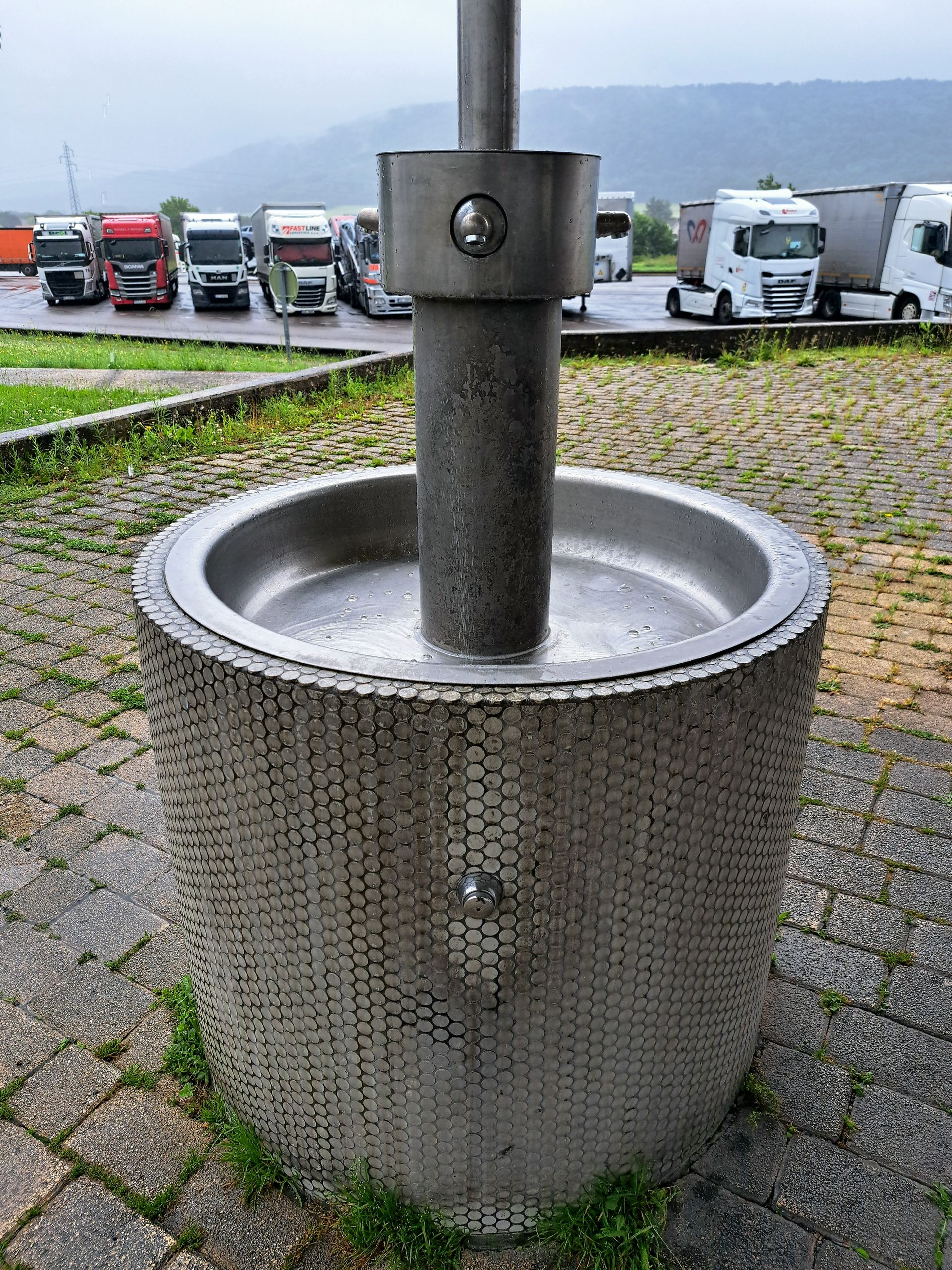 Während der Weiterreise wird offenbar, dass trotz der ergiebigen Regengüsse unsere Wasservorräte zur Neige gehen. Eine Raststätte auf der Autobahn bietet eine gute Gelegenheit, die Kanister wieder zu befüllen. Also halten wir zwischen dicken Lastern nahe der Quelle. Der Held ist schon mit den Behältern unterwegs, während ich mich noch sortieren muss, ihm aber bald auf dem Fuße folge, um das kühle Nass im Wohnwagen aufzufüllen.