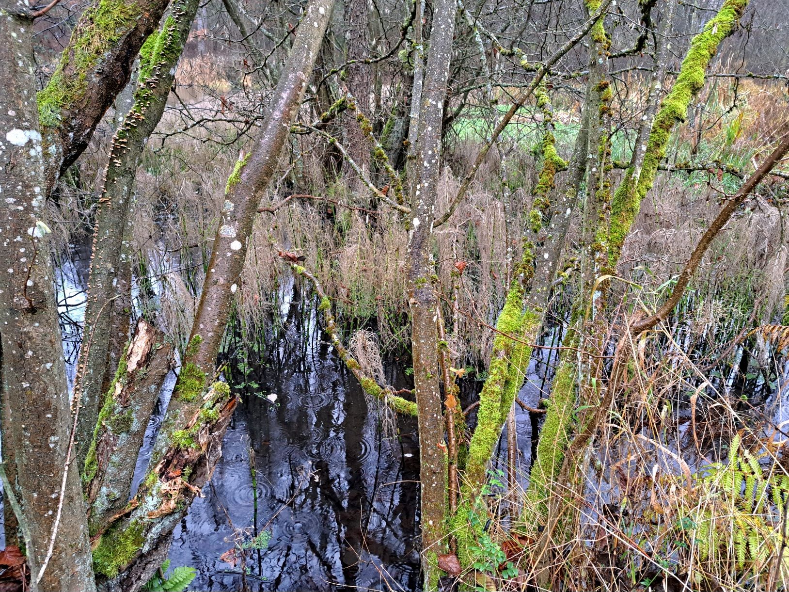 Ich schaue mich um und mache einen langen Arm, so lang es nur geht. Jetzt komme ich mit den Fingerspitzen an den Ast des nächsten Bäumchens, an dem ich mich festhalten kann, um nicht tiefer zu sinken. Der Regen wird immer stärker, dicke Tropfen vergrößern die Pfütze um mich herum, der Boden blubbert und der Madder wird schlammiger, breiiger, klebriger.