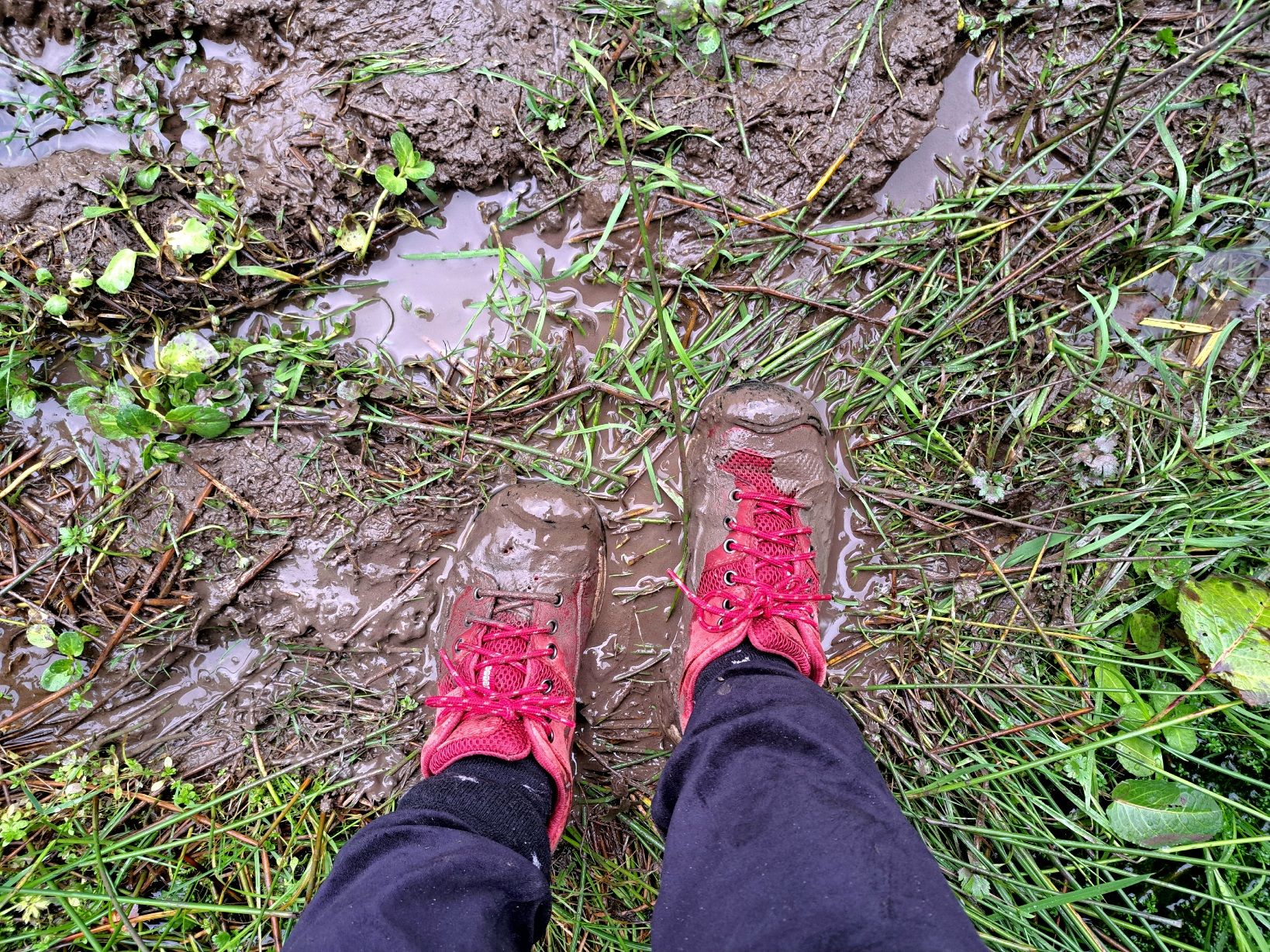 Ich werfe einen unvorsichtigen Blick in den immer stärker werdenden Regen und schon ist es passiert! Mit beiden Füßen stecke ich im Schlamm. Unverrückbar, unausweichlich, unentrinnbar!
