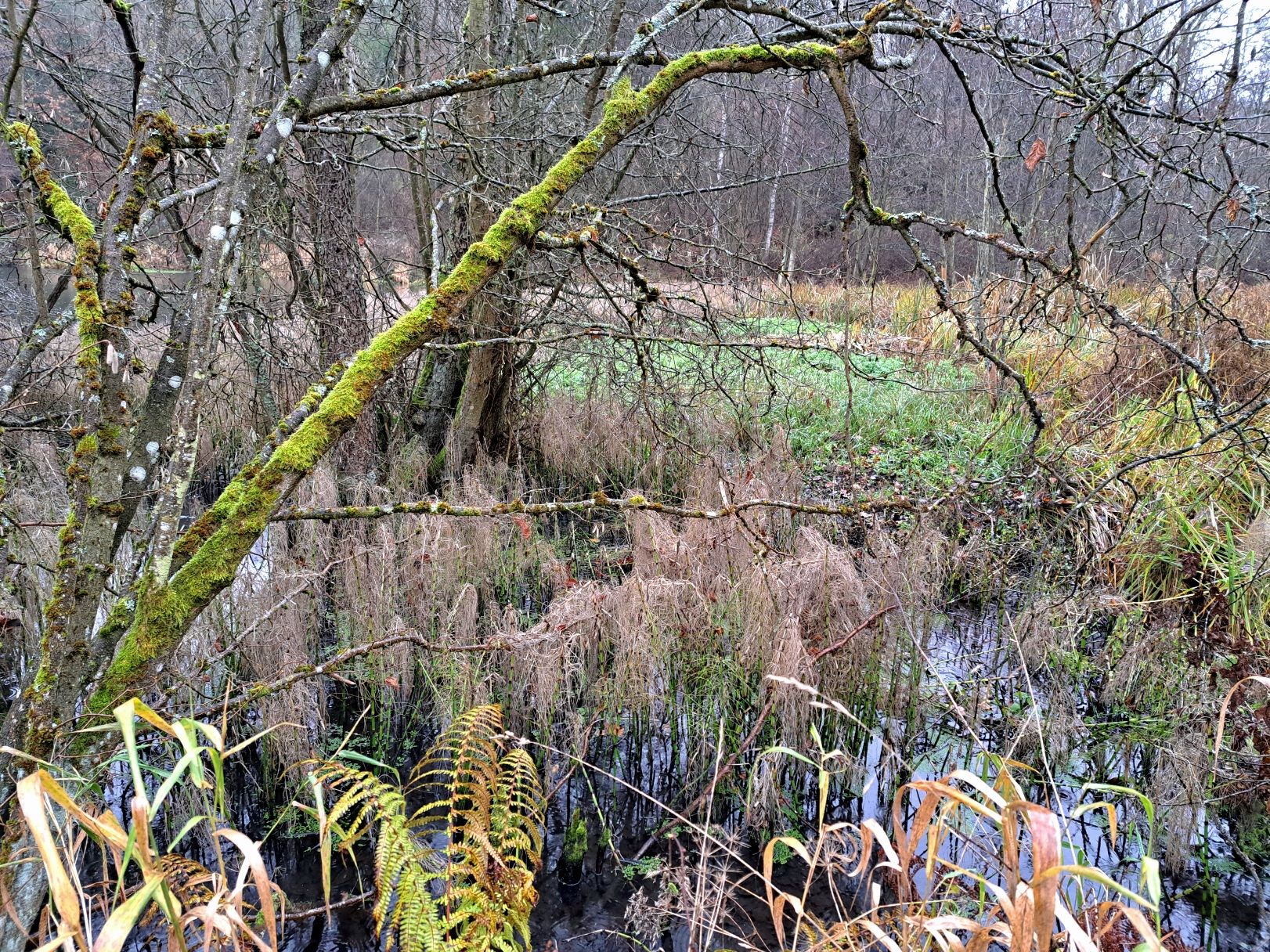 Der Hinweis zum Trampelpfad ist geschickt platziert und bald schlittern wir auf unwegsamen Routen durch Pampe, Mumpe und Schlick. Die Wildschweine haben den Boden gründlich umgewühlt und nach Wurzeln, Pilzen, Kräutern und unvorsichtigen Weichtieren abgesucht. Wer nicht aufmerksam Obacht gibt, riskiert den Bruch von Hals, Bein und anderen wichtigen Körperteilen.