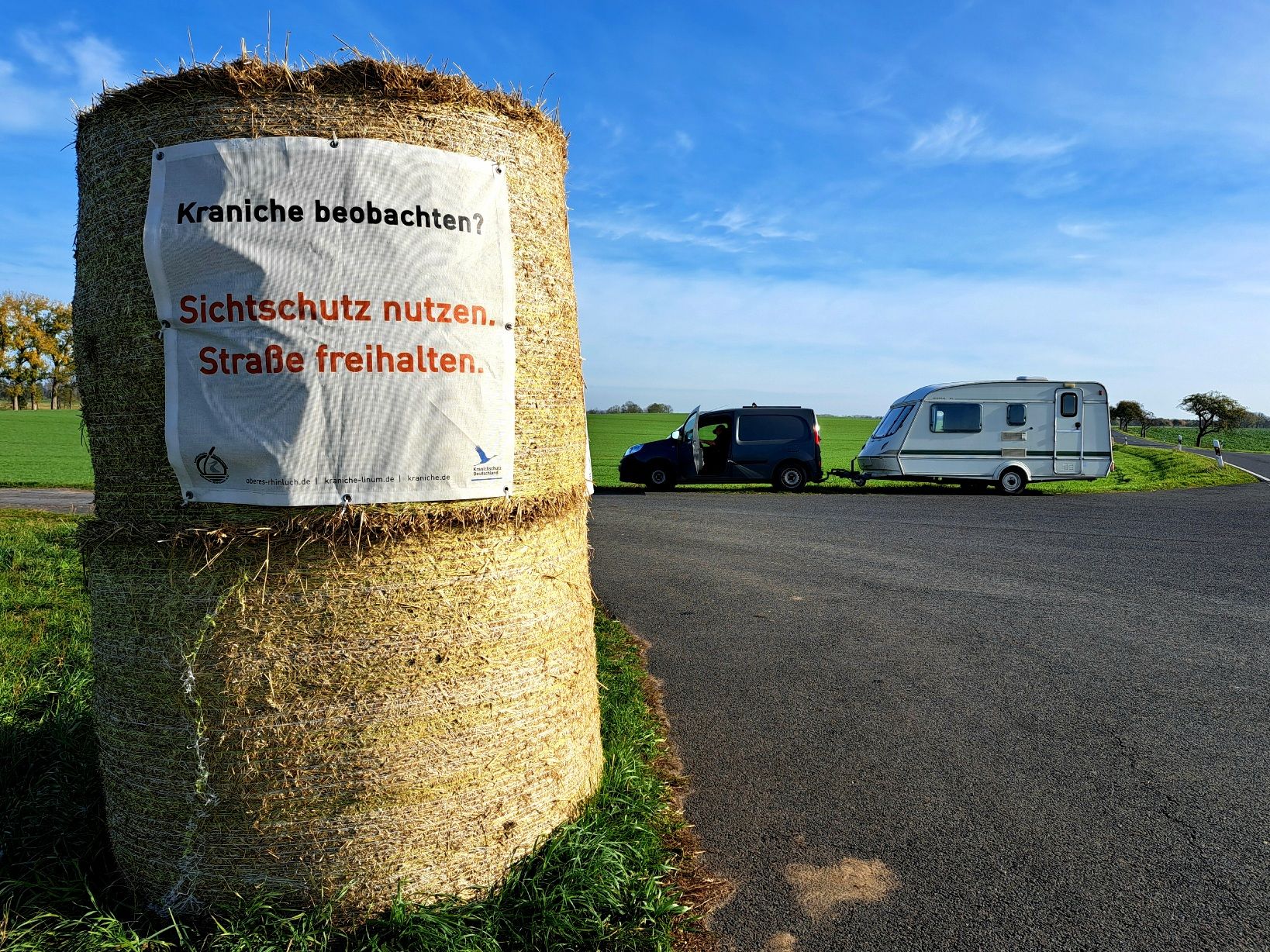 Die lauten Rufe und Trompeten, die der Kommunikation innerhalb der Flugformation dienen, sind deutlich zu vernehmen, doch allein, der Blick auf die stolzen Vögel bleibt uns verwehrt. Viele schöne Laubbäume sind in den Jahren himmelhoch in die Aussicht gewachsen, auch von den angelegten und gut besuchten Beobachtungstürmen ist keine noch so winzige Kranichfeder zu erspähen.