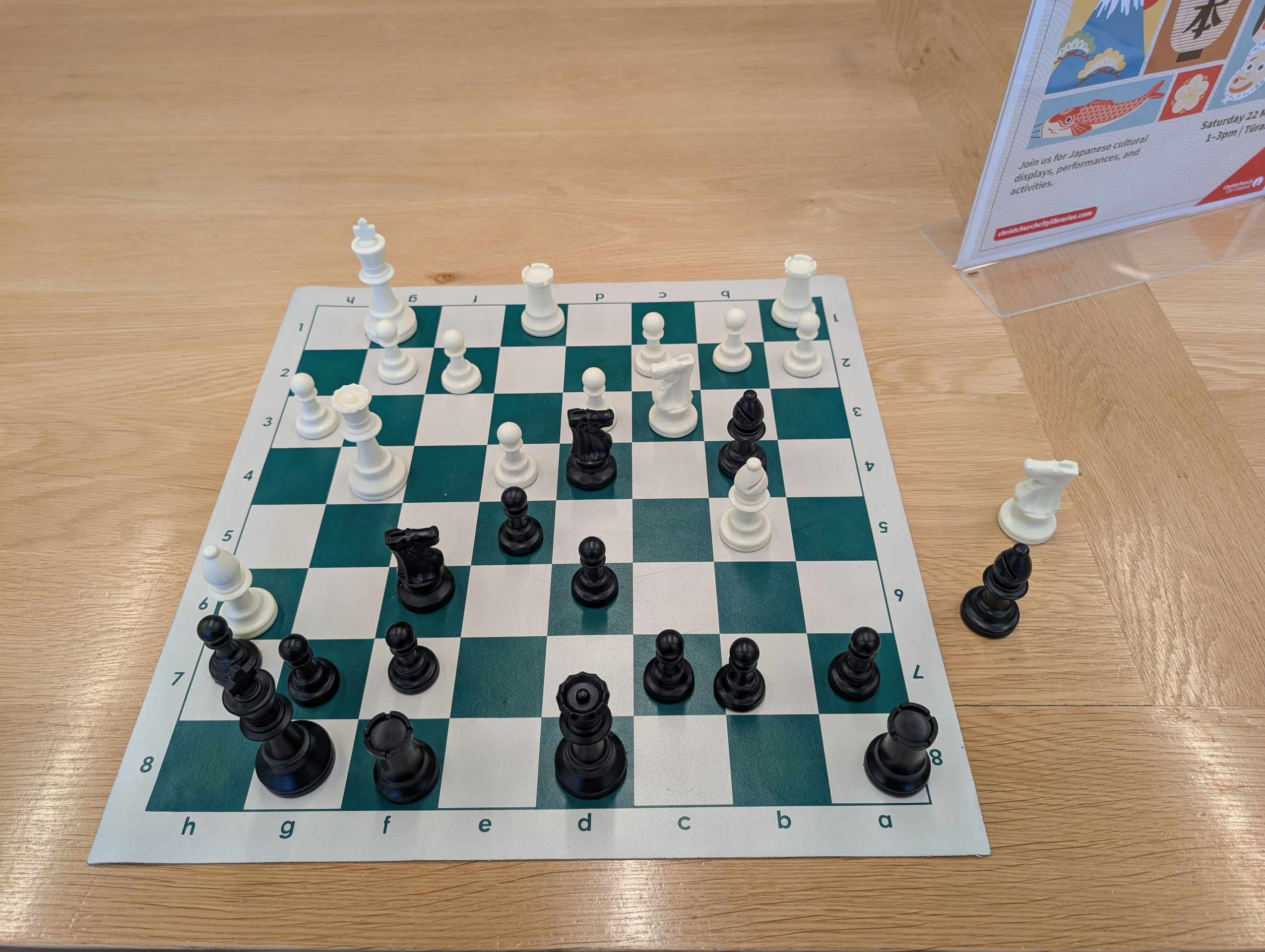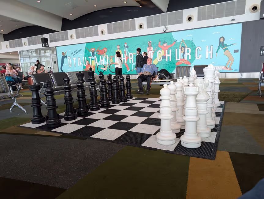 Irgendwie laufen mir in letzter Zeit viele Schachbretter über den Weg. Erst hab ich in Queenstown gespielt, dann in Christchurch in der Bibliothek eins entdeckt und am Ende starte ich am Flughafen in Christchurch ein kleines Gruppenschach, indem ich erst die Figuren korrigiere und dann, nachdem ein junger Mann das "Brett" intensivst betrachtet hat, den ersten Zug mache. Timo (so lerne ich, heißt er) hat in dem Moment nicht hingeschaut und sucht erst verzweifelt nach derjenigen Person, mit der er jetzt spielen könnte, das ist ein bisschen lustig. Am Ende sind zwei weitere Deutsche, ein Japaner und ein weiterer Mann unbekannter Herkunft am knobeln und tüfteln. So schnell können 2 Stunden am Flughafen vergehen.