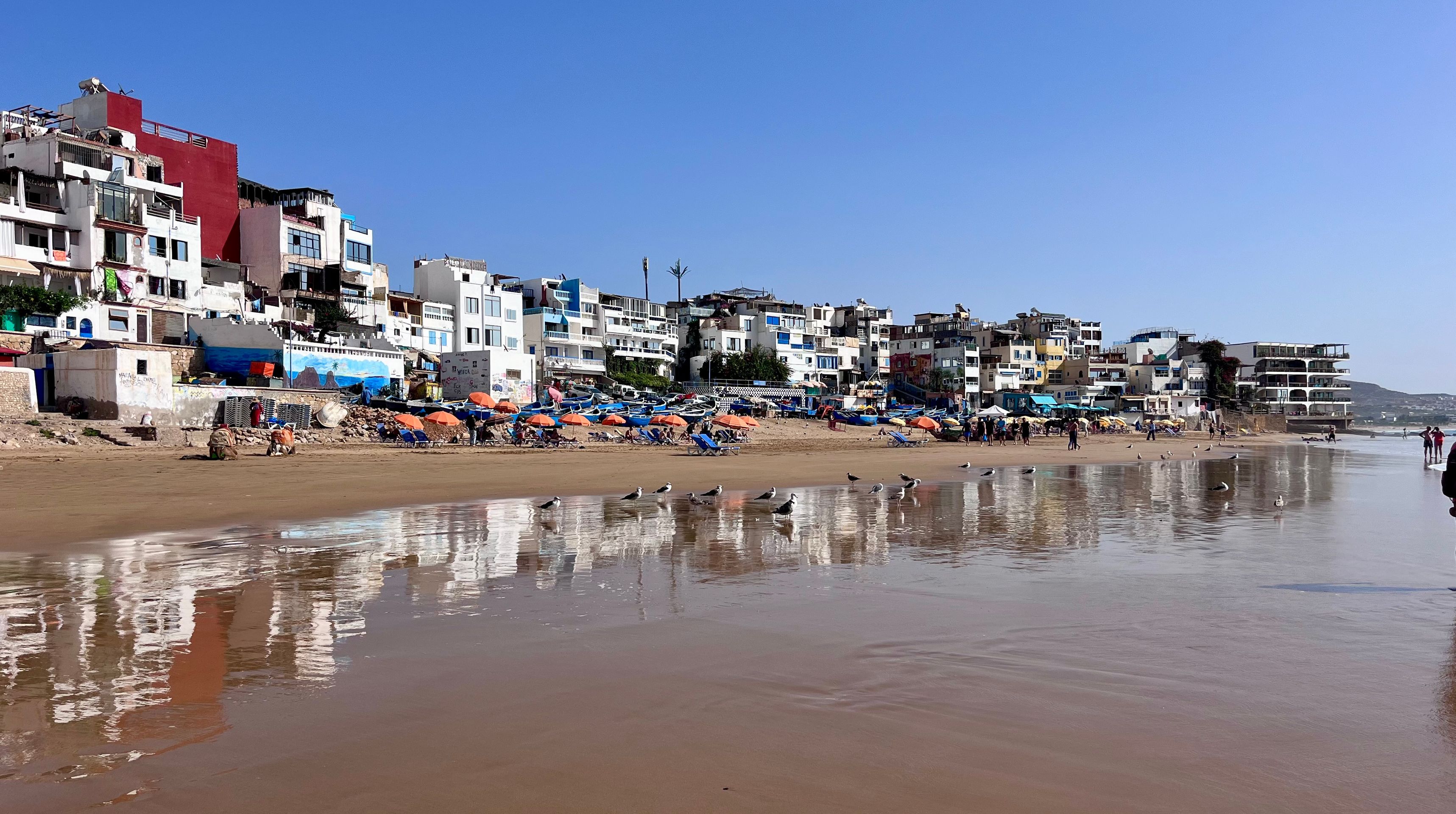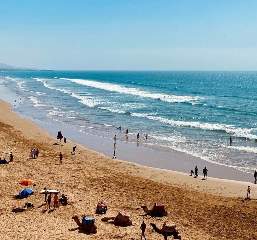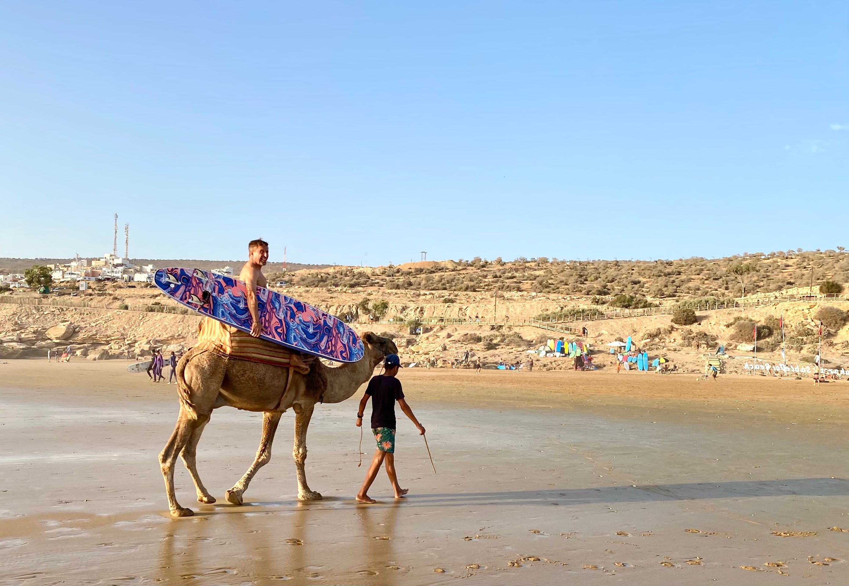 Den nächsten Morgen beginnen wir mit einem langen Strandspaziergang. Unsere übliche Morgengymnastik vor dem Van fällt, wie so oft in Marokko, aus. Susi hat doch - nachvollziehbar - Hemmungen, in diesem Umfeld gymnastische Übungen zur Schau zu stellen. Nach dem Frühstück schauen wir uns Taghazoute bei Tageslicht an und sind entsetzt, wie vermüllt und dreckig dieses kleine, an sich hübsche Städtchen ist. Warum kümmert sich hier keiner der Verantwortlichen der Stadt um das Problem? Anscheinend scheint es die vielen Touristen, hauptsächlich junge Surfer, aber nicht besonders zu stören. Vielleicht empfinden sie das Ambiente als "exotisch reizvoll"? Übrigens ist das nur wenige Kilometer entfernte Agadir blitzeblank sauber. Es geht also! Die Wellen rufen und ich stürze mich mit meinem Board in die Wellen, während Susi sich eine Sonnenliege nimmt. Leider kommt sie hier nicht zur Ruhe und wird ununterbrochen von Tee- und Gepäckverkäufern und Kamelhirten belagert. Als ich vom Wasser komme, ist sie ziemlich genervt. Ein Geschäft haben wir dann doch für einen der Kamelhirten: Schon lange wollte ich ein Foto von mir auf einem Kamel mit einem Surfboard unter dem Arm haben. Der Kamelhirte fängt bei exorbitanten 300 DH an, ich kann ihn aber auf 50 DH runterhandeln, was für ein Foto sicherlich ein angemessener Preis ist.