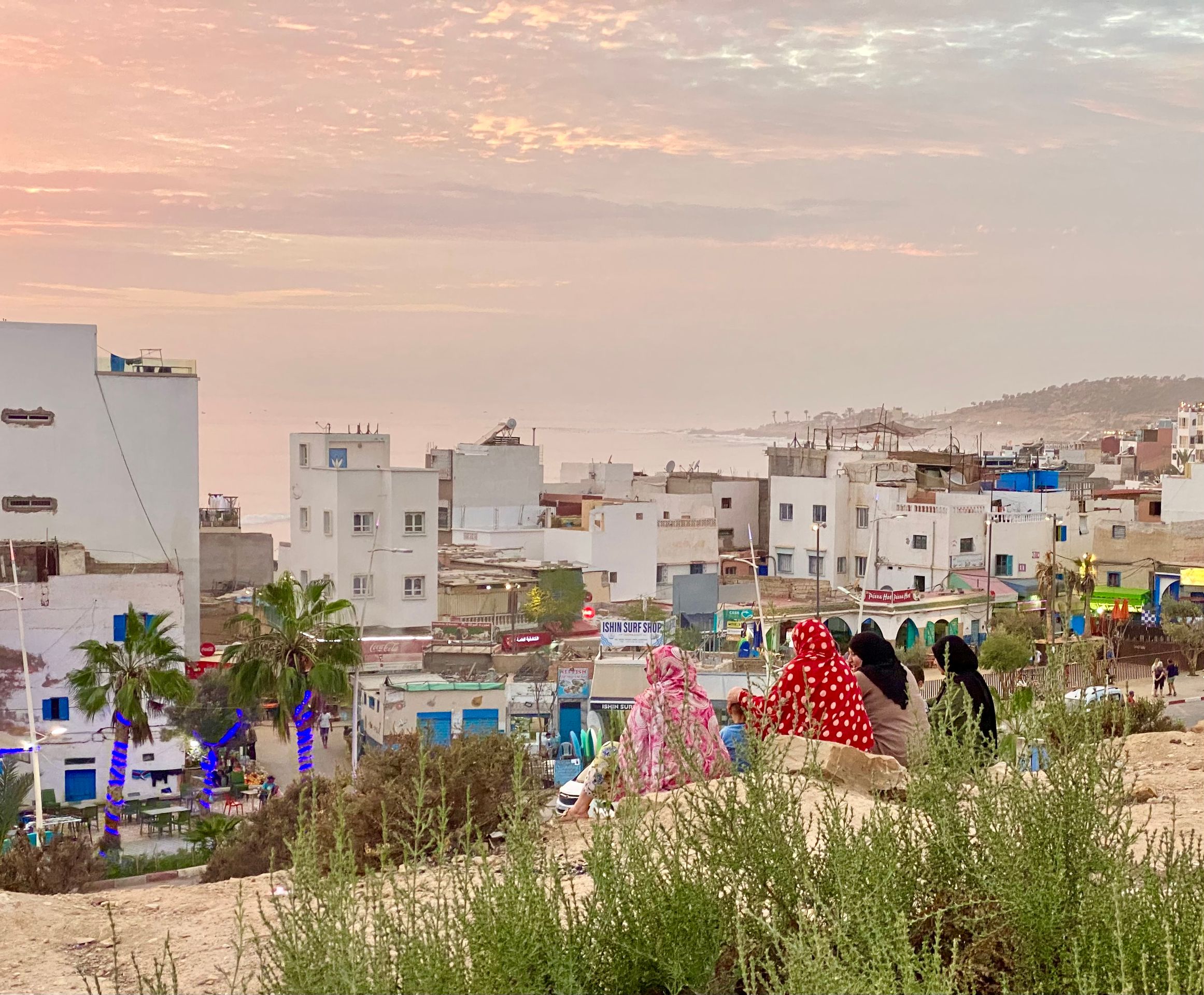ein und brechen dann mittags in Richtung Taghazoute auf. Eine wunderschöne, kaum befahrene Strecke führt durch den Anti-Atlas in Richtung Nordwesten auf Agadir zu. Wir können uns gar nicht sattsehen an diesem beeindruckenden Bergpanorama. Für die rund 180 km benötigen wir knapp 4 Stunden, durchschnittlich mehr als 50 km pro Stunde sind auf marokkanischen Landstraßen nicht erreichbar. Gegen Abend erreichen wir Taghazoute, die letzte Surferhochburg auf unserem Zettel. Etwas oberhalb der Stadt gibt einen Parkplatz mit Blick auf den Atlantik , auf dem man mit dem Wohnmobil übernachten kann. Chef ist hier Mohammed, der für "offiziellen" Dienste als Parkwächter 30 DH einfordert. Aber Mohammed ist nett und wir unterhalten uns noch eine Weile mit ihm. Der Nachtwächter des Parkplatzes schläft nachts in einer Konstruktion, die eher wie eine Hundehütte aussieht. Abends gehen wir noch einmal ans Meer und in die Stadt runter, die sich im Dämmerlicht mit ihren vielen Surfercafes und Restaurants am Strand ganz hübsch präsentiert.