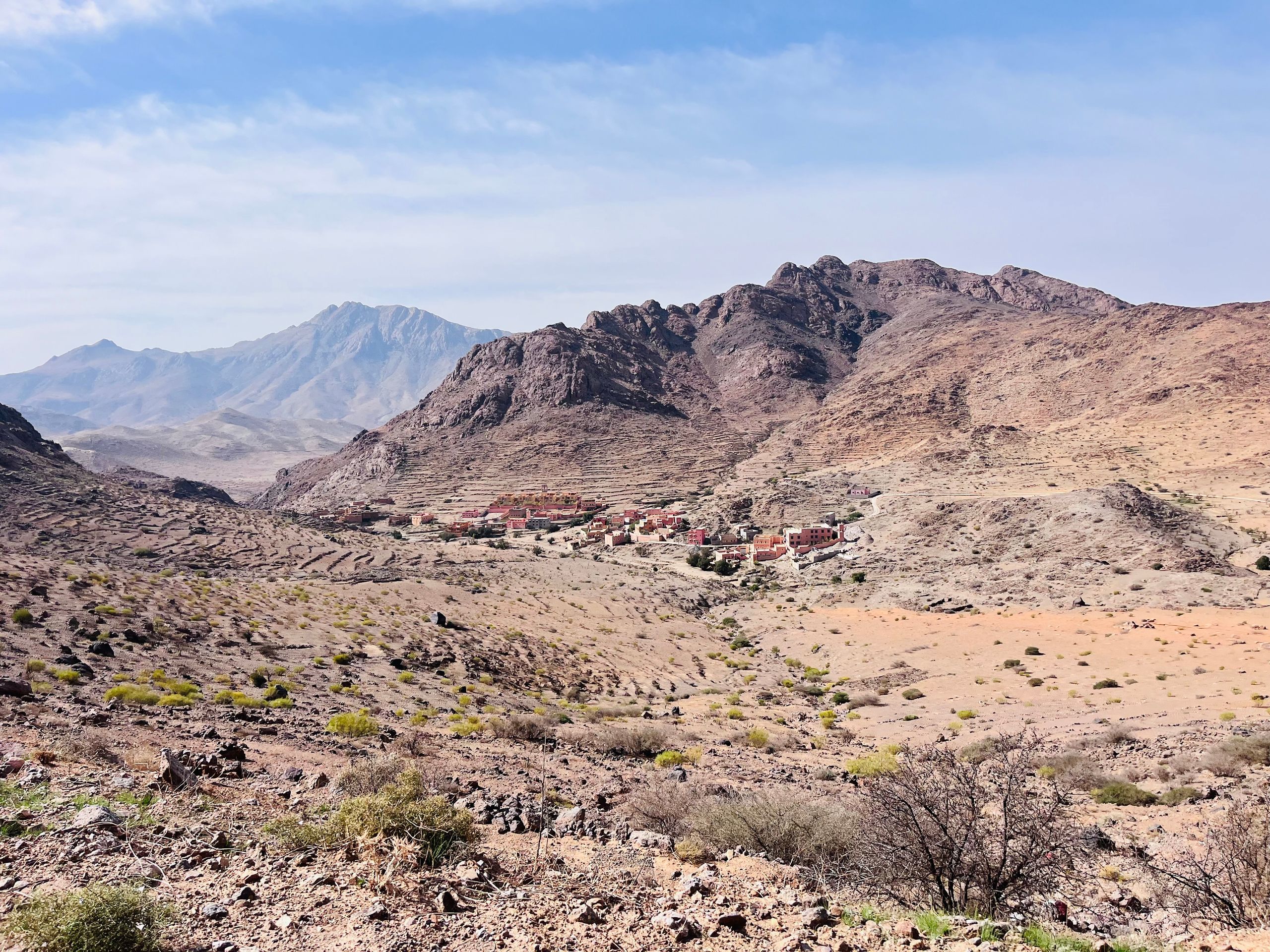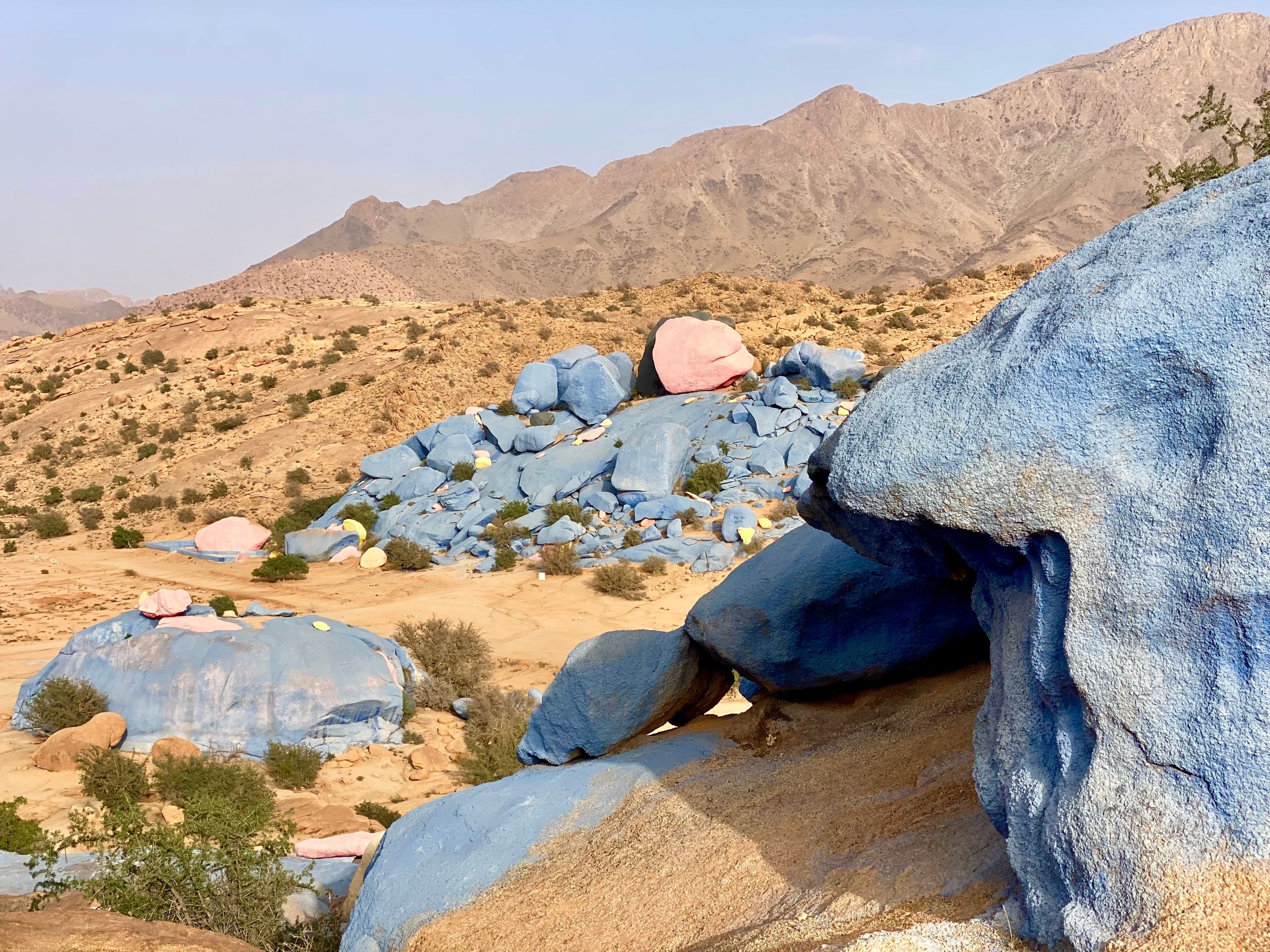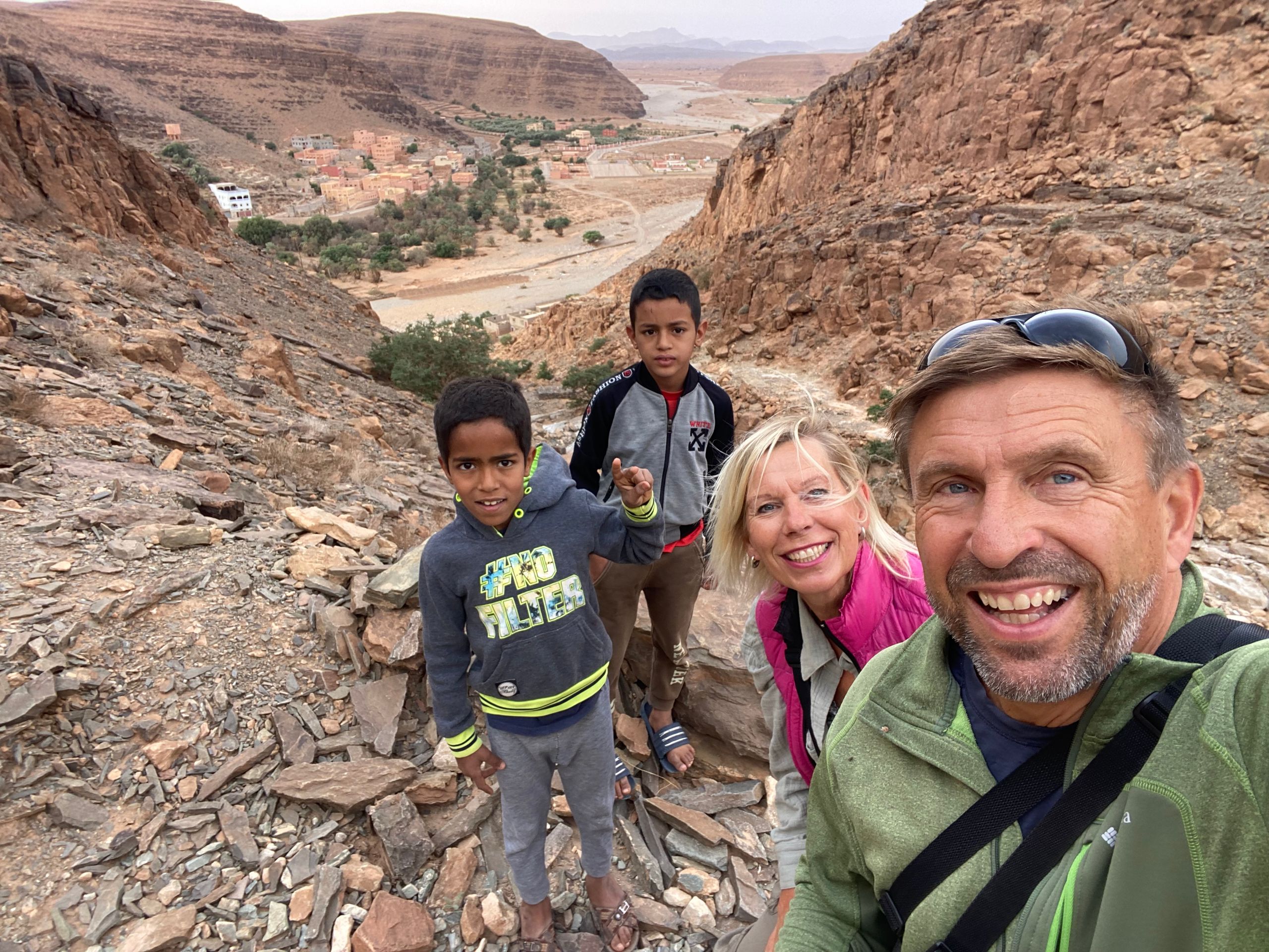 Nachdem wir am Vortag durch die Amtoudi Schlucht gewandert sind, wollen wir heute einen der Agadire besichtigen. Agadire sind antike Speicherfestungen auf Bergen, in denen früher Nahrung vor Feinden geschützt aufbewahrt wurde. Bei Angriffen haben sich dort auch die Dorfbewohner versteckt. Zwei kleine Jungs aus dem Dorf führen uns den steilen Pfad hinauf. Wir beide tragen Bergstiefel und Wanderstöcke, die beiden Jungs nur abgewetzte Sandalen. Oben auf dem Agadir empfängt uns ein alter Berber und gibt uns eine Privatführung durch den Agadir. Unter anderem wurde dort viel Honig gelagert. Es gibt im Agadir auch ein kleines Museum mit antiken Gegenständen aus dem Agadir. Unter anderem Koranverse auf Palmenholz geschrieben und eine uralte Muskete. Vor dem Agadir warten die beiden Jungs auf uns (sie durften nicht mit rein) und führen uns wieder ins Tal. Dafür bekommen sie eine kleine Belohnung in Form von Bonbons und Kugelschreibern.Ein unter Vanlifern hochgelobtes Reiseziel steht noch aus: Tafraoute! Tafraoute ist eine Kleinstadt im westlichen Anti-Atlas, die sich in einem imposanten Talkessel aus Granitfelsen befindet. Kurz vor Tafraoute befinden sich die "Blauen Steine". Ein belgischer Künstler hat 1984 von der Erosion rundgeschliffene Granitblöcke mit vielen Tonnen zumeist blauer Farbe bemalt. Das Kunstwerk ist unstritten, wir finden es gut und für Betty ist es eine fotogene Kulisse. Auf der Suche nach einem CP haben wir mal wieder ein für Marokko leider typisches Erlebnis: Wir halten an der Straße mit den meisten CP kurz an, um uns zu orientieren. Sofort stoppt neben uns ein Mofafahrer, der uns in gutem Deutsch inbrünstig "seinen" CP anpreist. In der Tat sehen die Bewertungen im Netz für diesen Platz wirklich gut aus und wir wir folgen seinem Rat, obwohl er uns etwas zu aufdringlich erscheint. Er zischt auf seiner Mofa von dannen und wir machen uns auf den Weg zum CP. Kurz vor dem nächsten Kreisel etwas außerhalb von Tafraoute überholt uns ein Mann im Geländewagen und hält gestikulierend an, so dass der Kreisel fast blockiert ist: Wir könnten nicht auf den CP, den uns der Mofafahrer empfohlen hätte, der hätte ein Problem mit der Wasserversorgung, redet der Fahrer heftig auf uns ein. Stattdessen sollten wir hier rechts abbiegen und ihm folgen. Auf so etwas haben wir nun so gar keine Lust! Ich gebe Gas, umkurve die "Strassensperre" und wir zischen ab. Zurück in der Stadt gehen wir auf den kleinen, örtlichen, netten CP und sind stinksauer über das Geschehene. Ob die beiden jetzt Konkurrenten oder Komplizen waren, keine Ahnung, verschiedenste Szenarien sind denkbar. Wir gehen abends noch in Tafraoute essen, Stimmung mag aber nicht aufkommen.
